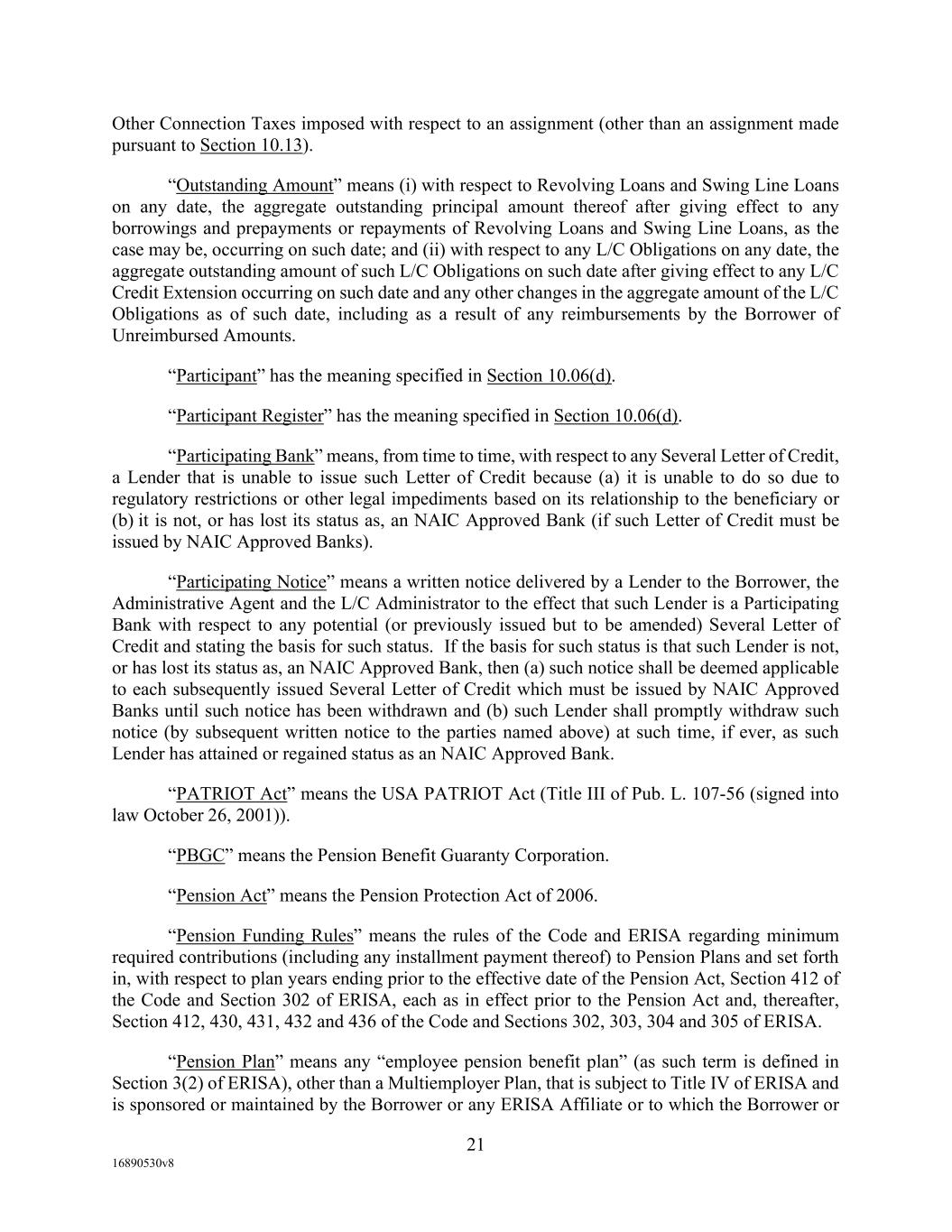 16890530v8 21 Other Connection Taxes imposed with respect to an assignment (other than an assignment made pursuant to Section 10.13). “Outstanding Amount” means (i) with respect to Revolving Loans and Swing Line Loans on any date, the aggregate outstanding principal amount thereof after giving effect to any borrowings and prepayments or repayments of Revolving Loans and Swing Line Loans, as the case may be, occurring on such date; and (ii) with respect to any L/C Obligations on any date, the aggregate outstanding amount of such L/C Obligations on such date after giving effect to any L/C Credit Extension occurring on such date and any other changes in the aggregate amount of the L/C Obligations as of such date, including as a result of any reimbursements by the Borrower of Unreimbursed Amounts. “Participant” has the meaning specified in Section 10.06(d). “Participant Register” has the meaning specified in Section 10.06(d). “Participating Bank” means, from time to time, with respect to any Several Letter of Credit, a Lender that is unable to issue such Letter of Credit because (a) it is unable to do so due to regulatory restrictions or other legal impediments based on its relationship to the beneficiary or (b) it is not, or has lost its status as, an NAIC Approved Bank (if such Letter of Credit must be issued by NAIC Approved Banks). “Participating Notice” means a written notice delivered by a Lender to the Borrower, the Administrative Agent and the L/C Administrator to the effect that such Lender is a Participating Bank with respect to any potential (or previously issued but to be amended) Several Letter of Credit and stating the basis for such status. If the basis for such status is that such Lender is not, or has lost its status as, an NAIC Approved Bank, then (a) such notice shall be deemed applicable to each subsequently issued Several Letter of Credit which must be issued by NAIC Approved Banks until such notice has been withdrawn and (b) such Lender shall promptly withdraw such notice (by subsequent written notice to the parties named above) at such time, if ever, as such Lender has attained or regained status as an NAIC Approved Bank. “PATRIOT Act” means the USA PATRIOT Act (Title III of Pub. L. 107-56 (signed into law October 26, 2001)). “PBGC” means the Pension Benefit Guaranty Corporation. “Pension Act” means the Pension Protection Act of 2006. “Pension Funding Rules” means the rules of the Code and ERISA regarding minimum required contributions (including any installment payment thereof) to Pension Plans and set forth in, with respect to plan years ending prior to the effective date of the Pension Act, Section 412 of the Code and Section 302 of ERISA, each as in effect prior to the Pension Act and, thereafter, Section 412, 430, 431, 432 and 436 of the Code and Sections 302, 303, 304 and 305 of ERISA. “Pension Plan” means any “employee pension benefit plan” (as such term is defined in Section 3(2) of ERISA), other than a Multiemployer Plan, that is subject to Title IV of ERISA and is sponsored or maintained by the Borrower or any ERISA Affiliate or to which the Borrower or