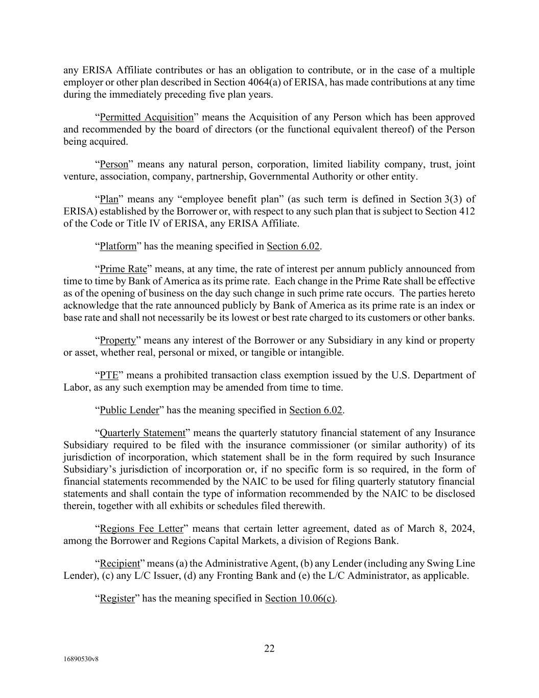 16890530v8 22 any ERISA Affiliate contributes or has an obligation to contribute, or in the case of a multiple employer or other plan described in Section 4064(a) of ERISA, has made contributions at any time during the immediately preceding five plan years. “Permitted Acquisition” means the Acquisition of any Person which has been approved and recommended by the board of directors (or the functional equivalent thereof) of the Person being acquired. “Person” means any natural person, corporation, limited liability company, trust, joint venture, association, company, partnership, Governmental Authority or other entity. “Plan” means any “employee benefit plan” (as such term is defined in Section 3(3) of ERISA) established by the Borrower or, with respect to any such plan that is subject to Section 412 of the Code or Title IV of ERISA, any ERISA Affiliate. “Platform” has the meaning specified in Section 6.02. “Prime Rate” means, at any time, the rate of interest per annum publicly announced from time to time by Bank of America as its prime rate. Each change in the Prime Rate shall be effective as of the opening of business on the day such change in such prime rate occurs. The parties hereto acknowledge that the rate announced publicly by Bank of America as its prime rate is an index or base rate and shall not necessarily be its lowest or best rate charged to its customers or other banks. “Property” means any interest of the Borrower or any Subsidiary in any kind or property or asset, whether real, personal or mixed, or tangible or intangible. “PTE” means a prohibited transaction class exemption issued by the U.S. Department of Labor, as any such exemption may be amended from time to time. “Public Lender” has the meaning specified in Section 6.02. “Quarterly Statement” means the quarterly statutory financial statement of any Insurance Subsidiary required to be filed with the insurance commissioner (or similar authority) of its jurisdiction of incorporation, which statement shall be in the form required by such Insurance Subsidiary’s jurisdiction of incorporation or, if no specific form is so required, in the form of financial statements recommended by the NAIC to be used for filing quarterly statutory financial statements and shall contain the type of information recommended by the NAIC to be disclosed therein, together with all exhibits or schedules filed therewith. “Regions Fee Letter” means that certain letter agreement, dated as of March 8, 2024, among the Borrower and Regions Capital Markets, a division of Regions Bank. “Recipient” means (a) the Administrative Agent, (b) any Lender (including any Swing Line Lender), (c) any L/C Issuer, (d) any Fronting Bank and (e) the L/C Administrator, as applicable. “Register” has the meaning specified in Section 10.06(c).