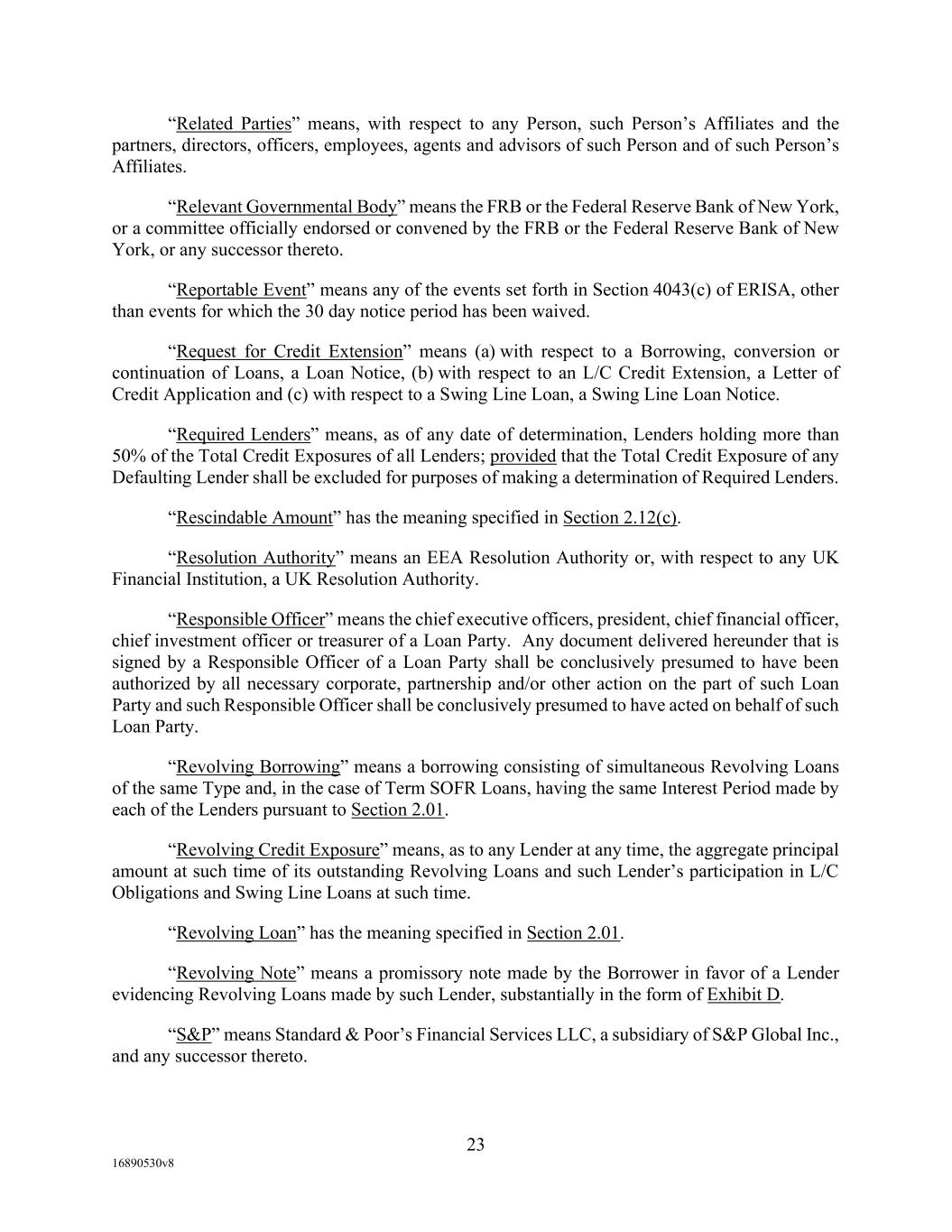16890530v8 23 “Related Parties” means, with respect to any Person, such Person’s Affiliates and the partners, directors, officers, employees, agents and advisors of such Person and of such Person’s Affiliates. “Relevant Governmental Body” means the FRB or the Federal Reserve Bank of New York, or a committee officially endorsed or convened by the FRB or the Federal Reserve Bank of New York, or any successor thereto. “Reportable Event” means any of the events set forth in Section 4043(c) of ERISA, other than events for which the 30 day notice period has been waived. “Request for Credit Extension” means (a) with respect to a Borrowing, conversion or continuation of Loans, a Loan Notice, (b) with respect to an L/C Credit Extension, a Letter of Credit Application and (c) with respect to a Swing Line Loan, a Swing Line Loan Notice. “Required Lenders” means, as of any date of determination, Lenders holding more than 50% of the Total Credit Exposures of all Lenders; provided that the Total Credit Exposure of any Defaulting Lender shall be excluded for purposes of making a determination of Required Lenders. “Rescindable Amount” has the meaning specified in Section 2.12(c). “Resolution Authority” means an EEA Resolution Authority or, with respect to any UK Financial Institution, a UK Resolution Authority. “Responsible Officer” means the chief executive officers, president, chief financial officer, chief investment officer or treasurer of a Loan Party. Any document delivered hereunder that is signed by a Responsible Officer of a Loan Party shall be conclusively presumed to have been authorized by all necessary corporate, partnership and/or other action on the part of such Loan Party and such Responsible Officer shall be conclusively presumed to have acted on behalf of such Loan Party. “Revolving Borrowing” means a borrowing consisting of simultaneous Revolving Loans of the same Type and, in the case of Term SOFR Loans, having the same Interest Period made by each of the Lenders pursuant to Section 2.01. “Revolving Credit Exposure” means, as to any Lender at any time, the aggregate principal amount at such time of its outstanding Revolving Loans and such Lender’s participation in L/C Obligations and Swing Line Loans at such time. “Revolving Loan” has the meaning specified in Section 2.01. “Revolving Note” means a promissory note made by the Borrower in favor of a Lender evidencing Revolving Loans made by such Lender, substantially in the form of Exhibit D. “S&P” means Standard & Poor’s Financial Services LLC, a subsidiary of S&P Global Inc., and any successor thereto.