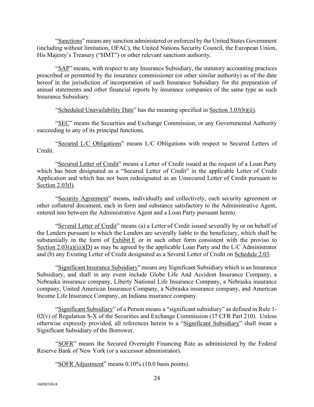 16890530v8 24 “Sanctions” means any sanction administered or enforced by the United States Government (including without limitation, OFAC), the United Nations Security Council, the European Union, His Majesty’s Treasury (“HMT”) or other relevant sanctions authority. “SAP” means, with respect to any Insurance Subsidiary, the statutory accounting practices prescribed or permitted by the insurance commissioner (or other similar authority) as of the date hereof in the jurisdiction of incorporation of such Insurance Subsidiary for the preparation of annual statements and other financial reports by insurance companies of the same type as such Insurance Subsidiary. “Scheduled Unavailability Date” has the meaning specified in Section 3.03(b)(ii). “SEC” means the Securities and Exchange Commission, or any Governmental Authority succeeding to any of its principal functions. “Secured L/C Obligations” means L/C Obligations with respect to Secured Letters of Credit. “Secured Letter of Credit” means a Letter of Credit issued at the request of a Loan Party which has been designated as a “Secured Letter of Credit” in the applicable Letter of Credit Application and which has not been redesignated as an Unsecured Letter of Credit pursuant to Section 2.03(l). “Security Agreement” means, individually and collectively, each security agreement or other collateral document, each in form and substance satisfactory to the Administrative Agent, entered into between the Administrative Agent and a Loan Party pursuant hereto. “Several Letter of Credit” means (a) a Letter of Credit issued severally by or on behalf of the Lenders pursuant to which the Lenders are severally liable to the beneficiary, which shall be substantially in the form of Exhibit E or in such other form consistent with the proviso to Section 2.03(a)(iii)(D) as may be agreed by the applicable Loan Party and the L/C Administrator and (b) any Existing Letter of Credit designated as a Several Letter of Credit on Schedule 2.03. “Significant Insurance Subsidiary” means any Significant Subsidiary which is an Insurance Subsidiary, and shall in any event include Globe Life And Accident Insurance Company, a Nebraska insurance company, Liberty National Life Insurance Company, a Nebraska insurance company, United American Insurance Company, a Nebraska insurance company, and American Income Life Insurance Company, an Indiana insurance company. “Significant Subsidiary” of a Person means a “significant subsidiary” as defined in Rule 1- 02(v) of Regulation S-X of the Securities and Exchange Commission (17 CFR Part 210). Unless otherwise expressly provided, all references herein to a “Significant Subsidiary” shall mean a Significant Subsidiary of the Borrower. “SOFR” means the Secured Overnight Financing Rate as administered by the Federal Reserve Bank of New York (or a successor administrator). “SOFR Adjustment” means 0.10% (10.0 basis points).