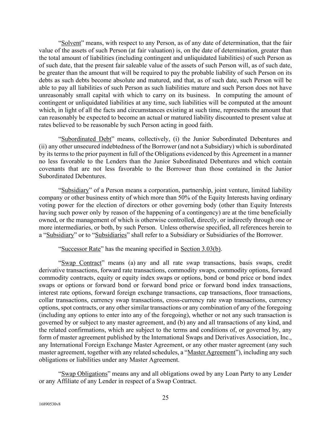 16890530v8 25 “Solvent” means, with respect to any Person, as of any date of determination, that the fair value of the assets of such Person (at fair valuation) is, on the date of determination, greater than the total amount of liabilities (including contingent and unliquidated liabilities) of such Person as of such date, that the present fair saleable value of the assets of such Person will, as of such date, be greater than the amount that will be required to pay the probable liability of such Person on its debts as such debts become absolute and matured, and that, as of such date, such Person will be able to pay all liabilities of such Person as such liabilities mature and such Person does not have unreasonably small capital with which to carry on its business. In computing the amount of contingent or unliquidated liabilities at any time, such liabilities will be computed at the amount which, in light of all the facts and circumstances existing at such time, represents the amount that can reasonably be expected to become an actual or matured liability discounted to present value at rates believed to be reasonable by such Person acting in good faith. “Subordinated Debt” means, collectively, (i) the Junior Subordinated Debentures and (ii) any other unsecured indebtedness of the Borrower (and not a Subsidiary) which is subordinated by its terms to the prior payment in full of the Obligations evidenced by this Agreement in a manner no less favorable to the Lenders than the Junior Subordinated Debentures and which contain covenants that are not less favorable to the Borrower than those contained in the Junior Subordinated Debentures. “Subsidiary” of a Person means a corporation, partnership, joint venture, limited liability company or other business entity of which more than 50% of the Equity Interests having ordinary voting power for the election of directors or other governing body (other than Equity Interests having such power only by reason of the happening of a contingency) are at the time beneficially owned, or the management of which is otherwise controlled, directly, or indirectly through one or more intermediaries, or both, by such Person. Unless otherwise specified, all references herein to a “Subsidiary” or to “Subsidiaries” shall refer to a Subsidiary or Subsidiaries of the Borrower. “Successor Rate” has the meaning specified in Section 3.03(b). “Swap Contract” means (a) any and all rate swap transactions, basis swaps, credit derivative transactions, forward rate transactions, commodity swaps, commodity options, forward commodity contracts, equity or equity index swaps or options, bond or bond price or bond index swaps or options or forward bond or forward bond price or forward bond index transactions, interest rate options, forward foreign exchange transactions, cap transactions, floor transactions, collar transactions, currency swap transactions, cross-currency rate swap transactions, currency options, spot contracts, or any other similar transactions or any combination of any of the foregoing (including any options to enter into any of the foregoing), whether or not any such transaction is governed by or subject to any master agreement, and (b) any and all transactions of any kind, and the related confirmations, which are subject to the terms and conditions of, or governed by, any form of master agreement published by the International Swaps and Derivatives Association, Inc., any International Foreign Exchange Master Agreement, or any other master agreement (any such master agreement, together with any related schedules, a “Master Agreement”), including any such obligations or liabilities under any Master Agreement. “Swap Obligations” means any and all obligations owed by any Loan Party to any Lender or any Affiliate of any Lender in respect of a Swap Contract.