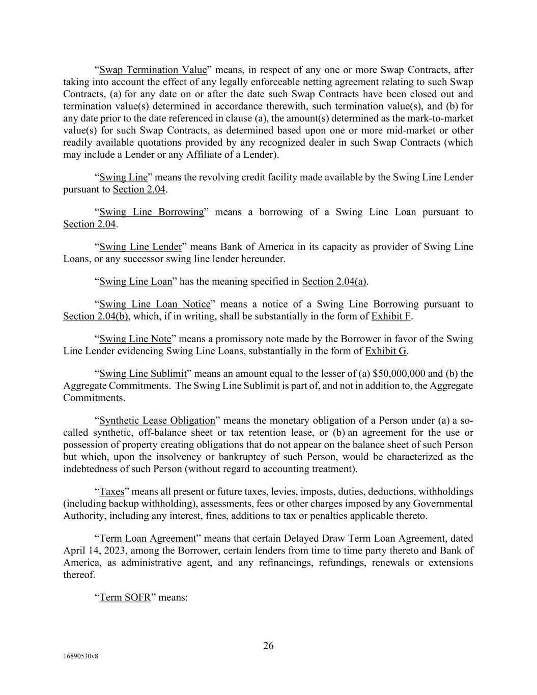 16890530v8 26 “Swap Termination Value” means, in respect of any one or more Swap Contracts, after taking into account the effect of any legally enforceable netting agreement relating to such Swap Contracts, (a) for any date on or after the date such Swap Contracts have been closed out and termination value(s) determined in accordance therewith, such termination value(s), and (b) for any date prior to the date referenced in clause (a), the amount(s) determined as the mark-to-market value(s) for such Swap Contracts, as determined based upon one or more mid-market or other readily available quotations provided by any recognized dealer in such Swap Contracts (which may include a Lender or any Affiliate of a Lender). “Swing Line” means the revolving credit facility made available by the Swing Line Lender pursuant to Section 2.04. “Swing Line Borrowing” means a borrowing of a Swing Line Loan pursuant to Section 2.04. “Swing Line Lender” means Bank of America in its capacity as provider of Swing Line Loans, or any successor swing line lender hereunder. “Swing Line Loan” has the meaning specified in Section 2.04(a). “Swing Line Loan Notice” means a notice of a Swing Line Borrowing pursuant to Section 2.04(b), which, if in writing, shall be substantially in the form of Exhibit F. “Swing Line Note” means a promissory note made by the Borrower in favor of the Swing Line Lender evidencing Swing Line Loans, substantially in the form of Exhibit G. “Swing Line Sublimit” means an amount equal to the lesser of (a) $50,000,000 and (b) the Aggregate Commitments. The Swing Line Sublimit is part of, and not in addition to, the Aggregate Commitments. “Synthetic Lease Obligation” means the monetary obligation of a Person under (a) a so- called synthetic, off-balance sheet or tax retention lease, or (b) an agreement for the use or possession of property creating obligations that do not appear on the balance sheet of such Person but which, upon the insolvency or bankruptcy of such Person, would be characterized as the indebtedness of such Person (without regard to accounting treatment). “Taxes” means all present or future taxes, levies, imposts, duties, deductions, withholdings (including backup withholding), assessments, fees or other charges imposed by any Governmental Authority, including any interest, fines, additions to tax or penalties applicable thereto. “Term Loan Agreement” means that certain Delayed Draw Term Loan Agreement, dated April 14, 2023, among the Borrower, certain lenders from time to time party thereto and Bank of America, as administrative agent, and any refinancings, refundings, renewals or extensions thereof. “Term SOFR” means: