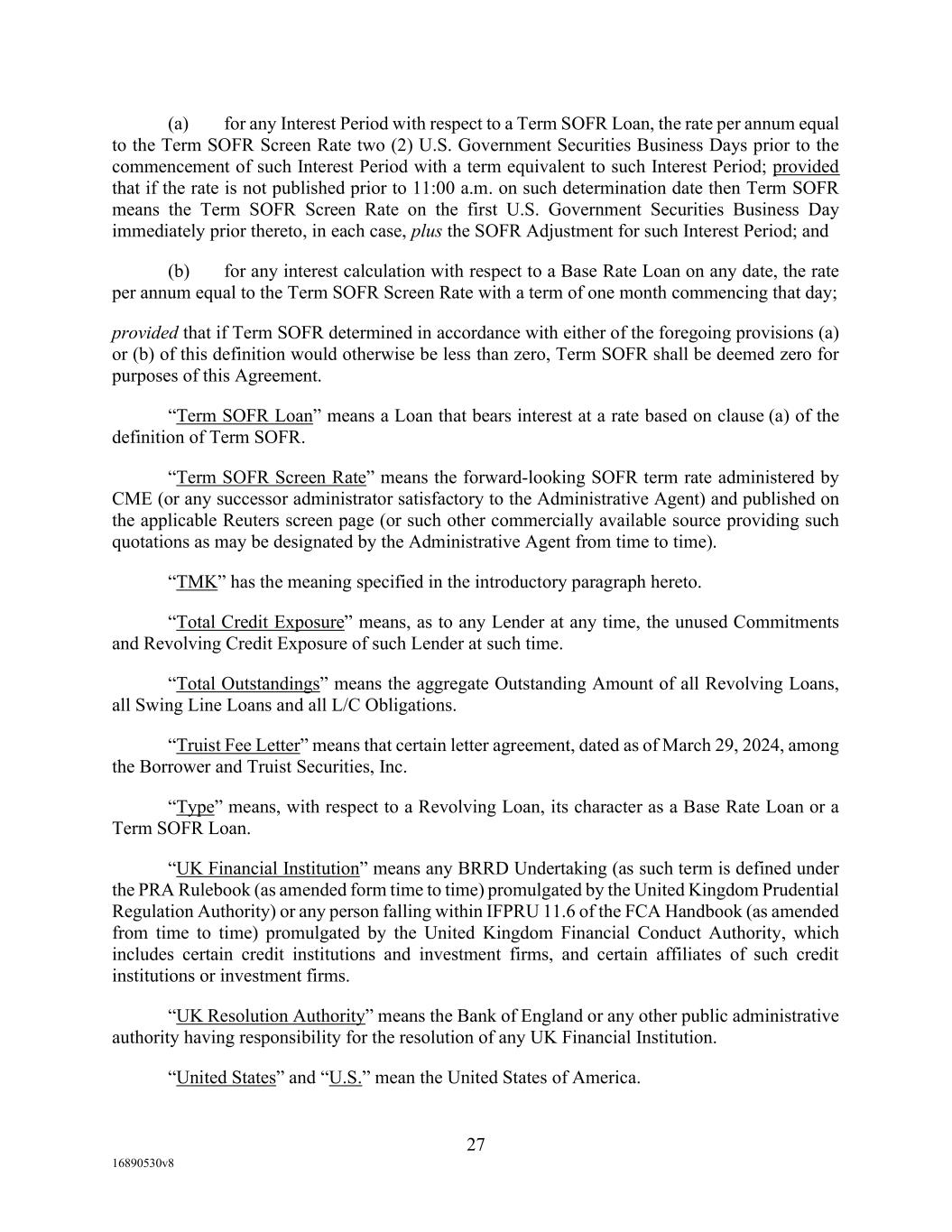 16890530v8 27 (a) for any Interest Period with respect to a Term SOFR Loan, the rate per annum equal to the Term SOFR Screen Rate two (2) U.S. Government Securities Business Days prior to the commencement of such Interest Period with a term equivalent to such Interest Period; provided that if the rate is not published prior to 11:00 a.m. on such determination date then Term SOFR means the Term SOFR Screen Rate on the first U.S. Government Securities Business Day immediately prior thereto, in each case, plus the SOFR Adjustment for such Interest Period; and (b) for any interest calculation with respect to a Base Rate Loan on any date, the rate per annum equal to the Term SOFR Screen Rate with a term of one month commencing that day; provided that if Term SOFR determined in accordance with either of the foregoing provisions (a) or (b) of this definition would otherwise be less than zero, Term SOFR shall be deemed zero for purposes of this Agreement. “Term SOFR Loan” means a Loan that bears interest at a rate based on clause (a) of the definition of Term SOFR. “Term SOFR Screen Rate” means the forward-looking SOFR term rate administered by CME (or any successor administrator satisfactory to the Administrative Agent) and published on the applicable Reuters screen page (or such other commercially available source providing such quotations as may be designated by the Administrative Agent from time to time). “TMK” has the meaning specified in the introductory paragraph hereto. “Total Credit Exposure” means, as to any Lender at any time, the unused Commitments and Revolving Credit Exposure of such Lender at such time. “Total Outstandings” means the aggregate Outstanding Amount of all Revolving Loans, all Swing Line Loans and all L/C Obligations. “Truist Fee Letter” means that certain letter agreement, dated as of March 29, 2024, among the Borrower and Truist Securities, Inc. “Type” means, with respect to a Revolving Loan, its character as a Base Rate Loan or a Term SOFR Loan. “UK Financial Institution” means any BRRD Undertaking (as such term is defined under the PRA Rulebook (as amended form time to time) promulgated by the United Kingdom Prudential Regulation Authority) or any person falling within IFPRU 11.6 of the FCA Handbook (as amended from time to time) promulgated by the United Kingdom Financial Conduct Authority, which includes certain credit institutions and investment firms, and certain affiliates of such credit institutions or investment firms. “UK Resolution Authority” means the Bank of England or any other public administrative authority having responsibility for the resolution of any UK Financial Institution. “United States” and “U.S.” mean the United States of America.