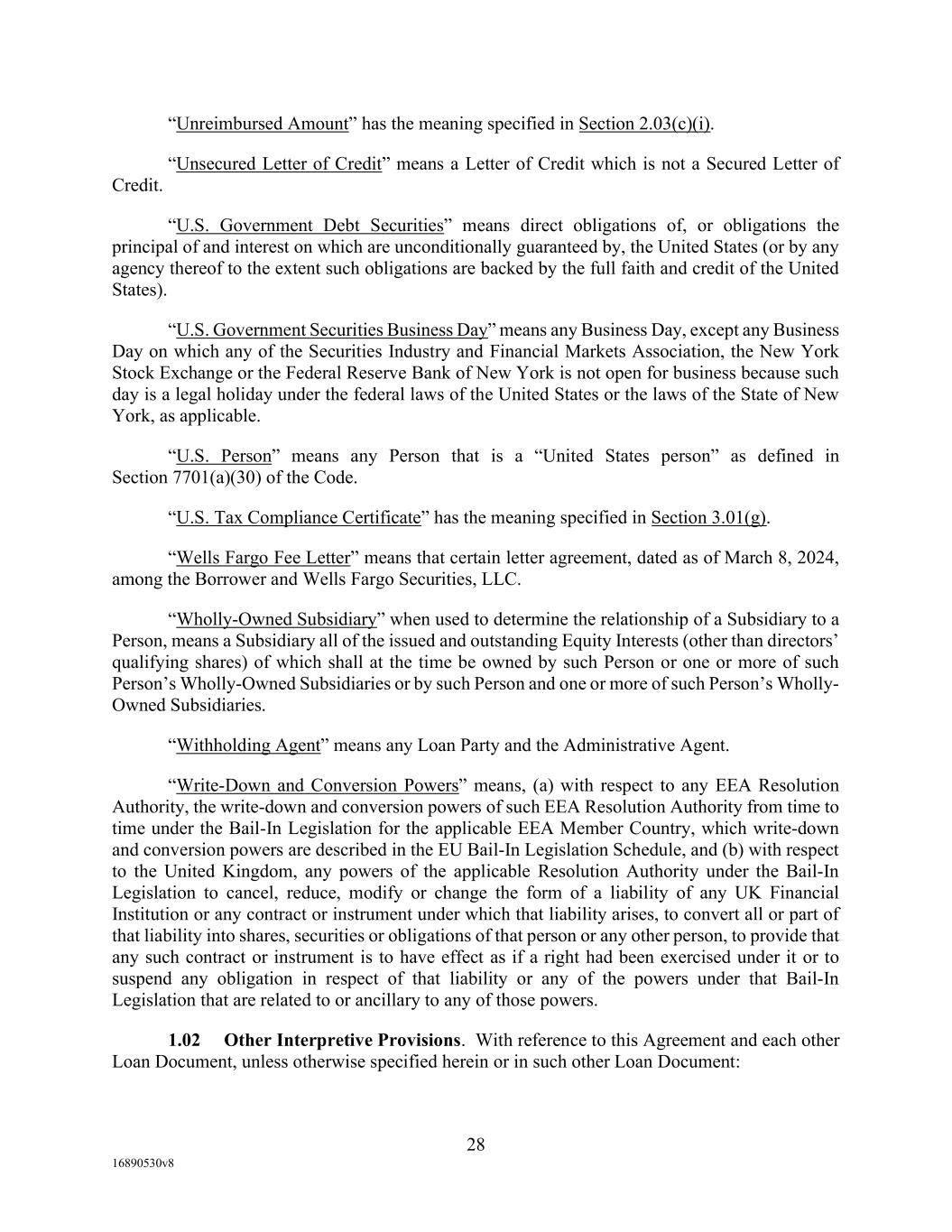 16890530v8 28 “Unreimbursed Amount” has the meaning specified in Section 2.03(c)(i). “Unsecured Letter of Credit” means a Letter of Credit which is not a Secured Letter of Credit. “U.S. Government Debt Securities” means direct obligations of, or obligations the principal of and interest on which are unconditionally guaranteed by, the United States (or by any agency thereof to the extent such obligations are backed by the full faith and credit of the United States). “U.S. Government Securities Business Day” means any Business Day, except any Business Day on which any of the Securities Industry and Financial Markets Association, the New York Stock Exchange or the Federal Reserve Bank of New York is not open for business because such day is a legal holiday under the federal laws of the United States or the laws of the State of New York, as applicable. “U.S. Person” means any Person that is a “United States person” as defined in Section 7701(a)(30) of the Code. “U.S. Tax Compliance Certificate” has the meaning specified in Section 3.01(g). “Wells Fargo Fee Letter” means that certain letter agreement, dated as of March 8, 2024, among the Borrower and Wells Fargo Securities, LLC. “Wholly-Owned Subsidiary” when used to determine the relationship of a Subsidiary to a Person, means a Subsidiary all of the issued and outstanding Equity Interests (other than directors’ qualifying shares) of which shall at the time be owned by such Person or one or more of such Person’s Wholly-Owned Subsidiaries or by such Person and one or more of such Person’s Wholly- Owned Subsidiaries. “Withholding Agent” means any Loan Party and the Administrative Agent. “Write-Down and Conversion Powers” means, (a) with respect to any EEA Resolution Authority, the write-down and conversion powers of such EEA Resolution Authority from time to time under the Bail-In Legislation for the applicable EEA Member Country, which write-down and conversion powers are described in the EU Bail-In Legislation Schedule, and (b) with respect to the United Kingdom, any powers of the applicable Resolution Authority under the Bail-In Legislation to cancel, reduce, modify or change the form of a liability of any UK Financial Institution or any contract or instrument under which that liability arises, to convert all or part of that liability into shares, securities or obligations of that person or any other person, to provide that any such contract or instrument is to have effect as if a right had been exercised under it or to suspend any obligation in respect of that liability or any of the powers under that Bail-In Legislation that are related to or ancillary to any of those powers. 1.02 Other Interpretive Provisions. With reference to this Agreement and each other Loan Document, unless otherwise specified herein or in such other Loan Document: