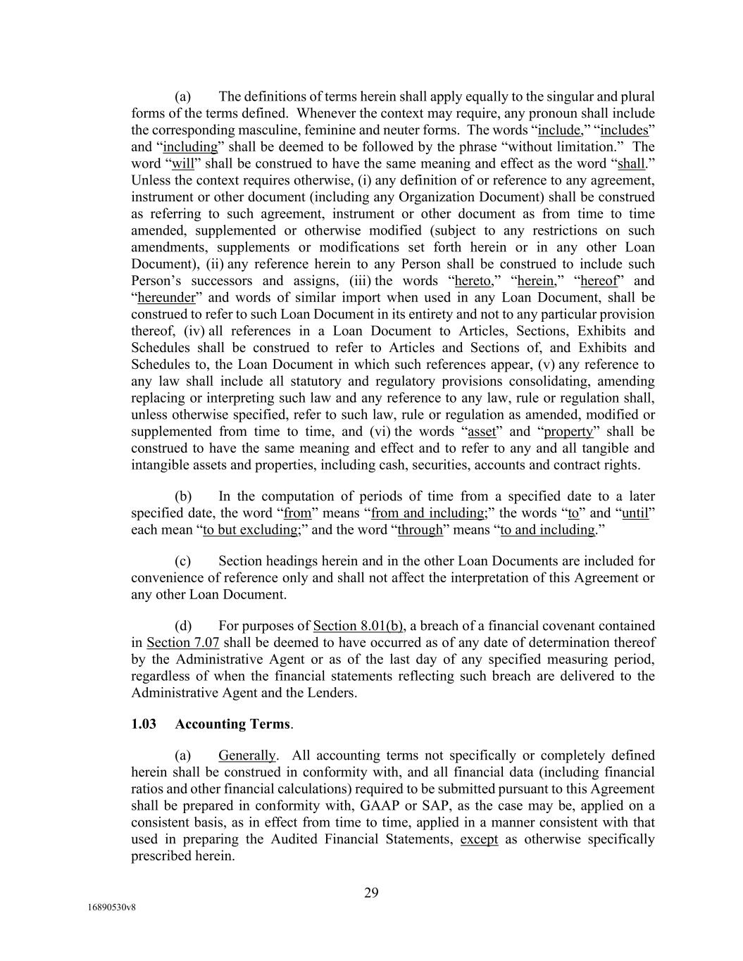 16890530v8 29 (a) The definitions of terms herein shall apply equally to the singular and plural forms of the terms defined. Whenever the context may require, any pronoun shall include the corresponding masculine, feminine and neuter forms. The words “include,” “includes” and “including” shall be deemed to be followed by the phrase “without limitation.” The word “will” shall be construed to have the same meaning and effect as the word “shall.” Unless the context requires otherwise, (i) any definition of or reference to any agreement, instrument or other document (including any Organization Document) shall be construed as referring to such agreement, instrument or other document as from time to time amended, supplemented or otherwise modified (subject to any restrictions on such amendments, supplements or modifications set forth herein or in any other Loan Document), (ii) any reference herein to any Person shall be construed to include such Person’s successors and assigns, (iii) the words “hereto,” “herein,” “hereof” and “hereunder” and words of similar import when used in any Loan Document, shall be construed to refer to such Loan Document in its entirety and not to any particular provision thereof, (iv) all references in a Loan Document to Articles, Sections, Exhibits and Schedules shall be construed to refer to Articles and Sections of, and Exhibits and Schedules to, the Loan Document in which such references appear, (v) any reference to any law shall include all statutory and regulatory provisions consolidating, amending replacing or interpreting such law and any reference to any law, rule or regulation shall, unless otherwise specified, refer to such law, rule or regulation as amended, modified or supplemented from time to time, and (vi) the words “asset” and “property” shall be construed to have the same meaning and effect and to refer to any and all tangible and intangible assets and properties, including cash, securities, accounts and contract rights. (b) In the computation of periods of time from a specified date to a later specified date, the word “from” means “from and including;” the words “to” and “until” each mean “to but excluding;” and the word “through” means “to and including.” (c) Section headings herein and in the other Loan Documents are included for convenience of reference only and shall not affect the interpretation of this Agreement or any other Loan Document. (d) For purposes of Section 8.01(b), a breach of a financial covenant contained in Section 7.07 shall be deemed to have occurred as of any date of determination thereof by the Administrative Agent or as of the last day of any specified measuring period, regardless of when the financial statements reflecting such breach are delivered to the Administrative Agent and the Lenders. 1.03 Accounting Terms. (a) Generally. All accounting terms not specifically or completely defined herein shall be construed in conformity with, and all financial data (including financial ratios and other financial calculations) required to be submitted pursuant to this Agreement shall be prepared in conformity with, GAAP or SAP, as the case may be, applied on a consistent basis, as in effect from time to time, applied in a manner consistent with that used in preparing the Audited Financial Statements, except as otherwise specifically prescribed herein.
