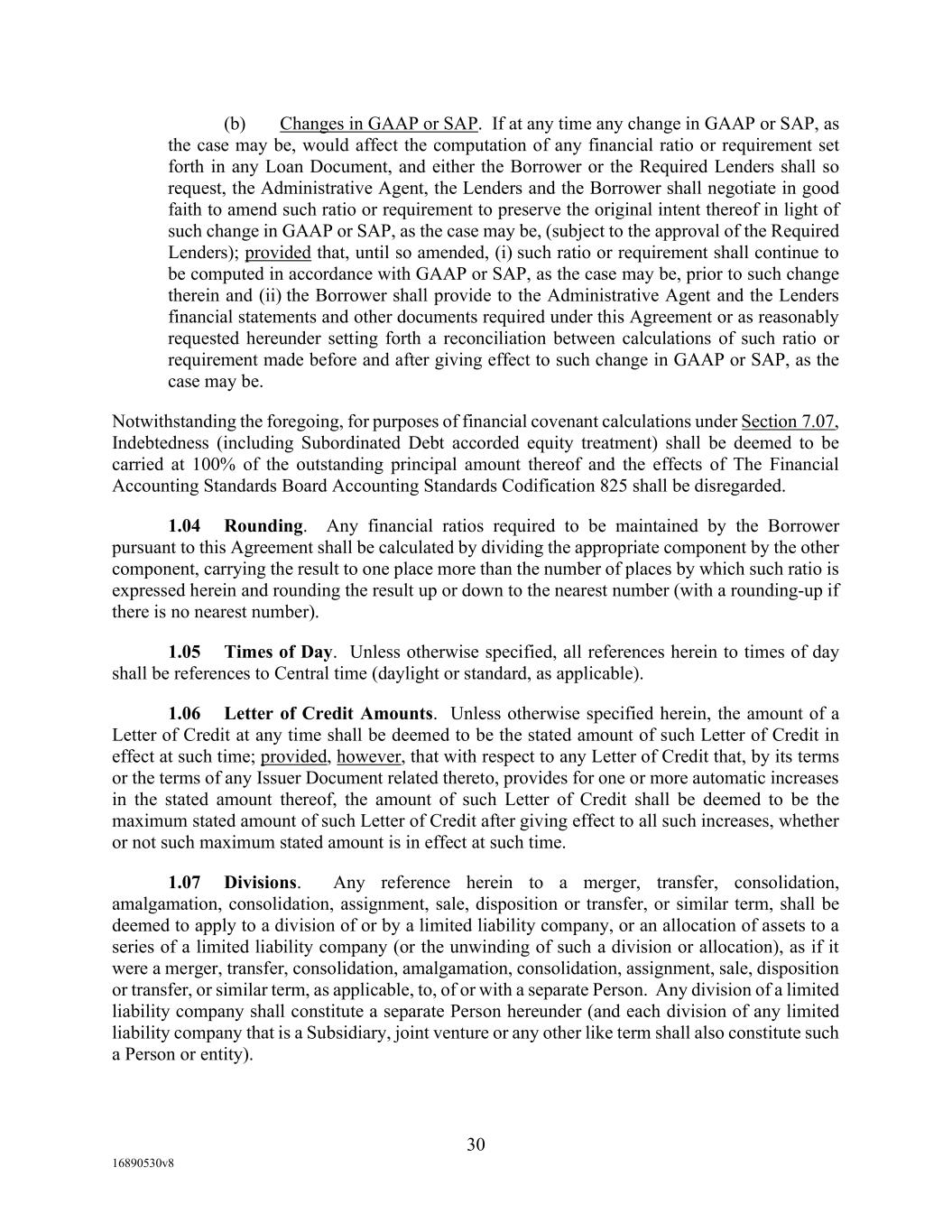16890530v8 30 (b) Changes in GAAP or SAP. If at any time any change in GAAP or SAP, as the case may be, would affect the computation of any financial ratio or requirement set forth in any Loan Document, and either the Borrower or the Required Lenders shall so request, the Administrative Agent, the Lenders and the Borrower shall negotiate in good faith to amend such ratio or requirement to preserve the original intent thereof in light of such change in GAAP or SAP, as the case may be, (subject to the approval of the Required Lenders); provided that, until so amended, (i) such ratio or requirement shall continue to be computed in accordance with GAAP or SAP, as the case may be, prior to such change therein and (ii) the Borrower shall provide to the Administrative Agent and the Lenders financial statements and other documents required under this Agreement or as reasonably requested hereunder setting forth a reconciliation between calculations of such ratio or requirement made before and after giving effect to such change in GAAP or SAP, as the case may be. Notwithstanding the foregoing, for purposes of financial covenant calculations under Section 7.07, Indebtedness (including Subordinated Debt accorded equity treatment) shall be deemed to be carried at 100% of the outstanding principal amount thereof and the effects of The Financial Accounting Standards Board Accounting Standards Codification 825 shall be disregarded. 1.04 Rounding. Any financial ratios required to be maintained by the Borrower pursuant to this Agreement shall be calculated by dividing the appropriate component by the other component, carrying the result to one place more than the number of places by which such ratio is expressed herein and rounding the result up or down to the nearest number (with a rounding-up if there is no nearest number). 1.05 Times of Day. Unless otherwise specified, all references herein to times of day shall be references to Central time (daylight or standard, as applicable). 1.06 Letter of Credit Amounts. Unless otherwise specified herein, the amount of a Letter of Credit at any time shall be deemed to be the stated amount of such Letter of Credit in effect at such time; provided, however, that with respect to any Letter of Credit that, by its terms or the terms of any Issuer Document related thereto, provides for one or more automatic increases in the stated amount thereof, the amount of such Letter of Credit shall be deemed to be the maximum stated amount of such Letter of Credit after giving effect to all such increases, whether or not such maximum stated amount is in effect at such time. 1.07 Divisions. Any reference herein to a merger, transfer, consolidation, amalgamation, consolidation, assignment, sale, disposition or transfer, or similar term, shall be deemed to apply to a division of or by a limited liability company, or an allocation of assets to a series of a limited liability company (or the unwinding of such a division or allocation), as if it were a merger, transfer, consolidation, amalgamation, consolidation, assignment, sale, disposition or transfer, or similar term, as applicable, to, of or with a separate Person. Any division of a limited liability company shall constitute a separate Person hereunder (and each division of any limited liability company that is a Subsidiary, joint venture or any other like term shall also constitute such a Person or entity).