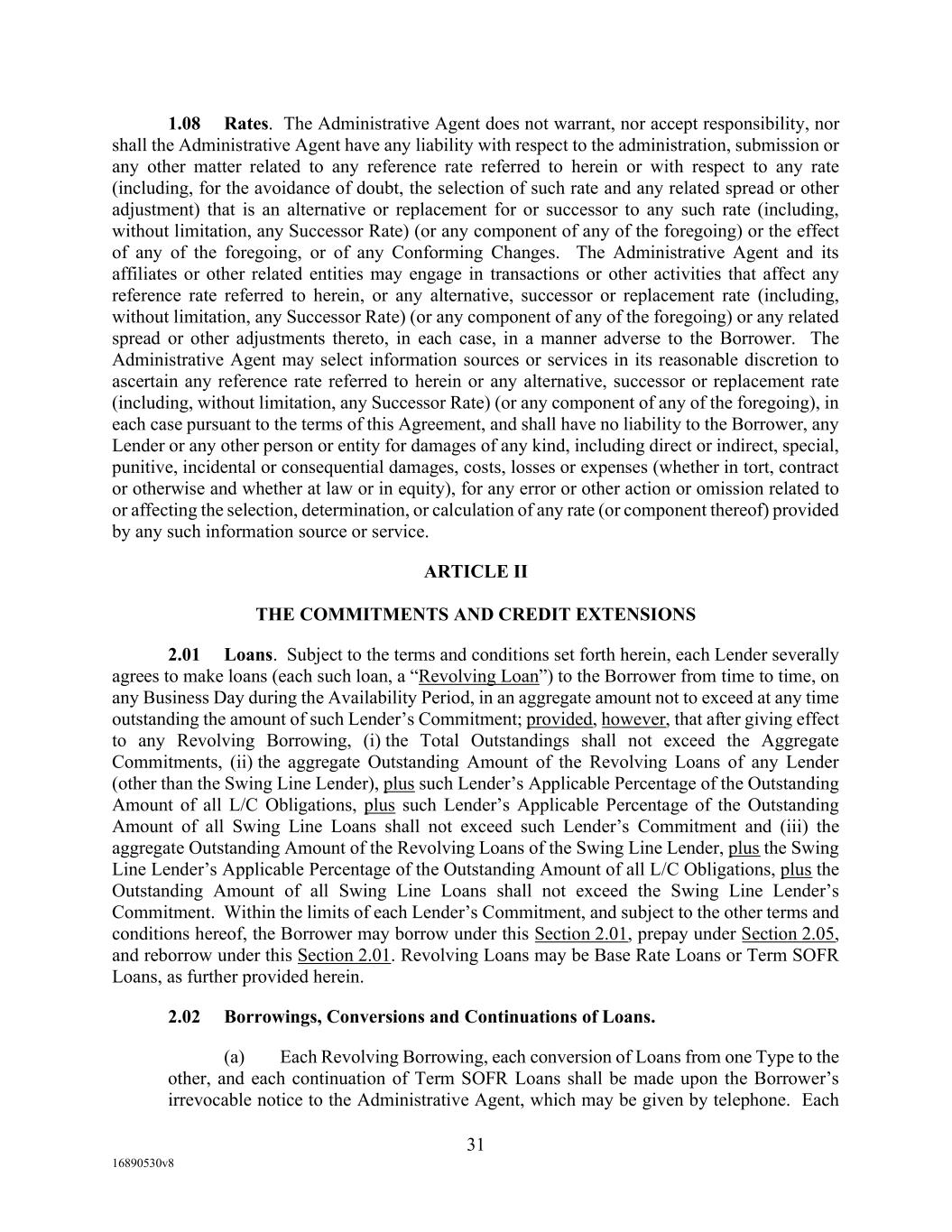 16890530v8 31 1.08 Rates. The Administrative Agent does not warrant, nor accept responsibility, nor shall the Administrative Agent have any liability with respect to the administration, submission or any other matter related to any reference rate referred to herein or with respect to any rate (including, for the avoidance of doubt, the selection of such rate and any related spread or other adjustment) that is an alternative or replacement for or successor to any such rate (including, without limitation, any Successor Rate) (or any component of any of the foregoing) or the effect of any of the foregoing, or of any Conforming Changes. The Administrative Agent and its affiliates or other related entities may engage in transactions or other activities that affect any reference rate referred to herein, or any alternative, successor or replacement rate (including, without limitation, any Successor Rate) (or any component of any of the foregoing) or any related spread or other adjustments thereto, in each case, in a manner adverse to the Borrower. The Administrative Agent may select information sources or services in its reasonable discretion to ascertain any reference rate referred to herein or any alternative, successor or replacement rate (including, without limitation, any Successor Rate) (or any component of any of the foregoing), in each case pursuant to the terms of this Agreement, and shall have no liability to the Borrower, any Lender or any other person or entity for damages of any kind, including direct or indirect, special, punitive, incidental or consequential damages, costs, losses or expenses (whether in tort, contract or otherwise and whether at law or in equity), for any error or other action or omission related to or affecting the selection, determination, or calculation of any rate (or component thereof) provided by any such information source or service. ARTICLE II THE COMMITMENTS AND CREDIT EXTENSIONS 2.01 Loans. Subject to the terms and conditions set forth herein, each Lender severally agrees to make loans (each such loan, a “Revolving Loan”) to the Borrower from time to time, on any Business Day during the Availability Period, in an aggregate amount not to exceed at any time outstanding the amount of such Lender’s Commitment; provided, however, that after giving effect to any Revolving Borrowing, (i) the Total Outstandings shall not exceed the Aggregate Commitments, (ii) the aggregate Outstanding Amount of the Revolving Loans of any Lender (other than the Swing Line Lender), plus such Lender’s Applicable Percentage of the Outstanding Amount of all L/C Obligations, plus such Lender’s Applicable Percentage of the Outstanding Amount of all Swing Line Loans shall not exceed such Lender’s Commitment and (iii) the aggregate Outstanding Amount of the Revolving Loans of the Swing Line Lender, plus the Swing Line Lender’s Applicable Percentage of the Outstanding Amount of all L/C Obligations, plus the Outstanding Amount of all Swing Line Loans shall not exceed the Swing Line Lender’s Commitment. Within the limits of each Lender’s Commitment, and subject to the other terms and conditions hereof, the Borrower may borrow under this Section 2.01, prepay under Section 2.05, and reborrow under this Section 2.01. Revolving Loans may be Base Rate Loans or Term SOFR Loans, as further provided herein. 2.02 Borrowings, Conversions and Continuations of Loans. (a) Each Revolving Borrowing, each conversion of Loans from one Type to the other, and each continuation of Term SOFR Loans shall be made upon the Borrower’s irrevocable notice to the Administrative Agent, which may be given by telephone. Each
