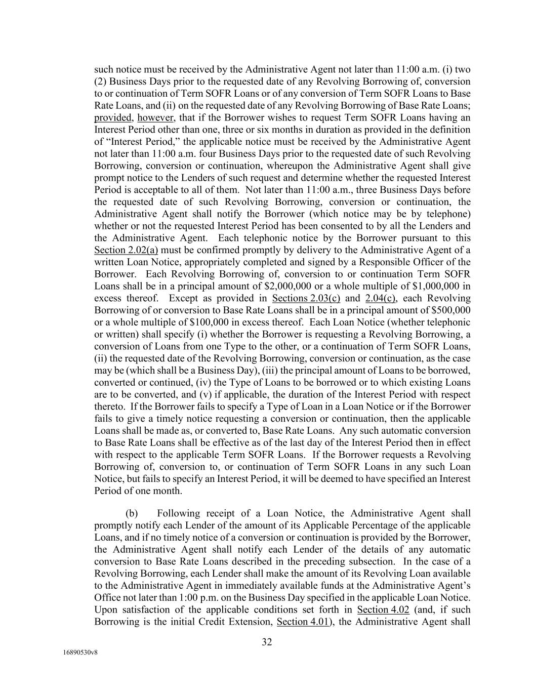 16890530v8 32 such notice must be received by the Administrative Agent not later than 11:00 a.m. (i) two (2) Business Days prior to the requested date of any Revolving Borrowing of, conversion to or continuation of Term SOFR Loans or of any conversion of Term SOFR Loans to Base Rate Loans, and (ii) on the requested date of any Revolving Borrowing of Base Rate Loans; provided, however, that if the Borrower wishes to request Term SOFR Loans having an Interest Period other than one, three or six months in duration as provided in the definition of “Interest Period,” the applicable notice must be received by the Administrative Agent not later than 11:00 a.m. four Business Days prior to the requested date of such Revolving Borrowing, conversion or continuation, whereupon the Administrative Agent shall give prompt notice to the Lenders of such request and determine whether the requested Interest Period is acceptable to all of them. Not later than 11:00 a.m., three Business Days before the requested date of such Revolving Borrowing, conversion or continuation, the Administrative Agent shall notify the Borrower (which notice may be by telephone) whether or not the requested Interest Period has been consented to by all the Lenders and the Administrative Agent. Each telephonic notice by the Borrower pursuant to this Section 2.02(a) must be confirmed promptly by delivery to the Administrative Agent of a written Loan Notice, appropriately completed and signed by a Responsible Officer of the Borrower. Each Revolving Borrowing of, conversion to or continuation Term SOFR Loans shall be in a principal amount of $2,000,000 or a whole multiple of $1,000,000 in excess thereof. Except as provided in Sections 2.03(c) and 2.04(c), each Revolving Borrowing of or conversion to Base Rate Loans shall be in a principal amount of $500,000 or a whole multiple of $100,000 in excess thereof. Each Loan Notice (whether telephonic or written) shall specify (i) whether the Borrower is requesting a Revolving Borrowing, a conversion of Loans from one Type to the other, or a continuation of Term SOFR Loans, (ii) the requested date of the Revolving Borrowing, conversion or continuation, as the case may be (which shall be a Business Day), (iii) the principal amount of Loans to be borrowed, converted or continued, (iv) the Type of Loans to be borrowed or to which existing Loans are to be converted, and (v) if applicable, the duration of the Interest Period with respect thereto. If the Borrower fails to specify a Type of Loan in a Loan Notice or if the Borrower fails to give a timely notice requesting a conversion or continuation, then the applicable Loans shall be made as, or converted to, Base Rate Loans. Any such automatic conversion to Base Rate Loans shall be effective as of the last day of the Interest Period then in effect with respect to the applicable Term SOFR Loans. If the Borrower requests a Revolving Borrowing of, conversion to, or continuation of Term SOFR Loans in any such Loan Notice, but fails to specify an Interest Period, it will be deemed to have specified an Interest Period of one month. (b) Following receipt of a Loan Notice, the Administrative Agent shall promptly notify each Lender of the amount of its Applicable Percentage of the applicable Loans, and if no timely notice of a conversion or continuation is provided by the Borrower, the Administrative Agent shall notify each Lender of the details of any automatic conversion to Base Rate Loans described in the preceding subsection. In the case of a Revolving Borrowing, each Lender shall make the amount of its Revolving Loan available to the Administrative Agent in immediately available funds at the Administrative Agent’s Office not later than 1:00 p.m. on the Business Day specified in the applicable Loan Notice. Upon satisfaction of the applicable conditions set forth in Section 4.02 (and, if such Borrowing is the initial Credit Extension, Section 4.01), the Administrative Agent shall