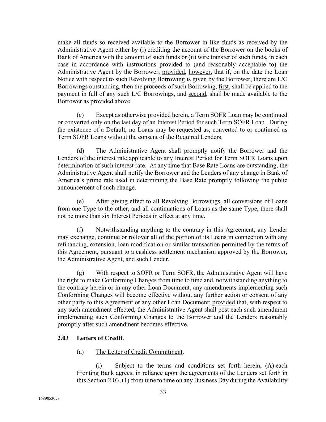 16890530v8 33 make all funds so received available to the Borrower in like funds as received by the Administrative Agent either by (i) crediting the account of the Borrower on the books of Bank of America with the amount of such funds or (ii) wire transfer of such funds, in each case in accordance with instructions provided to (and reasonably acceptable to) the Administrative Agent by the Borrower; provided, however, that if, on the date the Loan Notice with respect to such Revolving Borrowing is given by the Borrower, there are L/C Borrowings outstanding, then the proceeds of such Borrowing, first, shall be applied to the payment in full of any such L/C Borrowings, and second, shall be made available to the Borrower as provided above. (c) Except as otherwise provided herein, a Term SOFR Loan may be continued or converted only on the last day of an Interest Period for such Term SOFR Loan. During the existence of a Default, no Loans may be requested as, converted to or continued as Term SOFR Loans without the consent of the Required Lenders. (d) The Administrative Agent shall promptly notify the Borrower and the Lenders of the interest rate applicable to any Interest Period for Term SOFR Loans upon determination of such interest rate. At any time that Base Rate Loans are outstanding, the Administrative Agent shall notify the Borrower and the Lenders of any change in Bank of America’s prime rate used in determining the Base Rate promptly following the public announcement of such change. (e) After giving effect to all Revolving Borrowings, all conversions of Loans from one Type to the other, and all continuations of Loans as the same Type, there shall not be more than six Interest Periods in effect at any time. (f) Notwithstanding anything to the contrary in this Agreement, any Lender may exchange, continue or rollover all of the portion of its Loans in connection with any refinancing, extension, loan modification or similar transaction permitted by the terms of this Agreement, pursuant to a cashless settlement mechanism approved by the Borrower, the Administrative Agent, and such Lender. (g) With respect to SOFR or Term SOFR, the Administrative Agent will have the right to make Conforming Changes from time to time and, notwithstanding anything to the contrary herein or in any other Loan Document, any amendments implementing such Conforming Changes will become effective without any further action or consent of any other party to this Agreement or any other Loan Document; provided that, with respect to any such amendment effected, the Administrative Agent shall post each such amendment implementing such Conforming Changes to the Borrower and the Lenders reasonably promptly after such amendment becomes effective. 2.03 Letters of Credit. (a) The Letter of Credit Commitment. (i) Subject to the terms and conditions set forth herein, (A) each Fronting Bank agrees, in reliance upon the agreements of the Lenders set forth in this Section 2.03, (1) from time to time on any Business Day during the Availability