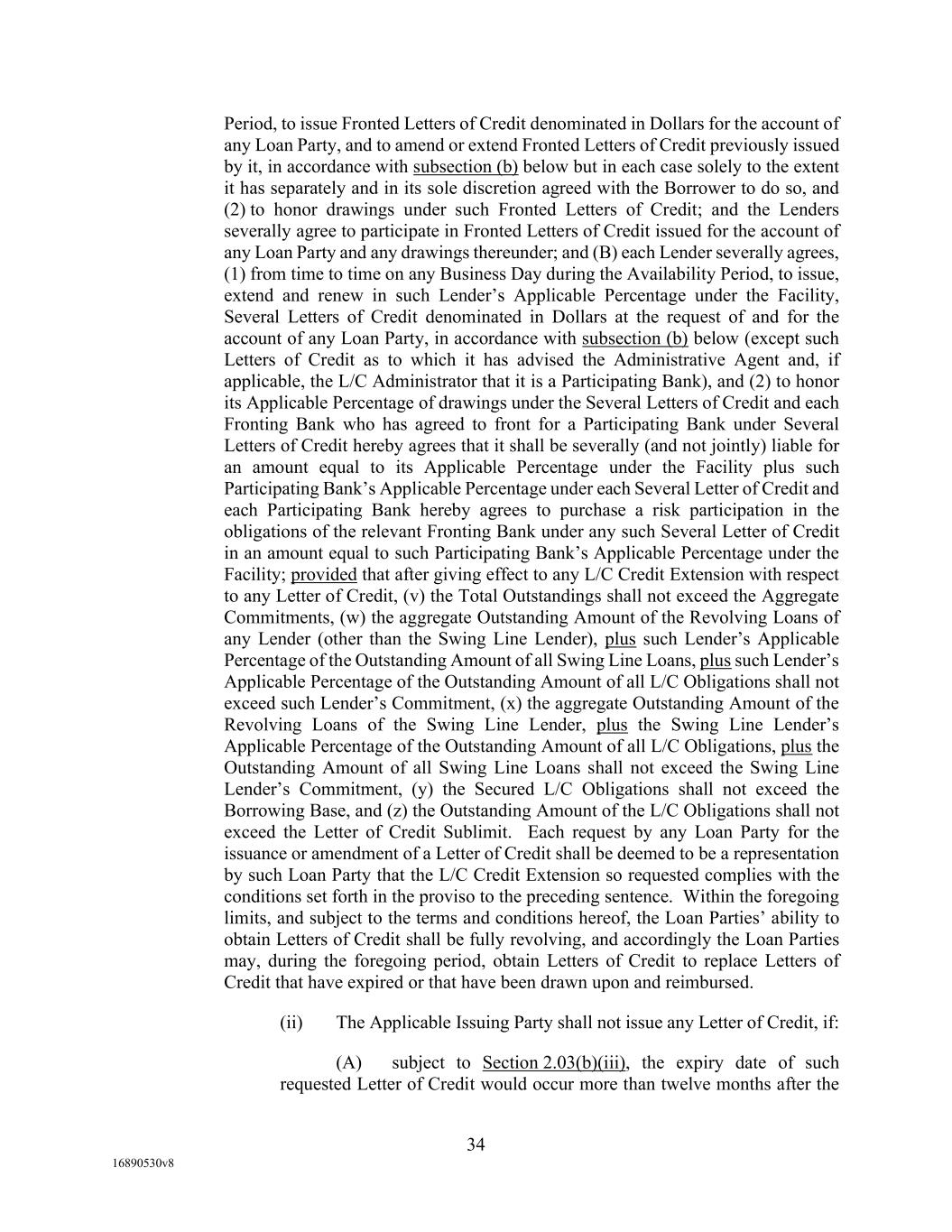 16890530v8 34 Period, to issue Fronted Letters of Credit denominated in Dollars for the account of any Loan Party, and to amend or extend Fronted Letters of Credit previously issued by it, in accordance with subsection (b) below but in each case solely to the extent it has separately and in its sole discretion agreed with the Borrower to do so, and (2) to honor drawings under such Fronted Letters of Credit; and the Lenders severally agree to participate in Fronted Letters of Credit issued for the account of any Loan Party and any drawings thereunder; and (B) each Lender severally agrees, (1) from time to time on any Business Day during the Availability Period, to issue, extend and renew in such Lender’s Applicable Percentage under the Facility, Several Letters of Credit denominated in Dollars at the request of and for the account of any Loan Party, in accordance with subsection (b) below (except such Letters of Credit as to which it has advised the Administrative Agent and, if applicable, the L/C Administrator that it is a Participating Bank), and (2) to honor its Applicable Percentage of drawings under the Several Letters of Credit and each Fronting Bank who has agreed to front for a Participating Bank under Several Letters of Credit hereby agrees that it shall be severally (and not jointly) liable for an amount equal to its Applicable Percentage under the Facility plus such Participating Bank’s Applicable Percentage under each Several Letter of Credit and each Participating Bank hereby agrees to purchase a risk participation in the obligations of the relevant Fronting Bank under any such Several Letter of Credit in an amount equal to such Participating Bank’s Applicable Percentage under the Facility; provided that after giving effect to any L/C Credit Extension with respect to any Letter of Credit, (v) the Total Outstandings shall not exceed the Aggregate Commitments, (w) the aggregate Outstanding Amount of the Revolving Loans of any Lender (other than the Swing Line Lender), plus such Lender’s Applicable Percentage of the Outstanding Amount of all Swing Line Loans, plus such Lender’s Applicable Percentage of the Outstanding Amount of all L/C Obligations shall not exceed such Lender’s Commitment, (x) the aggregate Outstanding Amount of the Revolving Loans of the Swing Line Lender, plus the Swing Line Lender’s Applicable Percentage of the Outstanding Amount of all L/C Obligations, plus the Outstanding Amount of all Swing Line Loans shall not exceed the Swing Line Lender’s Commitment, (y) the Secured L/C Obligations shall not exceed the Borrowing Base, and (z) the Outstanding Amount of the L/C Obligations shall not exceed the Letter of Credit Sublimit. Each request by any Loan Party for the issuance or amendment of a Letter of Credit shall be deemed to be a representation by such Loan Party that the L/C Credit Extension so requested complies with the conditions set forth in the proviso to the preceding sentence. Within the foregoing limits, and subject to the terms and conditions hereof, the Loan Parties’ ability to obtain Letters of Credit shall be fully revolving, and accordingly the Loan Parties may, during the foregoing period, obtain Letters of Credit to replace Letters of Credit that have expired or that have been drawn upon and reimbursed. (ii) The Applicable Issuing Party shall not issue any Letter of Credit, if: (A) subject to Section 2.03(b)(iii), the expiry date of such requested Letter of Credit would occur more than twelve months after the