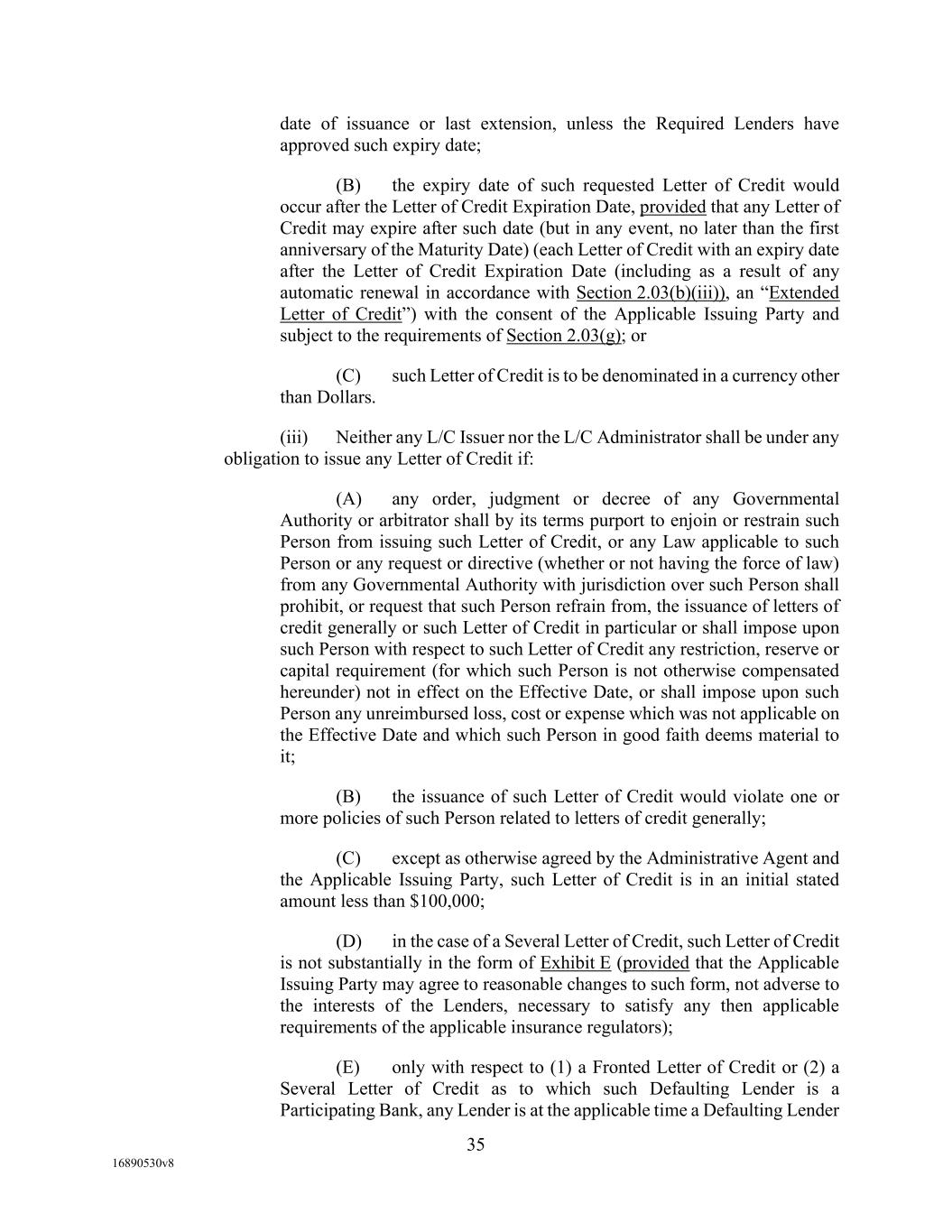 16890530v8 35 date of issuance or last extension, unless the Required Lenders have approved such expiry date; (B) the expiry date of such requested Letter of Credit would occur after the Letter of Credit Expiration Date, provided that any Letter of Credit may expire after such date (but in any event, no later than the first anniversary of the Maturity Date) (each Letter of Credit with an expiry date after the Letter of Credit Expiration Date (including as a result of any automatic renewal in accordance with Section 2.03(b)(iii)), an “Extended Letter of Credit”) with the consent of the Applicable Issuing Party and subject to the requirements of Section 2.03(g); or (C) such Letter of Credit is to be denominated in a currency other than Dollars. (iii) Neither any L/C Issuer nor the L/C Administrator shall be under any obligation to issue any Letter of Credit if: (A) any order, judgment or decree of any Governmental Authority or arbitrator shall by its terms purport to enjoin or restrain such Person from issuing such Letter of Credit, or any Law applicable to such Person or any request or directive (whether or not having the force of law) from any Governmental Authority with jurisdiction over such Person shall prohibit, or request that such Person refrain from, the issuance of letters of credit generally or such Letter of Credit in particular or shall impose upon such Person with respect to such Letter of Credit any restriction, reserve or capital requirement (for which such Person is not otherwise compensated hereunder) not in effect on the Effective Date, or shall impose upon such Person any unreimbursed loss, cost or expense which was not applicable on the Effective Date and which such Person in good faith deems material to it; (B) the issuance of such Letter of Credit would violate one or more policies of such Person related to letters of credit generally; (C) except as otherwise agreed by the Administrative Agent and the Applicable Issuing Party, such Letter of Credit is in an initial stated amount less than $100,000; (D) in the case of a Several Letter of Credit, such Letter of Credit is not substantially in the form of Exhibit E (provided that the Applicable Issuing Party may agree to reasonable changes to such form, not adverse to the interests of the Lenders, necessary to satisfy any then applicable requirements of the applicable insurance regulators); (E) only with respect to (1) a Fronted Letter of Credit or (2) a Several Letter of Credit as to which such Defaulting Lender is a Participating Bank, any Lender is at the applicable time a Defaulting Lender