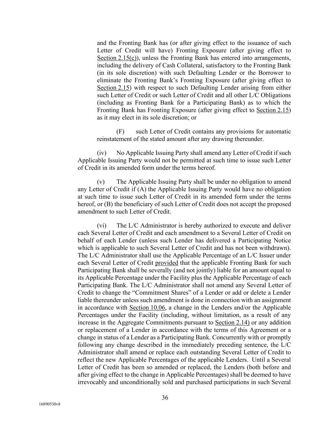 16890530v8 36 and the Fronting Bank has (or after giving effect to the issuance of such Letter of Credit will have) Fronting Exposure (after giving effect to Section 2.15(c)), unless the Fronting Bank has entered into arrangements, including the delivery of Cash Collateral, satisfactory to the Fronting Bank (in its sole discretion) with such Defaulting Lender or the Borrower to eliminate the Fronting Bank’s Fronting Exposure (after giving effect to Section 2.15) with respect to such Defaulting Lender arising from either such Letter of Credit or such Letter of Credit and all other L/C Obligations (including as Fronting Bank for a Participating Bank) as to which the Fronting Bank has Fronting Exposure (after giving effect to Section 2.15) as it may elect in its sole discretion; or (F) such Letter of Credit contains any provisions for automatic reinstatement of the stated amount after any drawing thereunder. (iv) No Applicable Issuing Party shall amend any Letter of Credit if such Applicable Issuing Party would not be permitted at such time to issue such Letter of Credit in its amended form under the terms hereof. (v) The Applicable Issuing Party shall be under no obligation to amend any Letter of Credit if (A) the Applicable Issuing Party would have no obligation at such time to issue such Letter of Credit in its amended form under the terms hereof, or (B) the beneficiary of such Letter of Credit does not accept the proposed amendment to such Letter of Credit. (vi) The L/C Administrator is hereby authorized to execute and deliver each Several Letter of Credit and each amendment to a Several Letter of Credit on behalf of each Lender (unless such Lender has delivered a Participating Notice which is applicable to such Several Letter of Credit and has not been withdrawn). The L/C Administrator shall use the Applicable Percentage of an L/C Issuer under each Several Letter of Credit provided that the applicable Fronting Bank for such Participating Bank shall be severally (and not jointly) liable for an amount equal to its Applicable Percentage under the Facility plus the Applicable Percentage of each Participating Bank. The L/C Administrator shall not amend any Several Letter of Credit to change the “Commitment Shares” of a Lender or add or delete a Lender liable thereunder unless such amendment is done in connection with an assignment in accordance with Section 10.06, a change in the Lenders and/or the Applicable Percentages under the Facility (including, without limitation, as a result of any increase in the Aggregate Commitments pursuant to Section 2.14) or any addition or replacement of a Lender in accordance with the terms of this Agreement or a change in status of a Lender as a Participating Bank. Concurrently with or promptly following any change described in the immediately preceding sentence, the L/C Administrator shall amend or replace each outstanding Several Letter of Credit to reflect the new Applicable Percentages of the applicable Lenders. Until a Several Letter of Credit has been so amended or replaced, the Lenders (both before and after giving effect to the change in Applicable Percentages) shall be deemed to have irrevocably and unconditionally sold and purchased participations in such Several