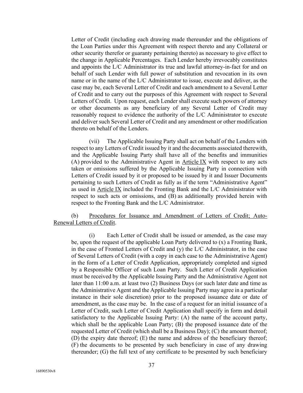 16890530v8 37 Letter of Credit (including each drawing made thereunder and the obligations of the Loan Parties under this Agreement with respect thereto and any Collateral or other security therefor or guaranty pertaining thereto) as necessary to give effect to the change in Applicable Percentages. Each Lender hereby irrevocably constitutes and appoints the L/C Administrator its true and lawful attorney-in-fact for and on behalf of such Lender with full power of substitution and revocation in its own name or in the name of the L/C Administrator to issue, execute and deliver, as the case may be, each Several Letter of Credit and each amendment to a Several Letter of Credit and to carry out the purposes of this Agreement with respect to Several Letters of Credit. Upon request, each Lender shall execute such powers of attorney or other documents as any beneficiary of any Several Letter of Credit may reasonably request to evidence the authority of the L/C Administrator to execute and deliver such Several Letter of Credit and any amendment or other modification thereto on behalf of the Lenders. (vii) The Applicable Issuing Party shall act on behalf of the Lenders with respect to any Letters of Credit issued by it and the documents associated therewith, and the Applicable Issuing Party shall have all of the benefits and immunities (A) provided to the Administrative Agent in Article IX with respect to any acts taken or omissions suffered by the Applicable Issuing Party in connection with Letters of Credit issued by it or proposed to be issued by it and Issuer Documents pertaining to such Letters of Credit as fully as if the term “Administrative Agent” as used in Article IX included the Fronting Bank and the L/C Administrator with respect to such acts or omissions, and (B) as additionally provided herein with respect to the Fronting Bank and the L/C Administrator. (b) Procedures for Issuance and Amendment of Letters of Credit; Auto- Renewal Letters of Credit. (i) Each Letter of Credit shall be issued or amended, as the case may be, upon the request of the applicable Loan Party delivered to (x) a Fronting Bank, in the case of Fronted Letters of Credit and (y) the L/C Administrator, in the case of Several Letters of Credit (with a copy in each case to the Administrative Agent) in the form of a Letter of Credit Application, appropriately completed and signed by a Responsible Officer of such Loan Party. Such Letter of Credit Application must be received by the Applicable Issuing Party and the Administrative Agent not later than 11:00 a.m. at least two (2) Business Days (or such later date and time as the Administrative Agent and the Applicable Issuing Party may agree in a particular instance in their sole discretion) prior to the proposed issuance date or date of amendment, as the case may be. In the case of a request for an initial issuance of a Letter of Credit, such Letter of Credit Application shall specify in form and detail satisfactory to the Applicable Issuing Party: (A) the name of the account party, which shall be the applicable Loan Party; (B) the proposed issuance date of the requested Letter of Credit (which shall be a Business Day); (C) the amount thereof; (D) the expiry date thereof; (E) the name and address of the beneficiary thereof; (F) the documents to be presented by such beneficiary in case of any drawing thereunder; (G) the full text of any certificate to be presented by such beneficiary