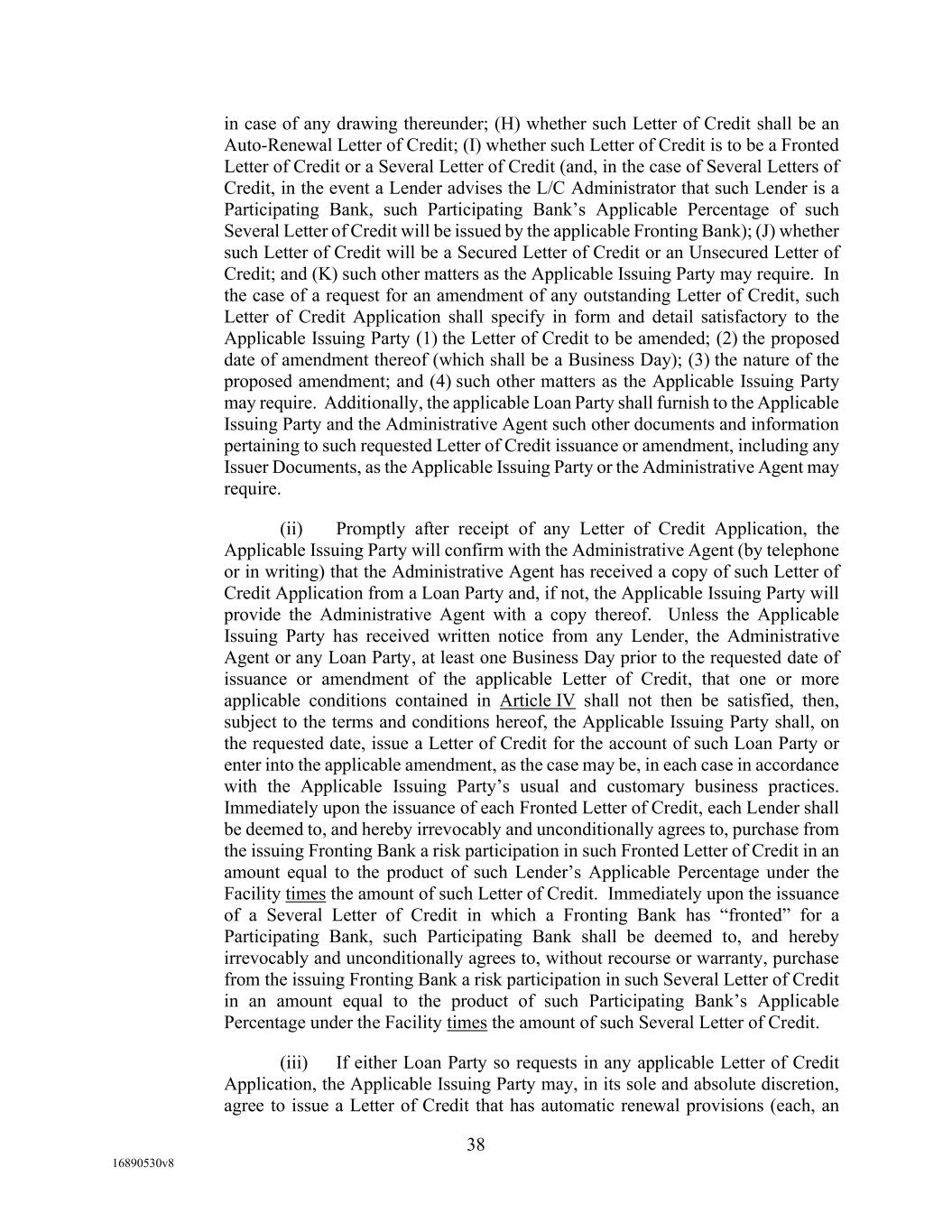 16890530v8 38 in case of any drawing thereunder; (H) whether such Letter of Credit shall be an Auto-Renewal Letter of Credit; (I) whether such Letter of Credit is to be a Fronted Letter of Credit or a Several Letter of Credit (and, in the case of Several Letters of Credit, in the event a Lender advises the L/C Administrator that such Lender is a Participating Bank, such Participating Bank’s Applicable Percentage of such Several Letter of Credit will be issued by the applicable Fronting Bank); (J) whether such Letter of Credit will be a Secured Letter of Credit or an Unsecured Letter of Credit; and (K) such other matters as the Applicable Issuing Party may require. In the case of a request for an amendment of any outstanding Letter of Credit, such Letter of Credit Application shall specify in form and detail satisfactory to the Applicable Issuing Party (1) the Letter of Credit to be amended; (2) the proposed date of amendment thereof (which shall be a Business Day); (3) the nature of the proposed amendment; and (4) such other matters as the Applicable Issuing Party may require. Additionally, the applicable Loan Party shall furnish to the Applicable Issuing Party and the Administrative Agent such other documents and information pertaining to such requested Letter of Credit issuance or amendment, including any Issuer Documents, as the Applicable Issuing Party or the Administrative Agent may require. (ii) Promptly after receipt of any Letter of Credit Application, the Applicable Issuing Party will confirm with the Administrative Agent (by telephone or in writing) that the Administrative Agent has received a copy of such Letter of Credit Application from a Loan Party and, if not, the Applicable Issuing Party will provide the Administrative Agent with a copy thereof. Unless the Applicable Issuing Party has received written notice from any Lender, the Administrative Agent or any Loan Party, at least one Business Day prior to the requested date of issuance or amendment of the applicable Letter of Credit, that one or more applicable conditions contained in Article IV shall not then be satisfied, then, subject to the terms and conditions hereof, the Applicable Issuing Party shall, on the requested date, issue a Letter of Credit for the account of such Loan Party or enter into the applicable amendment, as the case may be, in each case in accordance with the Applicable Issuing Party’s usual and customary business practices. Immediately upon the issuance of each Fronted Letter of Credit, each Lender shall be deemed to, and hereby irrevocably and unconditionally agrees to, purchase from the issuing Fronting Bank a risk participation in such Fronted Letter of Credit in an amount equal to the product of such Lender’s Applicable Percentage under the Facility times the amount of such Letter of Credit. Immediately upon the issuance of a Several Letter of Credit in which a Fronting Bank has “fronted” for a Participating Bank, such Participating Bank shall be deemed to, and hereby irrevocably and unconditionally agrees to, without recourse or warranty, purchase from the issuing Fronting Bank a risk participation in such Several Letter of Credit in an amount equal to the product of such Participating Bank’s Applicable Percentage under the Facility times the amount of such Several Letter of Credit. (iii) If either Loan Party so requests in any applicable Letter of Credit Application, the Applicable Issuing Party may, in its sole and absolute discretion, agree to issue a Letter of Credit that has automatic renewal provisions (each, an