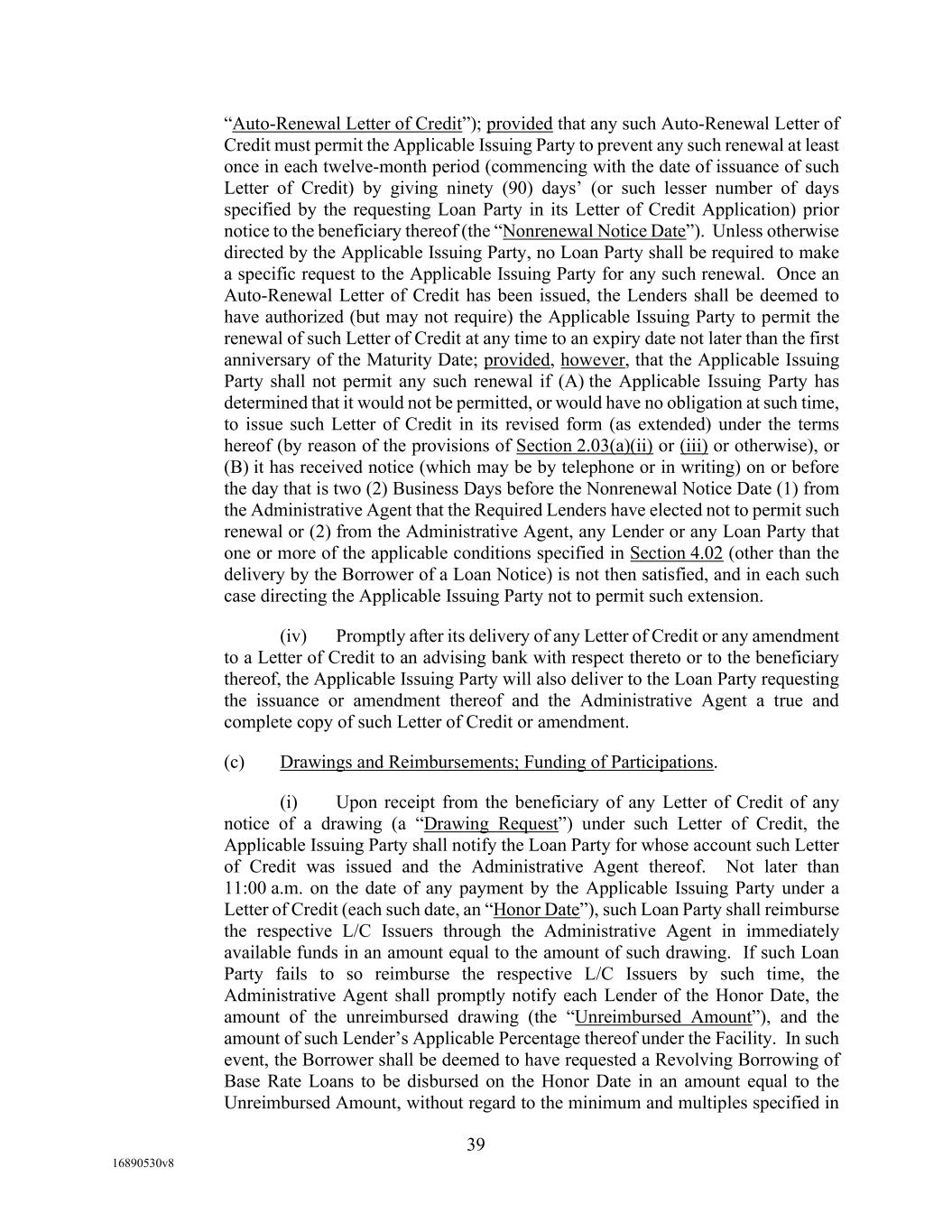 16890530v8 39 “Auto-Renewal Letter of Credit”); provided that any such Auto-Renewal Letter of Credit must permit the Applicable Issuing Party to prevent any such renewal at least once in each twelve-month period (commencing with the date of issuance of such Letter of Credit) by giving ninety (90) days’ (or such lesser number of days specified by the requesting Loan Party in its Letter of Credit Application) prior notice to the beneficiary thereof (the “Nonrenewal Notice Date”). Unless otherwise directed by the Applicable Issuing Party, no Loan Party shall be required to make a specific request to the Applicable Issuing Party for any such renewal. Once an Auto-Renewal Letter of Credit has been issued, the Lenders shall be deemed to have authorized (but may not require) the Applicable Issuing Party to permit the renewal of such Letter of Credit at any time to an expiry date not later than the first anniversary of the Maturity Date; provided, however, that the Applicable Issuing Party shall not permit any such renewal if (A) the Applicable Issuing Party has determined that it would not be permitted, or would have no obligation at such time, to issue such Letter of Credit in its revised form (as extended) under the terms hereof (by reason of the provisions of Section 2.03(a)(ii) or (iii) or otherwise), or (B) it has received notice (which may be by telephone or in writing) on or before the day that is two (2) Business Days before the Nonrenewal Notice Date (1) from the Administrative Agent that the Required Lenders have elected not to permit such renewal or (2) from the Administrative Agent, any Lender or any Loan Party that one or more of the applicable conditions specified in Section 4.02 (other than the delivery by the Borrower of a Loan Notice) is not then satisfied, and in each such case directing the Applicable Issuing Party not to permit such extension. (iv) Promptly after its delivery of any Letter of Credit or any amendment to a Letter of Credit to an advising bank with respect thereto or to the beneficiary thereof, the Applicable Issuing Party will also deliver to the Loan Party requesting the issuance or amendment thereof and the Administrative Agent a true and complete copy of such Letter of Credit or amendment. (c) Drawings and Reimbursements; Funding of Participations. (i) Upon receipt from the beneficiary of any Letter of Credit of any notice of a drawing (a “Drawing Request”) under such Letter of Credit, the Applicable Issuing Party shall notify the Loan Party for whose account such Letter of Credit was issued and the Administrative Agent thereof. Not later than 11:00 a.m. on the date of any payment by the Applicable Issuing Party under a Letter of Credit (each such date, an “Honor Date”), such Loan Party shall reimburse the respective L/C Issuers through the Administrative Agent in immediately available funds in an amount equal to the amount of such drawing. If such Loan Party fails to so reimburse the respective L/C Issuers by such time, the Administrative Agent shall promptly notify each Lender of the Honor Date, the amount of the unreimbursed drawing (the “Unreimbursed Amount”), and the amount of such Lender’s Applicable Percentage thereof under the Facility. In such event, the Borrower shall be deemed to have requested a Revolving Borrowing of Base Rate Loans to be disbursed on the Honor Date in an amount equal to the Unreimbursed Amount, without regard to the minimum and multiples specified in