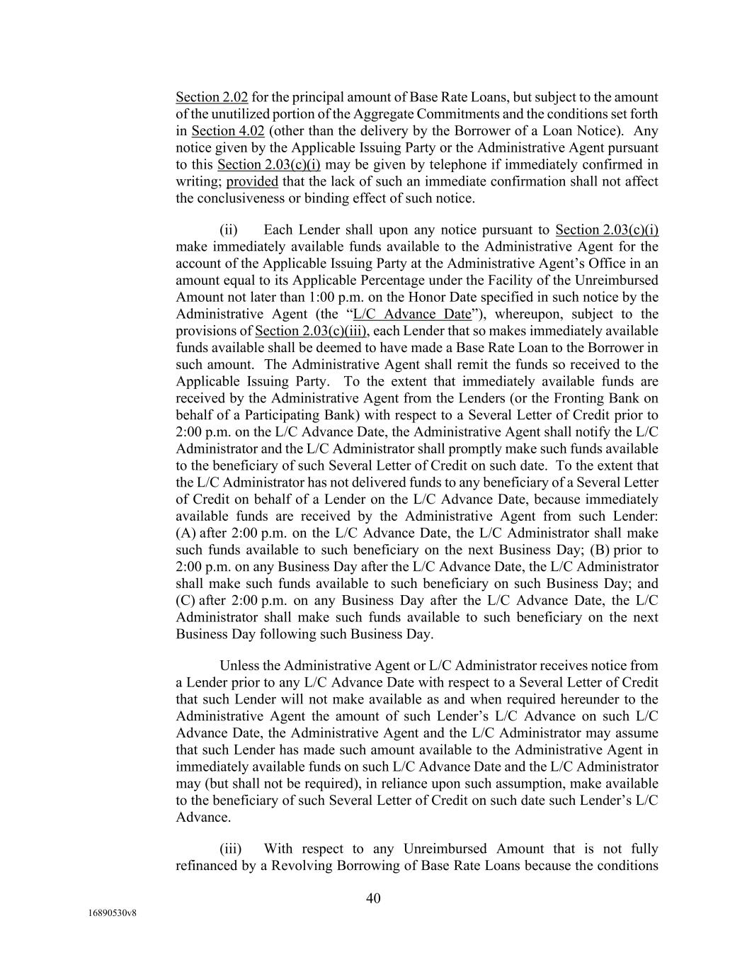 16890530v8 40 Section 2.02 for the principal amount of Base Rate Loans, but subject to the amount of the unutilized portion of the Aggregate Commitments and the conditions set forth in Section 4.02 (other than the delivery by the Borrower of a Loan Notice). Any notice given by the Applicable Issuing Party or the Administrative Agent pursuant to this Section 2.03(c)(i) may be given by telephone if immediately confirmed in writing; provided that the lack of such an immediate confirmation shall not affect the conclusiveness or binding effect of such notice. (ii) Each Lender shall upon any notice pursuant to Section 2.03(c)(i) make immediately available funds available to the Administrative Agent for the account of the Applicable Issuing Party at the Administrative Agent’s Office in an amount equal to its Applicable Percentage under the Facility of the Unreimbursed Amount not later than 1:00 p.m. on the Honor Date specified in such notice by the Administrative Agent (the “L/C Advance Date”), whereupon, subject to the provisions of Section 2.03(c)(iii), each Lender that so makes immediately available funds available shall be deemed to have made a Base Rate Loan to the Borrower in such amount. The Administrative Agent shall remit the funds so received to the Applicable Issuing Party. To the extent that immediately available funds are received by the Administrative Agent from the Lenders (or the Fronting Bank on behalf of a Participating Bank) with respect to a Several Letter of Credit prior to 2:00 p.m. on the L/C Advance Date, the Administrative Agent shall notify the L/C Administrator and the L/C Administrator shall promptly make such funds available to the beneficiary of such Several Letter of Credit on such date. To the extent that the L/C Administrator has not delivered funds to any beneficiary of a Several Letter of Credit on behalf of a Lender on the L/C Advance Date, because immediately available funds are received by the Administrative Agent from such Lender: (A) after 2:00 p.m. on the L/C Advance Date, the L/C Administrator shall make such funds available to such beneficiary on the next Business Day; (B) prior to 2:00 p.m. on any Business Day after the L/C Advance Date, the L/C Administrator shall make such funds available to such beneficiary on such Business Day; and (C) after 2:00 p.m. on any Business Day after the L/C Advance Date, the L/C Administrator shall make such funds available to such beneficiary on the next Business Day following such Business Day. Unless the Administrative Agent or L/C Administrator receives notice from a Lender prior to any L/C Advance Date with respect to a Several Letter of Credit that such Lender will not make available as and when required hereunder to the Administrative Agent the amount of such Lender’s L/C Advance on such L/C Advance Date, the Administrative Agent and the L/C Administrator may assume that such Lender has made such amount available to the Administrative Agent in immediately available funds on such L/C Advance Date and the L/C Administrator may (but shall not be required), in reliance upon such assumption, make available to the beneficiary of such Several Letter of Credit on such date such Lender’s L/C Advance. (iii) With respect to any Unreimbursed Amount that is not fully refinanced by a Revolving Borrowing of Base Rate Loans because the conditions