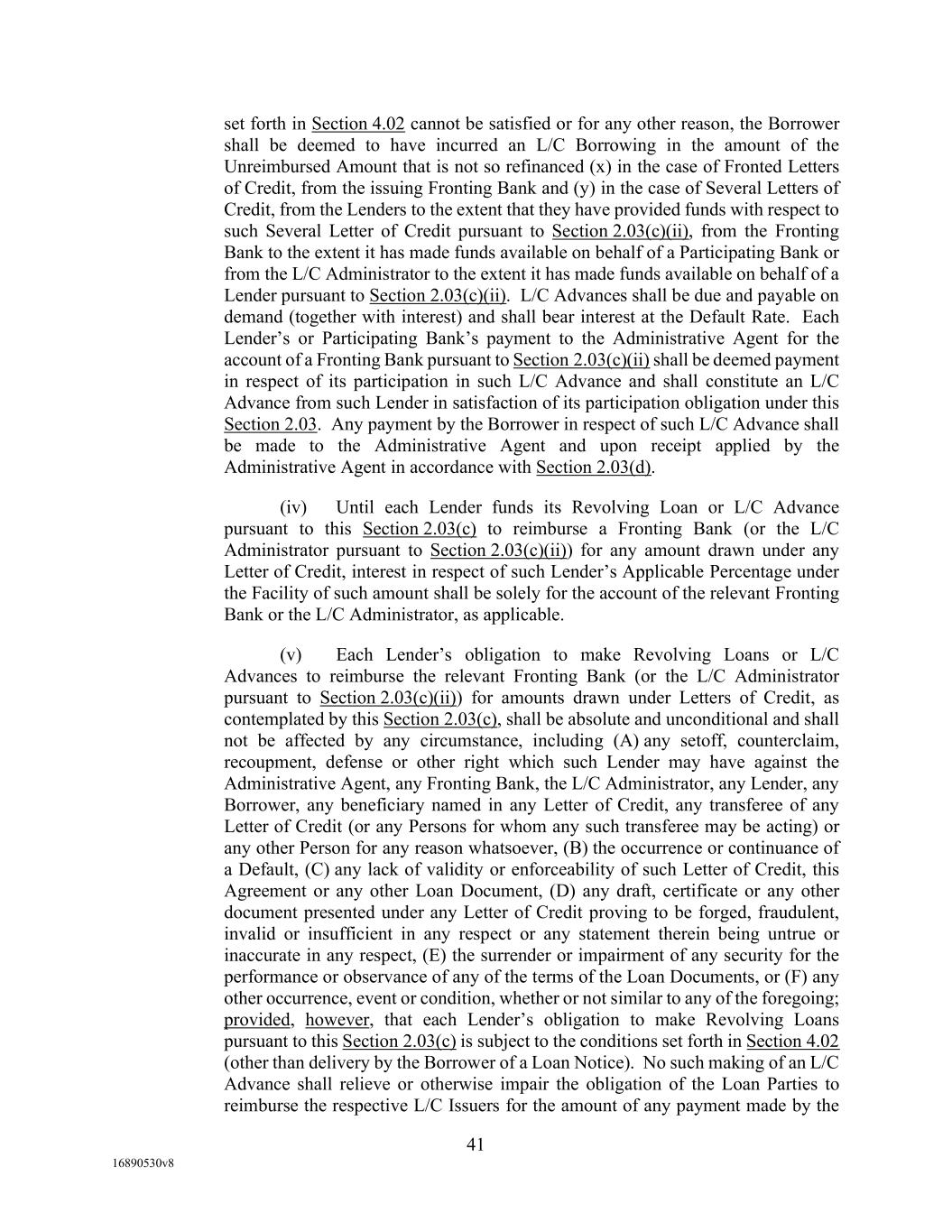 16890530v8 41 set forth in Section 4.02 cannot be satisfied or for any other reason, the Borrower shall be deemed to have incurred an L/C Borrowing in the amount of the Unreimbursed Amount that is not so refinanced (x) in the case of Fronted Letters of Credit, from the issuing Fronting Bank and (y) in the case of Several Letters of Credit, from the Lenders to the extent that they have provided funds with respect to such Several Letter of Credit pursuant to Section 2.03(c)(ii), from the Fronting Bank to the extent it has made funds available on behalf of a Participating Bank or from the L/C Administrator to the extent it has made funds available on behalf of a Lender pursuant to Section 2.03(c)(ii). L/C Advances shall be due and payable on demand (together with interest) and shall bear interest at the Default Rate. Each Lender’s or Participating Bank’s payment to the Administrative Agent for the account of a Fronting Bank pursuant to Section 2.03(c)(ii) shall be deemed payment in respect of its participation in such L/C Advance and shall constitute an L/C Advance from such Lender in satisfaction of its participation obligation under this Section 2.03. Any payment by the Borrower in respect of such L/C Advance shall be made to the Administrative Agent and upon receipt applied by the Administrative Agent in accordance with Section 2.03(d). (iv) Until each Lender funds its Revolving Loan or L/C Advance pursuant to this Section 2.03(c) to reimburse a Fronting Bank (or the L/C Administrator pursuant to Section 2.03(c)(ii)) for any amount drawn under any Letter of Credit, interest in respect of such Lender’s Applicable Percentage under the Facility of such amount shall be solely for the account of the relevant Fronting Bank or the L/C Administrator, as applicable. (v) Each Lender’s obligation to make Revolving Loans or L/C Advances to reimburse the relevant Fronting Bank (or the L/C Administrator pursuant to Section 2.03(c)(ii)) for amounts drawn under Letters of Credit, as contemplated by this Section 2.03(c), shall be absolute and unconditional and shall not be affected by any circumstance, including (A) any setoff, counterclaim, recoupment, defense or other right which such Lender may have against the Administrative Agent, any Fronting Bank, the L/C Administrator, any Lender, any Borrower, any beneficiary named in any Letter of Credit, any transferee of any Letter of Credit (or any Persons for whom any such transferee may be acting) or any other Person for any reason whatsoever, (B) the occurrence or continuance of a Default, (C) any lack of validity or enforceability of such Letter of Credit, this Agreement or any other Loan Document, (D) any draft, certificate or any other document presented under any Letter of Credit proving to be forged, fraudulent, invalid or insufficient in any respect or any statement therein being untrue or inaccurate in any respect, (E) the surrender or impairment of any security for the performance or observance of any of the terms of the Loan Documents, or (F) any other occurrence, event or condition, whether or not similar to any of the foregoing; provided, however, that each Lender’s obligation to make Revolving Loans pursuant to this Section 2.03(c) is subject to the conditions set forth in Section 4.02 (other than delivery by the Borrower of a Loan Notice). No such making of an L/C Advance shall relieve or otherwise impair the obligation of the Loan Parties to reimburse the respective L/C Issuers for the amount of any payment made by the