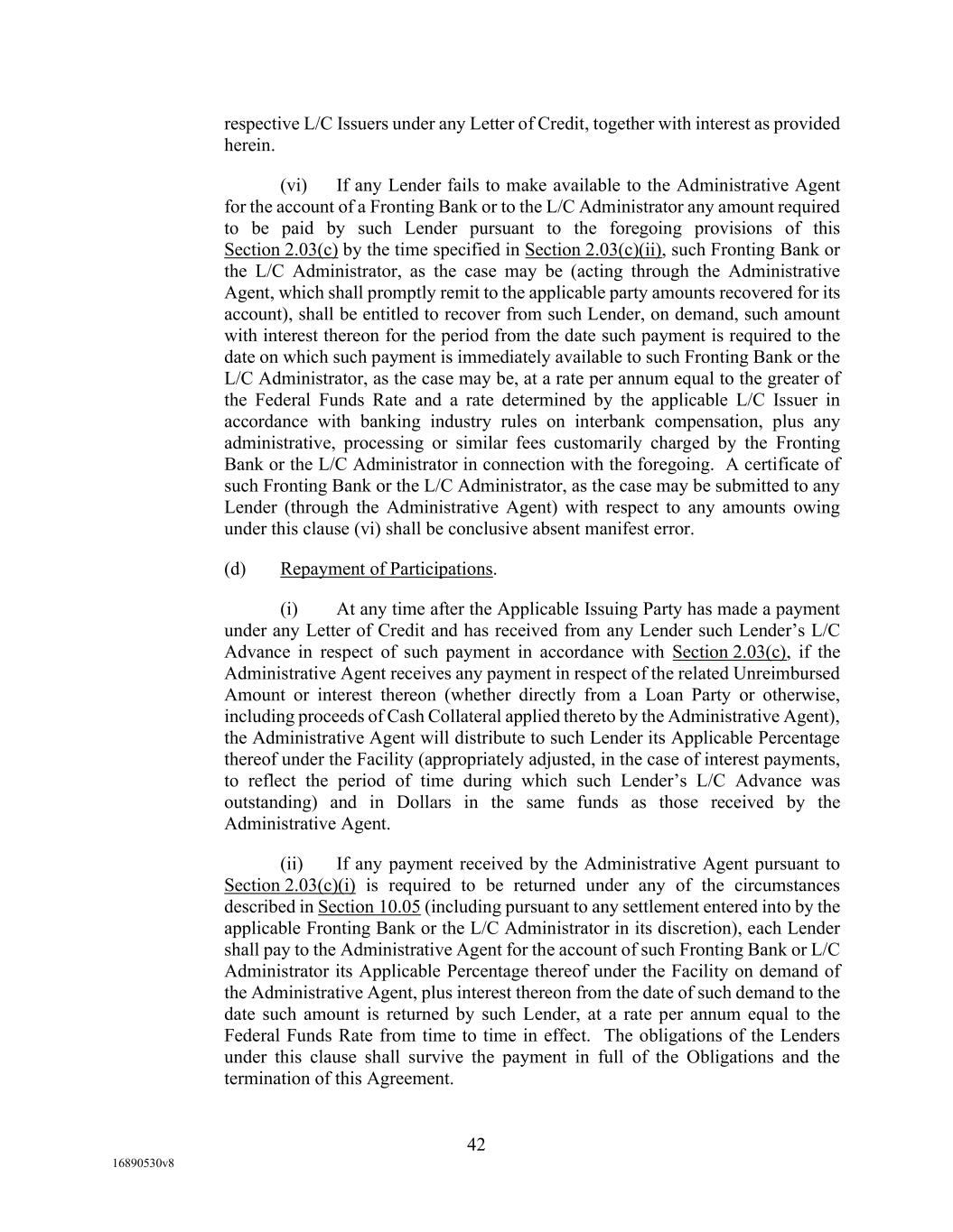 16890530v8 42 respective L/C Issuers under any Letter of Credit, together with interest as provided herein. (vi) If any Lender fails to make available to the Administrative Agent for the account of a Fronting Bank or to the L/C Administrator any amount required to be paid by such Lender pursuant to the foregoing provisions of this Section 2.03(c) by the time specified in Section 2.03(c)(ii), such Fronting Bank or the L/C Administrator, as the case may be (acting through the Administrative Agent, which shall promptly remit to the applicable party amounts recovered for its account), shall be entitled to recover from such Lender, on demand, such amount with interest thereon for the period from the date such payment is required to the date on which such payment is immediately available to such Fronting Bank or the L/C Administrator, as the case may be, at a rate per annum equal to the greater of the Federal Funds Rate and a rate determined by the applicable L/C Issuer in accordance with banking industry rules on interbank compensation, plus any administrative, processing or similar fees customarily charged by the Fronting Bank or the L/C Administrator in connection with the foregoing. A certificate of such Fronting Bank or the L/C Administrator, as the case may be submitted to any Lender (through the Administrative Agent) with respect to any amounts owing under this clause (vi) shall be conclusive absent manifest error. (d) Repayment of Participations. (i) At any time after the Applicable Issuing Party has made a payment under any Letter of Credit and has received from any Lender such Lender’s L/C Advance in respect of such payment in accordance with Section 2.03(c), if the Administrative Agent receives any payment in respect of the related Unreimbursed Amount or interest thereon (whether directly from a Loan Party or otherwise, including proceeds of Cash Collateral applied thereto by the Administrative Agent), the Administrative Agent will distribute to such Lender its Applicable Percentage thereof under the Facility (appropriately adjusted, in the case of interest payments, to reflect the period of time during which such Lender’s L/C Advance was outstanding) and in Dollars in the same funds as those received by the Administrative Agent. (ii) If any payment received by the Administrative Agent pursuant to Section 2.03(c)(i) is required to be returned under any of the circumstances described in Section 10.05 (including pursuant to any settlement entered into by the applicable Fronting Bank or the L/C Administrator in its discretion), each Lender shall pay to the Administrative Agent for the account of such Fronting Bank or L/C Administrator its Applicable Percentage thereof under the Facility on demand of the Administrative Agent, plus interest thereon from the date of such demand to the date such amount is returned by such Lender, at a rate per annum equal to the Federal Funds Rate from time to time in effect. The obligations of the Lenders under this clause shall survive the payment in full of the Obligations and the termination of this Agreement.