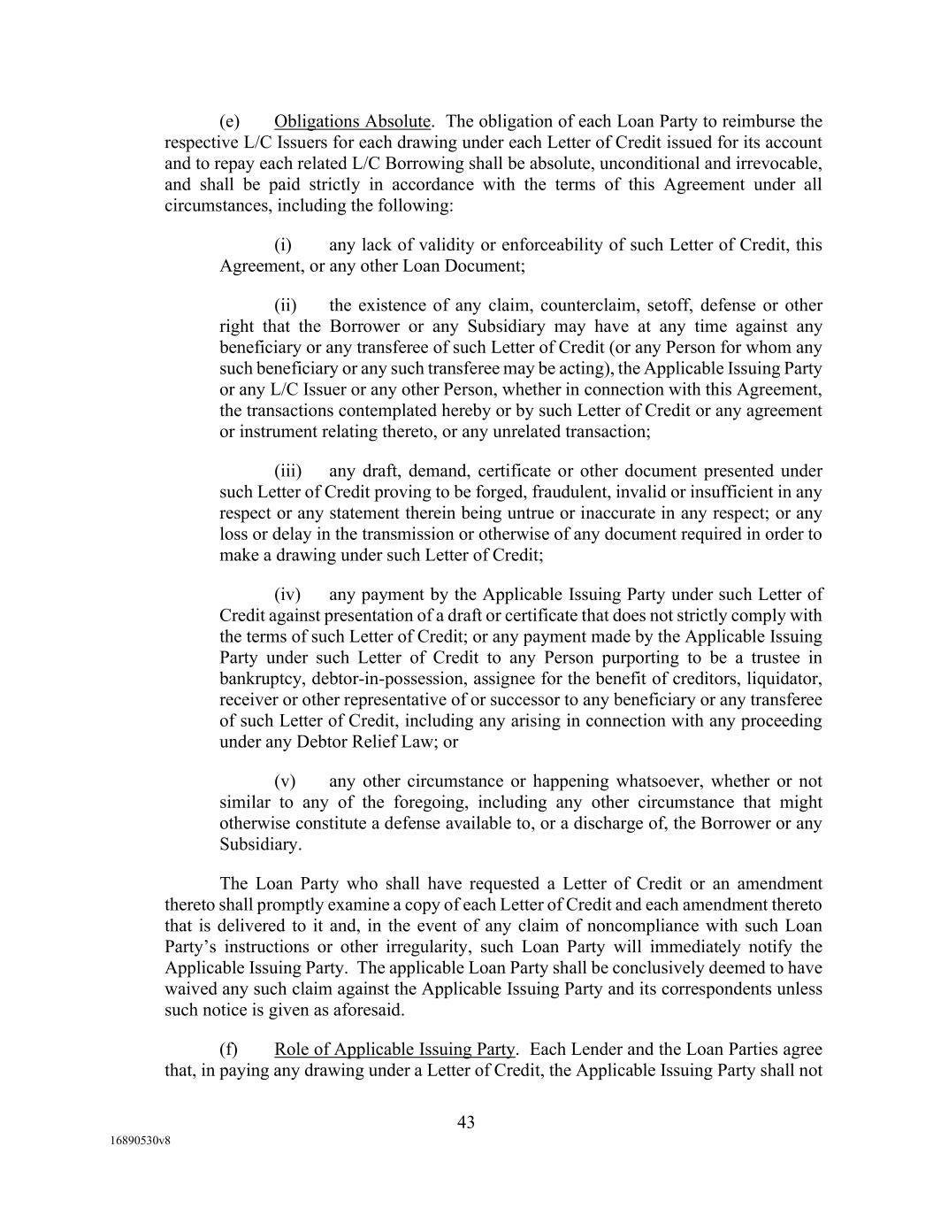 16890530v8 43 (e) Obligations Absolute. The obligation of each Loan Party to reimburse the respective L/C Issuers for each drawing under each Letter of Credit issued for its account and to repay each related L/C Borrowing shall be absolute, unconditional and irrevocable, and shall be paid strictly in accordance with the terms of this Agreement under all circumstances, including the following: (i) any lack of validity or enforceability of such Letter of Credit, this Agreement, or any other Loan Document; (ii) the existence of any claim, counterclaim, setoff, defense or other right that the Borrower or any Subsidiary may have at any time against any beneficiary or any transferee of such Letter of Credit (or any Person for whom any such beneficiary or any such transferee may be acting), the Applicable Issuing Party or any L/C Issuer or any other Person, whether in connection with this Agreement, the transactions contemplated hereby or by such Letter of Credit or any agreement or instrument relating thereto, or any unrelated transaction; (iii) any draft, demand, certificate or other document presented under such Letter of Credit proving to be forged, fraudulent, invalid or insufficient in any respect or any statement therein being untrue or inaccurate in any respect; or any loss or delay in the transmission or otherwise of any document required in order to make a drawing under such Letter of Credit; (iv) any payment by the Applicable Issuing Party under such Letter of Credit against presentation of a draft or certificate that does not strictly comply with the terms of such Letter of Credit; or any payment made by the Applicable Issuing Party under such Letter of Credit to any Person purporting to be a trustee in bankruptcy, debtor-in-possession, assignee for the benefit of creditors, liquidator, receiver or other representative of or successor to any beneficiary or any transferee of such Letter of Credit, including any arising in connection with any proceeding under any Debtor Relief Law; or (v) any other circumstance or happening whatsoever, whether or not similar to any of the foregoing, including any other circumstance that might otherwise constitute a defense available to, or a discharge of, the Borrower or any Subsidiary. The Loan Party who shall have requested a Letter of Credit or an amendment thereto shall promptly examine a copy of each Letter of Credit and each amendment thereto that is delivered to it and, in the event of any claim of noncompliance with such Loan Party’s instructions or other irregularity, such Loan Party will immediately notify the Applicable Issuing Party. The applicable Loan Party shall be conclusively deemed to have waived any such claim against the Applicable Issuing Party and its correspondents unless such notice is given as aforesaid. (f) Role of Applicable Issuing Party. Each Lender and the Loan Parties agree that, in paying any drawing under a Letter of Credit, the Applicable Issuing Party shall not