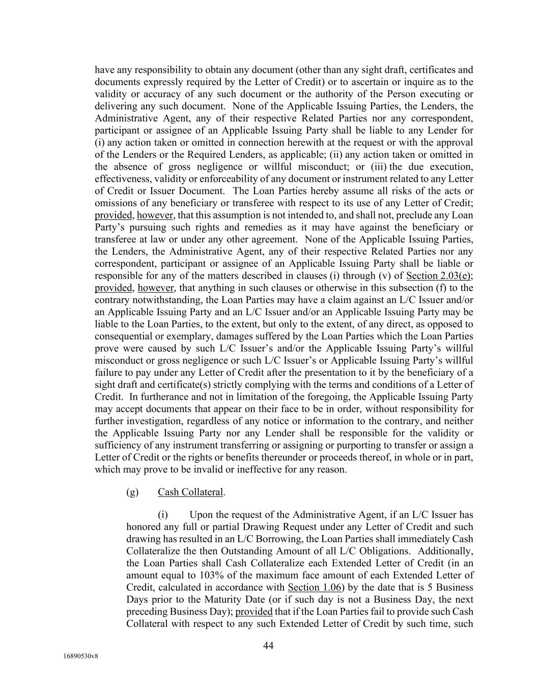 16890530v8 44 have any responsibility to obtain any document (other than any sight draft, certificates and documents expressly required by the Letter of Credit) or to ascertain or inquire as to the validity or accuracy of any such document or the authority of the Person executing or delivering any such document. None of the Applicable Issuing Parties, the Lenders, the Administrative Agent, any of their respective Related Parties nor any correspondent, participant or assignee of an Applicable Issuing Party shall be liable to any Lender for (i) any action taken or omitted in connection herewith at the request or with the approval of the Lenders or the Required Lenders, as applicable; (ii) any action taken or omitted in the absence of gross negligence or willful misconduct; or (iii) the due execution, effectiveness, validity or enforceability of any document or instrument related to any Letter of Credit or Issuer Document. The Loan Parties hereby assume all risks of the acts or omissions of any beneficiary or transferee with respect to its use of any Letter of Credit; provided, however, that this assumption is not intended to, and shall not, preclude any Loan Party’s pursuing such rights and remedies as it may have against the beneficiary or transferee at law or under any other agreement. None of the Applicable Issuing Parties, the Lenders, the Administrative Agent, any of their respective Related Parties nor any correspondent, participant or assignee of an Applicable Issuing Party shall be liable or responsible for any of the matters described in clauses (i) through (v) of Section 2.03(e); provided, however, that anything in such clauses or otherwise in this subsection (f) to the contrary notwithstanding, the Loan Parties may have a claim against an L/C Issuer and/or an Applicable Issuing Party and an L/C Issuer and/or an Applicable Issuing Party may be liable to the Loan Parties, to the extent, but only to the extent, of any direct, as opposed to consequential or exemplary, damages suffered by the Loan Parties which the Loan Parties prove were caused by such L/C Issuer’s and/or the Applicable Issuing Party’s willful misconduct or gross negligence or such L/C Issuer’s or Applicable Issuing Party’s willful failure to pay under any Letter of Credit after the presentation to it by the beneficiary of a sight draft and certificate(s) strictly complying with the terms and conditions of a Letter of Credit. In furtherance and not in limitation of the foregoing, the Applicable Issuing Party may accept documents that appear on their face to be in order, without responsibility for further investigation, regardless of any notice or information to the contrary, and neither the Applicable Issuing Party nor any Lender shall be responsible for the validity or sufficiency of any instrument transferring or assigning or purporting to transfer or assign a Letter of Credit or the rights or benefits thereunder or proceeds thereof, in whole or in part, which may prove to be invalid or ineffective for any reason. (g) Cash Collateral. (i) Upon the request of the Administrative Agent, if an L/C Issuer has honored any full or partial Drawing Request under any Letter of Credit and such drawing has resulted in an L/C Borrowing, the Loan Parties shall immediately Cash Collateralize the then Outstanding Amount of all L/C Obligations. Additionally, the Loan Parties shall Cash Collateralize each Extended Letter of Credit (in an amount equal to 103% of the maximum face amount of each Extended Letter of Credit, calculated in accordance with Section 1.06) by the date that is 5 Business Days prior to the Maturity Date (or if such day is not a Business Day, the next preceding Business Day); provided that if the Loan Parties fail to provide such Cash Collateral with respect to any such Extended Letter of Credit by such time, such