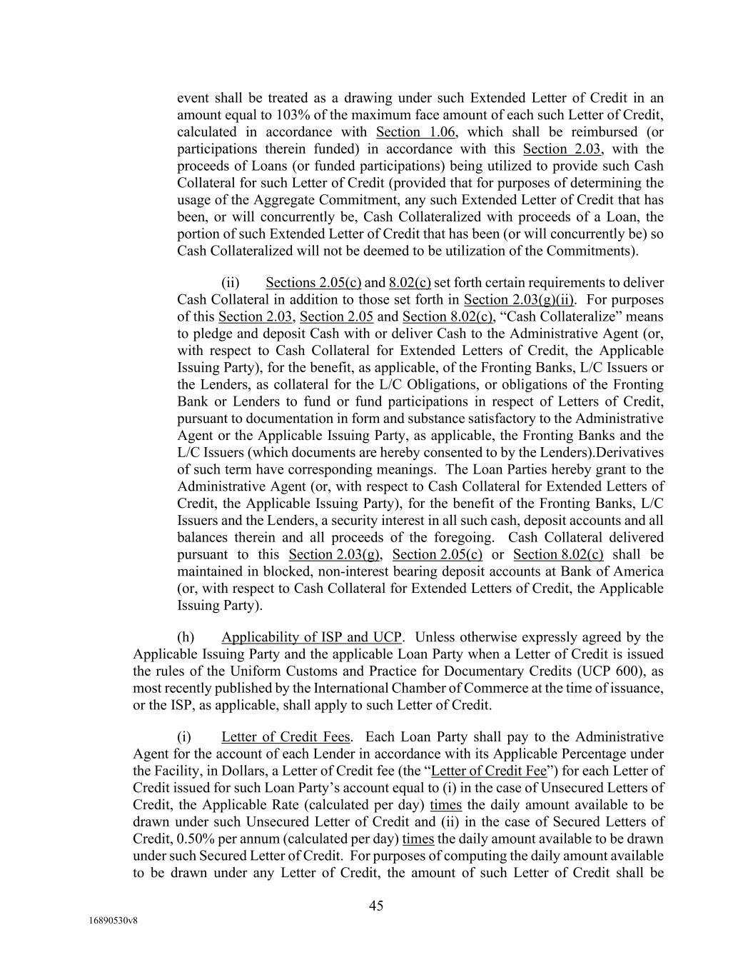 16890530v8 45 event shall be treated as a drawing under such Extended Letter of Credit in an amount equal to 103% of the maximum face amount of each such Letter of Credit, calculated in accordance with Section 1.06, which shall be reimbursed (or participations therein funded) in accordance with this Section 2.03, with the proceeds of Loans (or funded participations) being utilized to provide such Cash Collateral for such Letter of Credit (provided that for purposes of determining the usage of the Aggregate Commitment, any such Extended Letter of Credit that has been, or will concurrently be, Cash Collateralized with proceeds of a Loan, the portion of such Extended Letter of Credit that has been (or will concurrently be) so Cash Collateralized will not be deemed to be utilization of the Commitments). (ii) Sections 2.05(c) and 8.02(c) set forth certain requirements to deliver Cash Collateral in addition to those set forth in Section 2.03(g)(ii). For purposes of this Section 2.03, Section 2.05 and Section 8.02(c), “Cash Collateralize” means to pledge and deposit Cash with or deliver Cash to the Administrative Agent (or, with respect to Cash Collateral for Extended Letters of Credit, the Applicable Issuing Party), for the benefit, as applicable, of the Fronting Banks, L/C Issuers or the Lenders, as collateral for the L/C Obligations, or obligations of the Fronting Bank or Lenders to fund or fund participations in respect of Letters of Credit, pursuant to documentation in form and substance satisfactory to the Administrative Agent or the Applicable Issuing Party, as applicable, the Fronting Banks and the L/C Issuers (which documents are hereby consented to by the Lenders).Derivatives of such term have corresponding meanings. The Loan Parties hereby grant to the Administrative Agent (or, with respect to Cash Collateral for Extended Letters of Credit, the Applicable Issuing Party), for the benefit of the Fronting Banks, L/C Issuers and the Lenders, a security interest in all such cash, deposit accounts and all balances therein and all proceeds of the foregoing. Cash Collateral delivered pursuant to this Section 2.03(g), Section 2.05(c) or Section 8.02(c) shall be maintained in blocked, non-interest bearing deposit accounts at Bank of America (or, with respect to Cash Collateral for Extended Letters of Credit, the Applicable Issuing Party). (h) Applicability of ISP and UCP. Unless otherwise expressly agreed by the Applicable Issuing Party and the applicable Loan Party when a Letter of Credit is issued the rules of the Uniform Customs and Practice for Documentary Credits (UCP 600), as most recently published by the International Chamber of Commerce at the time of issuance, or the ISP, as applicable, shall apply to such Letter of Credit. (i) Letter of Credit Fees. Each Loan Party shall pay to the Administrative Agent for the account of each Lender in accordance with its Applicable Percentage under the Facility, in Dollars, a Letter of Credit fee (the “Letter of Credit Fee”) for each Letter of Credit issued for such Loan Party’s account equal to (i) in the case of Unsecured Letters of Credit, the Applicable Rate (calculated per day) times the daily amount available to be drawn under such Unsecured Letter of Credit and (ii) in the case of Secured Letters of Credit, 0.50% per annum (calculated per day) times the daily amount available to be drawn under such Secured Letter of Credit. For purposes of computing the daily amount available to be drawn under any Letter of Credit, the amount of such Letter of Credit shall be