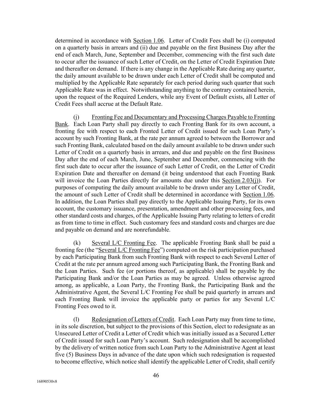 16890530v8 46 determined in accordance with Section 1.06. Letter of Credit Fees shall be (i) computed on a quarterly basis in arrears and (ii) due and payable on the first Business Day after the end of each March, June, September and December, commencing with the first such date to occur after the issuance of such Letter of Credit, on the Letter of Credit Expiration Date and thereafter on demand. If there is any change in the Applicable Rate during any quarter, the daily amount available to be drawn under each Letter of Credit shall be computed and multiplied by the Applicable Rate separately for each period during such quarter that such Applicable Rate was in effect. Notwithstanding anything to the contrary contained herein, upon the request of the Required Lenders, while any Event of Default exists, all Letter of Credit Fees shall accrue at the Default Rate. (j) Fronting Fee and Documentary and Processing Charges Payable to Fronting Bank. Each Loan Party shall pay directly to each Fronting Bank for its own account, a fronting fee with respect to each Fronted Letter of Credit issued for such Loan Party’s account by such Fronting Bank, at the rate per annum agreed to between the Borrower and such Fronting Bank, calculated based on the daily amount available to be drawn under such Letter of Credit on a quarterly basis in arrears, and due and payable on the first Business Day after the end of each March, June, September and December, commencing with the first such date to occur after the issuance of such Letter of Credit, on the Letter of Credit Expiration Date and thereafter on demand (it being understood that each Fronting Bank will invoice the Loan Parties directly for amounts due under this Section 2.03(j)). For purposes of computing the daily amount available to be drawn under any Letter of Credit, the amount of such Letter of Credit shall be determined in accordance with Section 1.06. In addition, the Loan Parties shall pay directly to the Applicable Issuing Party, for its own account, the customary issuance, presentation, amendment and other processing fees, and other standard costs and charges, of the Applicable Issuing Party relating to letters of credit as from time to time in effect. Such customary fees and standard costs and charges are due and payable on demand and are nonrefundable. (k) Several L/C Fronting Fee. The applicable Fronting Bank shall be paid a fronting fee (the “Several L/C Fronting Fee”) computed on the risk participation purchased by each Participating Bank from such Fronting Bank with respect to each Several Letter of Credit at the rate per annum agreed among such Participating Bank, the Fronting Bank and the Loan Parties. Such fee (or portions thereof, as applicable) shall be payable by the Participating Bank and/or the Loan Parties as may be agreed. Unless otherwise agreed among, as applicable, a Loan Party, the Fronting Bank, the Participating Bank and the Administrative Agent, the Several L/C Fronting Fee shall be paid quarterly in arrears and each Fronting Bank will invoice the applicable party or parties for any Several L/C Fronting Fees owed to it. (l) Redesignation of Letters of Credit. Each Loan Party may from time to time, in its sole discretion, but subject to the provisions of this Section, elect to redesignate as an Unsecured Letter of Credit a Letter of Credit which was initially issued as a Secured Letter of Credit issued for such Loan Party’s account. Such redesignation shall be accomplished by the delivery of written notice from such Loan Party to the Administrative Agent at least five (5) Business Days in advance of the date upon which such redesignation is requested to become effective, which notice shall identify the applicable Letter of Credit, shall certify