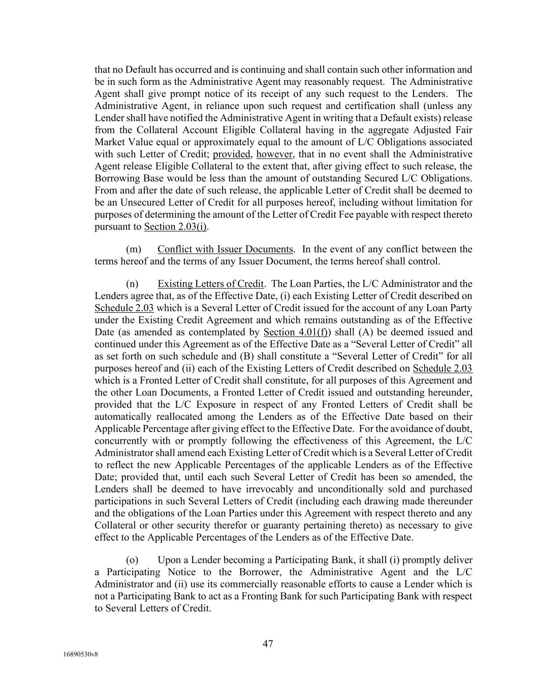 16890530v8 47 that no Default has occurred and is continuing and shall contain such other information and be in such form as the Administrative Agent may reasonably request. The Administrative Agent shall give prompt notice of its receipt of any such request to the Lenders. The Administrative Agent, in reliance upon such request and certification shall (unless any Lender shall have notified the Administrative Agent in writing that a Default exists) release from the Collateral Account Eligible Collateral having in the aggregate Adjusted Fair Market Value equal or approximately equal to the amount of L/C Obligations associated with such Letter of Credit; provided, however, that in no event shall the Administrative Agent release Eligible Collateral to the extent that, after giving effect to such release, the Borrowing Base would be less than the amount of outstanding Secured L/C Obligations. From and after the date of such release, the applicable Letter of Credit shall be deemed to be an Unsecured Letter of Credit for all purposes hereof, including without limitation for purposes of determining the amount of the Letter of Credit Fee payable with respect thereto pursuant to Section 2.03(i). (m) Conflict with Issuer Documents. In the event of any conflict between the terms hereof and the terms of any Issuer Document, the terms hereof shall control. (n) Existing Letters of Credit. The Loan Parties, the L/C Administrator and the Lenders agree that, as of the Effective Date, (i) each Existing Letter of Credit described on Schedule 2.03 which is a Several Letter of Credit issued for the account of any Loan Party under the Existing Credit Agreement and which remains outstanding as of the Effective Date (as amended as contemplated by Section 4.01(f)) shall (A) be deemed issued and continued under this Agreement as of the Effective Date as a “Several Letter of Credit” all as set forth on such schedule and (B) shall constitute a “Several Letter of Credit” for all purposes hereof and (ii) each of the Existing Letters of Credit described on Schedule 2.03 which is a Fronted Letter of Credit shall constitute, for all purposes of this Agreement and the other Loan Documents, a Fronted Letter of Credit issued and outstanding hereunder, provided that the L/C Exposure in respect of any Fronted Letters of Credit shall be automatically reallocated among the Lenders as of the Effective Date based on their Applicable Percentage after giving effect to the Effective Date. For the avoidance of doubt, concurrently with or promptly following the effectiveness of this Agreement, the L/C Administrator shall amend each Existing Letter of Credit which is a Several Letter of Credit to reflect the new Applicable Percentages of the applicable Lenders as of the Effective Date; provided that, until each such Several Letter of Credit has been so amended, the Lenders shall be deemed to have irrevocably and unconditionally sold and purchased participations in such Several Letters of Credit (including each drawing made thereunder and the obligations of the Loan Parties under this Agreement with respect thereto and any Collateral or other security therefor or guaranty pertaining thereto) as necessary to give effect to the Applicable Percentages of the Lenders as of the Effective Date. (o) Upon a Lender becoming a Participating Bank, it shall (i) promptly deliver a Participating Notice to the Borrower, the Administrative Agent and the L/C Administrator and (ii) use its commercially reasonable efforts to cause a Lender which is not a Participating Bank to act as a Fronting Bank for such Participating Bank with respect to Several Letters of Credit.