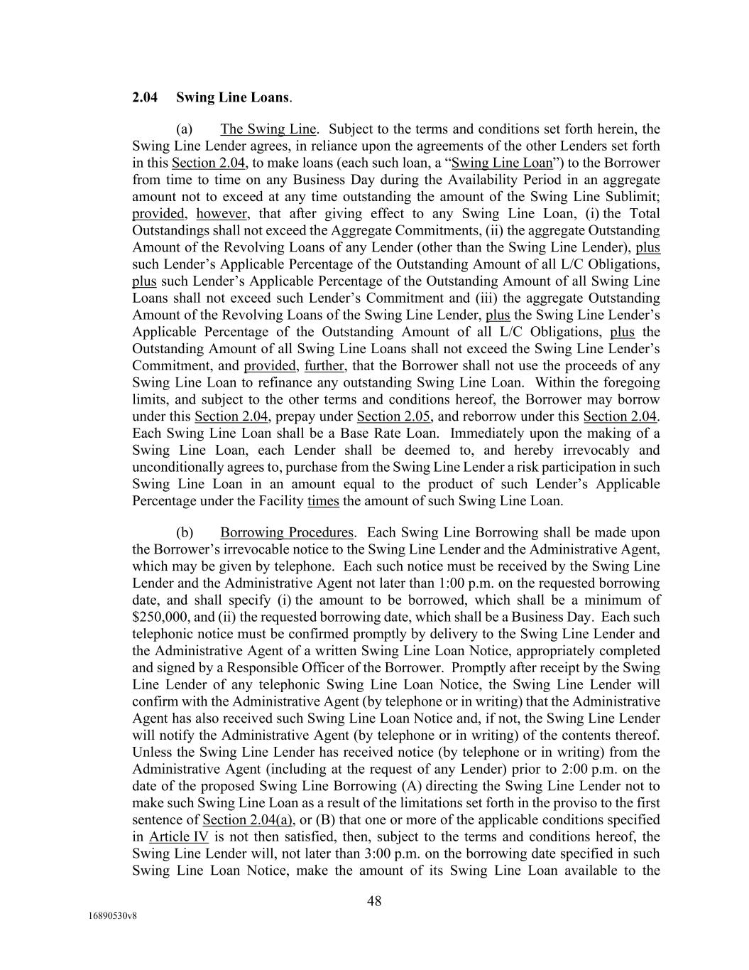 16890530v8 48 2.04 Swing Line Loans. (a) The Swing Line. Subject to the terms and conditions set forth herein, the Swing Line Lender agrees, in reliance upon the agreements of the other Lenders set forth in this Section 2.04, to make loans (each such loan, a “Swing Line Loan”) to the Borrower from time to time on any Business Day during the Availability Period in an aggregate amount not to exceed at any time outstanding the amount of the Swing Line Sublimit; provided, however, that after giving effect to any Swing Line Loan, (i) the Total Outstandings shall not exceed the Aggregate Commitments, (ii) the aggregate Outstanding Amount of the Revolving Loans of any Lender (other than the Swing Line Lender), plus such Lender’s Applicable Percentage of the Outstanding Amount of all L/C Obligations, plus such Lender’s Applicable Percentage of the Outstanding Amount of all Swing Line Loans shall not exceed such Lender’s Commitment and (iii) the aggregate Outstanding Amount of the Revolving Loans of the Swing Line Lender, plus the Swing Line Lender’s Applicable Percentage of the Outstanding Amount of all L/C Obligations, plus the Outstanding Amount of all Swing Line Loans shall not exceed the Swing Line Lender’s Commitment, and provided, further, that the Borrower shall not use the proceeds of any Swing Line Loan to refinance any outstanding Swing Line Loan. Within the foregoing limits, and subject to the other terms and conditions hereof, the Borrower may borrow under this Section 2.04, prepay under Section 2.05, and reborrow under this Section 2.04. Each Swing Line Loan shall be a Base Rate Loan. Immediately upon the making of a Swing Line Loan, each Lender shall be deemed to, and hereby irrevocably and unconditionally agrees to, purchase from the Swing Line Lender a risk participation in such Swing Line Loan in an amount equal to the product of such Lender’s Applicable Percentage under the Facility times the amount of such Swing Line Loan. (b) Borrowing Procedures. Each Swing Line Borrowing shall be made upon the Borrower’s irrevocable notice to the Swing Line Lender and the Administrative Agent, which may be given by telephone. Each such notice must be received by the Swing Line Lender and the Administrative Agent not later than 1:00 p.m. on the requested borrowing date, and shall specify (i) the amount to be borrowed, which shall be a minimum of $250,000, and (ii) the requested borrowing date, which shall be a Business Day. Each such telephonic notice must be confirmed promptly by delivery to the Swing Line Lender and the Administrative Agent of a written Swing Line Loan Notice, appropriately completed and signed by a Responsible Officer of the Borrower. Promptly after receipt by the Swing Line Lender of any telephonic Swing Line Loan Notice, the Swing Line Lender will confirm with the Administrative Agent (by telephone or in writing) that the Administrative Agent has also received such Swing Line Loan Notice and, if not, the Swing Line Lender will notify the Administrative Agent (by telephone or in writing) of the contents thereof. Unless the Swing Line Lender has received notice (by telephone or in writing) from the Administrative Agent (including at the request of any Lender) prior to 2:00 p.m. on the date of the proposed Swing Line Borrowing (A) directing the Swing Line Lender not to make such Swing Line Loan as a result of the limitations set forth in the proviso to the first sentence of Section 2.04(a), or (B) that one or more of the applicable conditions specified in Article IV is not then satisfied, then, subject to the terms and conditions hereof, the Swing Line Lender will, not later than 3:00 p.m. on the borrowing date specified in such Swing Line Loan Notice, make the amount of its Swing Line Loan available to the