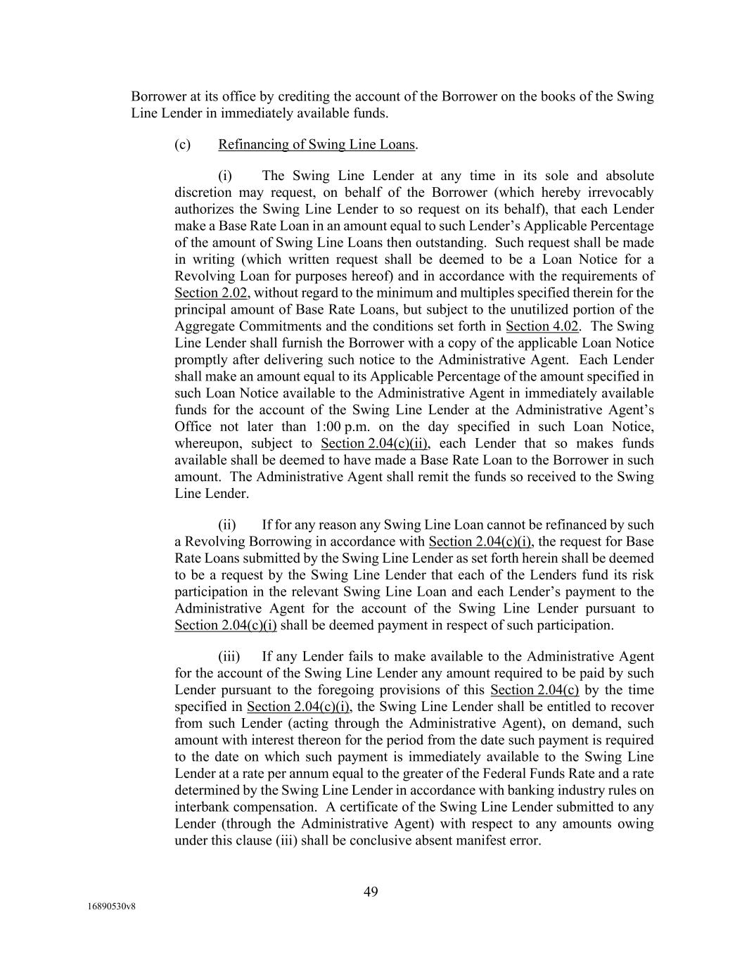 16890530v8 49 Borrower at its office by crediting the account of the Borrower on the books of the Swing Line Lender in immediately available funds. (c) Refinancing of Swing Line Loans. (i) The Swing Line Lender at any time in its sole and absolute discretion may request, on behalf of the Borrower (which hereby irrevocably authorizes the Swing Line Lender to so request on its behalf), that each Lender make a Base Rate Loan in an amount equal to such Lender’s Applicable Percentage of the amount of Swing Line Loans then outstanding. Such request shall be made in writing (which written request shall be deemed to be a Loan Notice for a Revolving Loan for purposes hereof) and in accordance with the requirements of Section 2.02, without regard to the minimum and multiples specified therein for the principal amount of Base Rate Loans, but subject to the unutilized portion of the Aggregate Commitments and the conditions set forth in Section 4.02. The Swing Line Lender shall furnish the Borrower with a copy of the applicable Loan Notice promptly after delivering such notice to the Administrative Agent. Each Lender shall make an amount equal to its Applicable Percentage of the amount specified in such Loan Notice available to the Administrative Agent in immediately available funds for the account of the Swing Line Lender at the Administrative Agent’s Office not later than 1:00 p.m. on the day specified in such Loan Notice, whereupon, subject to Section 2.04(c)(ii), each Lender that so makes funds available shall be deemed to have made a Base Rate Loan to the Borrower in such amount. The Administrative Agent shall remit the funds so received to the Swing Line Lender. (ii) If for any reason any Swing Line Loan cannot be refinanced by such a Revolving Borrowing in accordance with Section 2.04(c)(i), the request for Base Rate Loans submitted by the Swing Line Lender as set forth herein shall be deemed to be a request by the Swing Line Lender that each of the Lenders fund its risk participation in the relevant Swing Line Loan and each Lender’s payment to the Administrative Agent for the account of the Swing Line Lender pursuant to Section 2.04(c)(i) shall be deemed payment in respect of such participation. (iii) If any Lender fails to make available to the Administrative Agent for the account of the Swing Line Lender any amount required to be paid by such Lender pursuant to the foregoing provisions of this Section 2.04(c) by the time specified in Section 2.04(c)(i), the Swing Line Lender shall be entitled to recover from such Lender (acting through the Administrative Agent), on demand, such amount with interest thereon for the period from the date such payment is required to the date on which such payment is immediately available to the Swing Line Lender at a rate per annum equal to the greater of the Federal Funds Rate and a rate determined by the Swing Line Lender in accordance with banking industry rules on interbank compensation. A certificate of the Swing Line Lender submitted to any Lender (through the Administrative Agent) with respect to any amounts owing under this clause (iii) shall be conclusive absent manifest error.