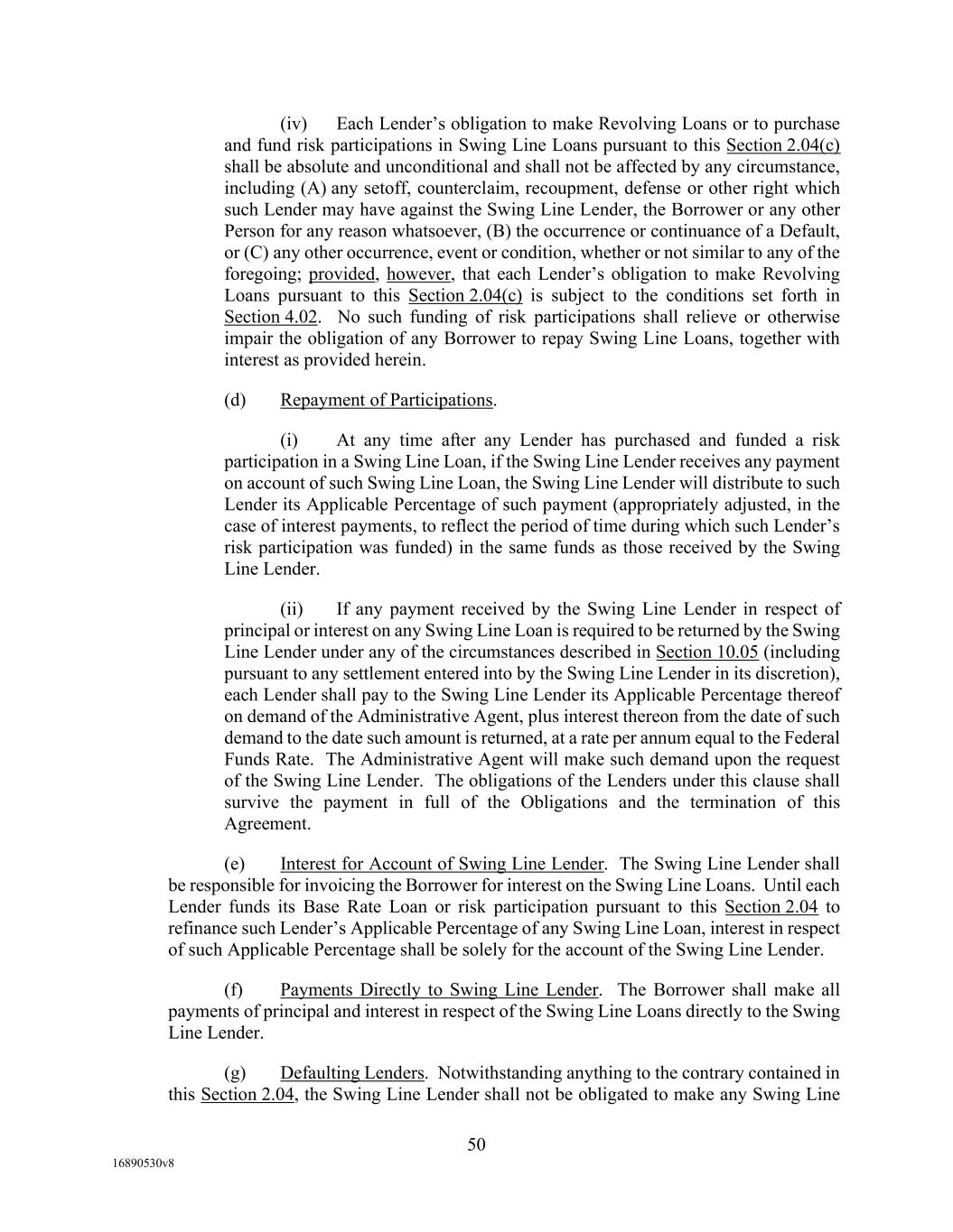 16890530v8 50 (iv) Each Lender’s obligation to make Revolving Loans or to purchase and fund risk participations in Swing Line Loans pursuant to this Section 2.04(c) shall be absolute and unconditional and shall not be affected by any circumstance, including (A) any setoff, counterclaim, recoupment, defense or other right which such Lender may have against the Swing Line Lender, the Borrower or any other Person for any reason whatsoever, (B) the occurrence or continuance of a Default, or (C) any other occurrence, event or condition, whether or not similar to any of the foregoing; provided, however, that each Lender’s obligation to make Revolving Loans pursuant to this Section 2.04(c) is subject to the conditions set forth in Section 4.02. No such funding of risk participations shall relieve or otherwise impair the obligation of any Borrower to repay Swing Line Loans, together with interest as provided herein. (d) Repayment of Participations. (i) At any time after any Lender has purchased and funded a risk participation in a Swing Line Loan, if the Swing Line Lender receives any payment on account of such Swing Line Loan, the Swing Line Lender will distribute to such Lender its Applicable Percentage of such payment (appropriately adjusted, in the case of interest payments, to reflect the period of time during which such Lender’s risk participation was funded) in the same funds as those received by the Swing Line Lender. (ii) If any payment received by the Swing Line Lender in respect of principal or interest on any Swing Line Loan is required to be returned by the Swing Line Lender under any of the circumstances described in Section 10.05 (including pursuant to any settlement entered into by the Swing Line Lender in its discretion), each Lender shall pay to the Swing Line Lender its Applicable Percentage thereof on demand of the Administrative Agent, plus interest thereon from the date of such demand to the date such amount is returned, at a rate per annum equal to the Federal Funds Rate. The Administrative Agent will make such demand upon the request of the Swing Line Lender. The obligations of the Lenders under this clause shall survive the payment in full of the Obligations and the termination of this Agreement. (e) Interest for Account of Swing Line Lender. The Swing Line Lender shall be responsible for invoicing the Borrower for interest on the Swing Line Loans. Until each Lender funds its Base Rate Loan or risk participation pursuant to this Section 2.04 to refinance such Lender’s Applicable Percentage of any Swing Line Loan, interest in respect of such Applicable Percentage shall be solely for the account of the Swing Line Lender. (f) Payments Directly to Swing Line Lender. The Borrower shall make all payments of principal and interest in respect of the Swing Line Loans directly to the Swing Line Lender. (g) Defaulting Lenders. Notwithstanding anything to the contrary contained in this Section 2.04, the Swing Line Lender shall not be obligated to make any Swing Line