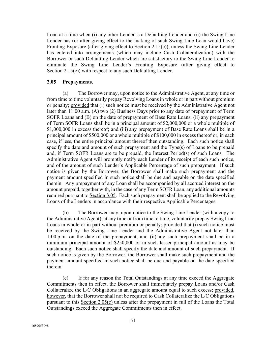 16890530v8 51 Loan at a time when (i) any other Lender is a Defaulting Lender and (ii) the Swing Line Lender has (or after giving effect to the making of such Swing Line Loan would have) Fronting Exposure (after giving effect to Section 2.15(c)), unless the Swing Line Lender has entered into arrangements (which may include Cash Collateralization) with the Borrower or such Defaulting Lender which are satisfactory to the Swing Line Lender to eliminate the Swing Line Lender’s Fronting Exposure (after giving effect to Section 2.15(c)) with respect to any such Defaulting Lender. 2.05 Prepayments. (a) The Borrower may, upon notice to the Administrative Agent, at any time or from time to time voluntarily prepay Revolving Loans in whole or in part without premium or penalty; provided that (i) such notice must be received by the Administrative Agent not later than 11:00 a.m. (A) two (2) Business Days prior to any date of prepayment of Term SOFR Loans and (B) on the date of prepayment of Base Rate Loans; (ii) any prepayment of Term SOFR Loans shall be in a principal amount of $2,000,000 or a whole multiple of $1,000,000 in excess thereof; and (iii) any prepayment of Base Rate Loans shall be in a principal amount of $500,000 or a whole multiple of $100,000 in excess thereof or, in each case, if less, the entire principal amount thereof then outstanding. Each such notice shall specify the date and amount of such prepayment and the Type(s) of Loans to be prepaid and, if Term SOFR Loans are to be prepaid, the Interest Period(s) of such Loans. The Administrative Agent will promptly notify each Lender of its receipt of each such notice, and of the amount of such Lender’s Applicable Percentage of such prepayment. If such notice is given by the Borrower, the Borrower shall make such prepayment and the payment amount specified in such notice shall be due and payable on the date specified therein. Any prepayment of any Loan shall be accompanied by all accrued interest on the amount prepaid, together with, in the case of any Term SOFR Loan, any additional amounts required pursuant to Section 3.05. Each such prepayment shall be applied to the Revolving Loans of the Lenders in accordance with their respective Applicable Percentages. (b) The Borrower may, upon notice to the Swing Line Lender (with a copy to the Administrative Agent), at any time or from time to time, voluntarily prepay Swing Line Loans in whole or in part without premium or penalty; provided that (i) such notice must be received by the Swing Line Lender and the Administrative Agent not later than 1:00 p.m. on the date of the prepayment, and (ii) any such prepayment shall be in a minimum principal amount of $250,000 or in such lesser principal amount as may be outstanding. Each such notice shall specify the date and amount of such prepayment. If such notice is given by the Borrower, the Borrower shall make such prepayment and the payment amount specified in such notice shall be due and payable on the date specified therein. (c) If for any reason the Total Outstandings at any time exceed the Aggregate Commitments then in effect, the Borrower shall immediately prepay Loans and/or Cash Collateralize the L/C Obligations in an aggregate amount equal to such excess; provided, however, that the Borrower shall not be required to Cash Collateralize the L/C Obligations pursuant to this Section 2.05(c) unless after the prepayment in full of the Loans the Total Outstandings exceed the Aggregate Commitments then in effect.