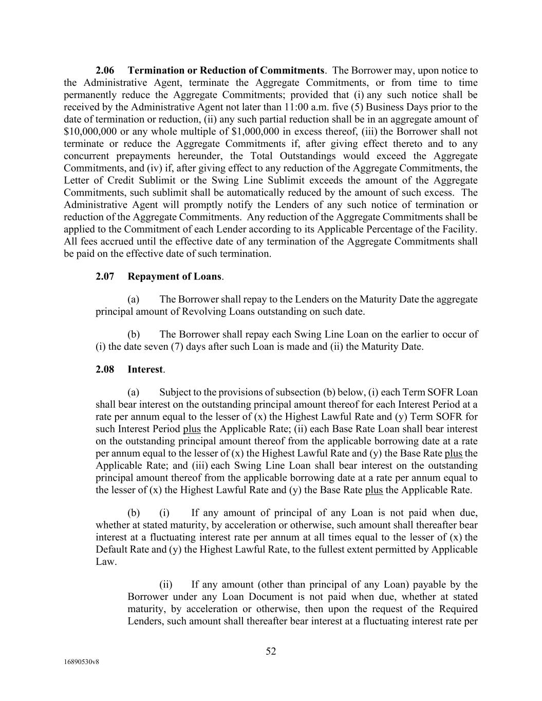 16890530v8 52 2.06 Termination or Reduction of Commitments. The Borrower may, upon notice to the Administrative Agent, terminate the Aggregate Commitments, or from time to time permanently reduce the Aggregate Commitments; provided that (i) any such notice shall be received by the Administrative Agent not later than 11:00 a.m. five (5) Business Days prior to the date of termination or reduction, (ii) any such partial reduction shall be in an aggregate amount of $10,000,000 or any whole multiple of $1,000,000 in excess thereof, (iii) the Borrower shall not terminate or reduce the Aggregate Commitments if, after giving effect thereto and to any concurrent prepayments hereunder, the Total Outstandings would exceed the Aggregate Commitments, and (iv) if, after giving effect to any reduction of the Aggregate Commitments, the Letter of Credit Sublimit or the Swing Line Sublimit exceeds the amount of the Aggregate Commitments, such sublimit shall be automatically reduced by the amount of such excess. The Administrative Agent will promptly notify the Lenders of any such notice of termination or reduction of the Aggregate Commitments. Any reduction of the Aggregate Commitments shall be applied to the Commitment of each Lender according to its Applicable Percentage of the Facility. All fees accrued until the effective date of any termination of the Aggregate Commitments shall be paid on the effective date of such termination. 2.07 Repayment of Loans. (a) The Borrower shall repay to the Lenders on the Maturity Date the aggregate principal amount of Revolving Loans outstanding on such date. (b) The Borrower shall repay each Swing Line Loan on the earlier to occur of (i) the date seven (7) days after such Loan is made and (ii) the Maturity Date. 2.08 Interest. (a) Subject to the provisions of subsection (b) below, (i) each Term SOFR Loan shall bear interest on the outstanding principal amount thereof for each Interest Period at a rate per annum equal to the lesser of (x) the Highest Lawful Rate and (y) Term SOFR for such Interest Period plus the Applicable Rate; (ii) each Base Rate Loan shall bear interest on the outstanding principal amount thereof from the applicable borrowing date at a rate per annum equal to the lesser of (x) the Highest Lawful Rate and (y) the Base Rate plus the Applicable Rate; and (iii) each Swing Line Loan shall bear interest on the outstanding principal amount thereof from the applicable borrowing date at a rate per annum equal to the lesser of (x) the Highest Lawful Rate and (y) the Base Rate plus the Applicable Rate. (b) (i) If any amount of principal of any Loan is not paid when due, whether at stated maturity, by acceleration or otherwise, such amount shall thereafter bear interest at a fluctuating interest rate per annum at all times equal to the lesser of (x) the Default Rate and (y) the Highest Lawful Rate, to the fullest extent permitted by Applicable Law. (ii) If any amount (other than principal of any Loan) payable by the Borrower under any Loan Document is not paid when due, whether at stated maturity, by acceleration or otherwise, then upon the request of the Required Lenders, such amount shall thereafter bear interest at a fluctuating interest rate per