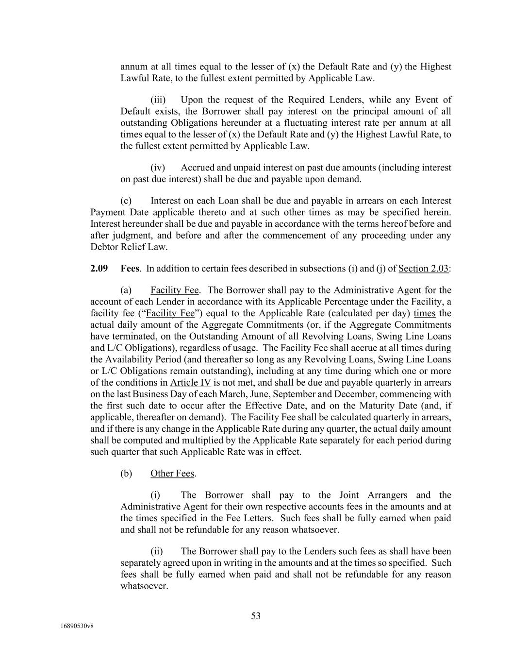 16890530v8 53 annum at all times equal to the lesser of (x) the Default Rate and (y) the Highest Lawful Rate, to the fullest extent permitted by Applicable Law. (iii) Upon the request of the Required Lenders, while any Event of Default exists, the Borrower shall pay interest on the principal amount of all outstanding Obligations hereunder at a fluctuating interest rate per annum at all times equal to the lesser of (x) the Default Rate and (y) the Highest Lawful Rate, to the fullest extent permitted by Applicable Law. (iv) Accrued and unpaid interest on past due amounts (including interest on past due interest) shall be due and payable upon demand. (c) Interest on each Loan shall be due and payable in arrears on each Interest Payment Date applicable thereto and at such other times as may be specified herein. Interest hereunder shall be due and payable in accordance with the terms hereof before and after judgment, and before and after the commencement of any proceeding under any Debtor Relief Law. 2.09 Fees. In addition to certain fees described in subsections (i) and (j) of Section 2.03: (a) Facility Fee. The Borrower shall pay to the Administrative Agent for the account of each Lender in accordance with its Applicable Percentage under the Facility, a facility fee (“Facility Fee”) equal to the Applicable Rate (calculated per day) times the actual daily amount of the Aggregate Commitments (or, if the Aggregate Commitments have terminated, on the Outstanding Amount of all Revolving Loans, Swing Line Loans and L/C Obligations), regardless of usage. The Facility Fee shall accrue at all times during the Availability Period (and thereafter so long as any Revolving Loans, Swing Line Loans or L/C Obligations remain outstanding), including at any time during which one or more of the conditions in Article IV is not met, and shall be due and payable quarterly in arrears on the last Business Day of each March, June, September and December, commencing with the first such date to occur after the Effective Date, and on the Maturity Date (and, if applicable, thereafter on demand). The Facility Fee shall be calculated quarterly in arrears, and if there is any change in the Applicable Rate during any quarter, the actual daily amount shall be computed and multiplied by the Applicable Rate separately for each period during such quarter that such Applicable Rate was in effect. (b) Other Fees. (i) The Borrower shall pay to the Joint Arrangers and the Administrative Agent for their own respective accounts fees in the amounts and at the times specified in the Fee Letters. Such fees shall be fully earned when paid and shall not be refundable for any reason whatsoever. (ii) The Borrower shall pay to the Lenders such fees as shall have been separately agreed upon in writing in the amounts and at the times so specified. Such fees shall be fully earned when paid and shall not be refundable for any reason whatsoever.