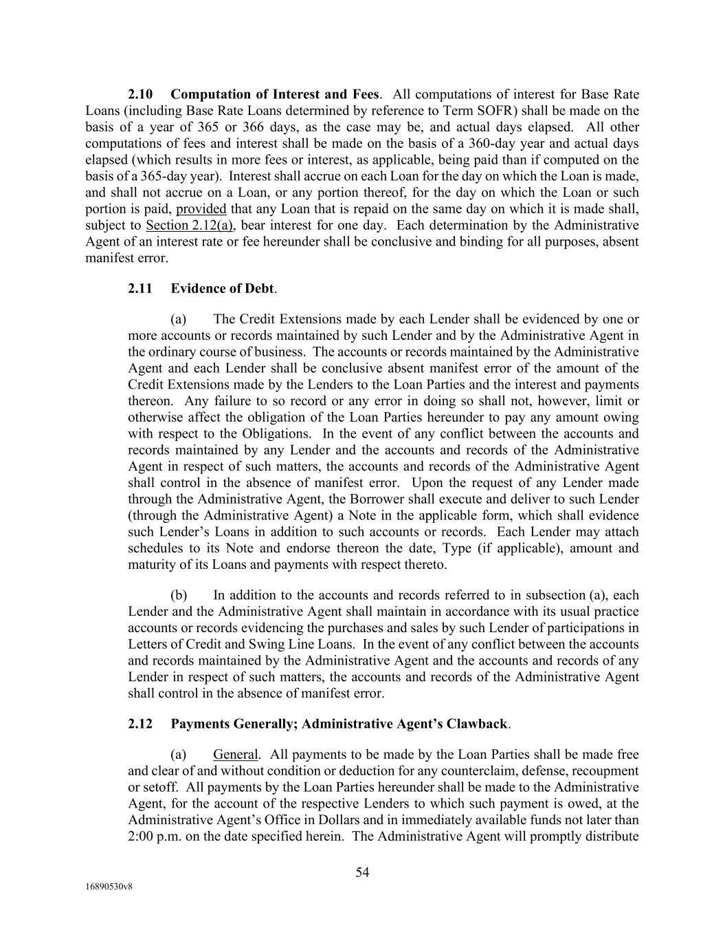 16890530v8 54 2.10 Computation of Interest and Fees. All computations of interest for Base Rate Loans (including Base Rate Loans determined by reference to Term SOFR) shall be made on the basis of a year of 365 or 366 days, as the case may be, and actual days elapsed. All other computations of fees and interest shall be made on the basis of a 360-day year and actual days elapsed (which results in more fees or interest, as applicable, being paid than if computed on the basis of a 365-day year). Interest shall accrue on each Loan for the day on which the Loan is made, and shall not accrue on a Loan, or any portion thereof, for the day on which the Loan or such portion is paid, provided that any Loan that is repaid on the same day on which it is made shall, subject to Section 2.12(a), bear interest for one day. Each determination by the Administrative Agent of an interest rate or fee hereunder shall be conclusive and binding for all purposes, absent manifest error. 2.11 Evidence of Debt. (a) The Credit Extensions made by each Lender shall be evidenced by one or more accounts or records maintained by such Lender and by the Administrative Agent in the ordinary course of business. The accounts or records maintained by the Administrative Agent and each Lender shall be conclusive absent manifest error of the amount of the Credit Extensions made by the Lenders to the Loan Parties and the interest and payments thereon. Any failure to so record or any error in doing so shall not, however, limit or otherwise affect the obligation of the Loan Parties hereunder to pay any amount owing with respect to the Obligations. In the event of any conflict between the accounts and records maintained by any Lender and the accounts and records of the Administrative Agent in respect of such matters, the accounts and records of the Administrative Agent shall control in the absence of manifest error. Upon the request of any Lender made through the Administrative Agent, the Borrower shall execute and deliver to such Lender (through the Administrative Agent) a Note in the applicable form, which shall evidence such Lender’s Loans in addition to such accounts or records. Each Lender may attach schedules to its Note and endorse thereon the date, Type (if applicable), amount and maturity of its Loans and payments with respect thereto. (b) In addition to the accounts and records referred to in subsection (a), each Lender and the Administrative Agent shall maintain in accordance with its usual practice accounts or records evidencing the purchases and sales by such Lender of participations in Letters of Credit and Swing Line Loans. In the event of any conflict between the accounts and records maintained by the Administrative Agent and the accounts and records of any Lender in respect of such matters, the accounts and records of the Administrative Agent shall control in the absence of manifest error. 2.12 Payments Generally; Administrative Agent’s Clawback. (a) General. All payments to be made by the Loan Parties shall be made free and clear of and without condition or deduction for any counterclaim, defense, recoupment or setoff. All payments by the Loan Parties hereunder shall be made to the Administrative Agent, for the account of the respective Lenders to which such payment is owed, at the Administrative Agent’s Office in Dollars and in immediately available funds not later than 2:00 p.m. on the date specified herein. The Administrative Agent will promptly distribute