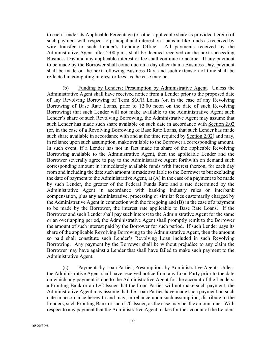 16890530v8 55 to each Lender its Applicable Percentage (or other applicable share as provided herein) of such payment with respect to principal and interest on Loans in like funds as received by wire transfer to such Lender’s Lending Office. All payments received by the Administrative Agent after 2:00 p.m., shall be deemed received on the next succeeding Business Day and any applicable interest or fee shall continue to accrue. If any payment to be made by the Borrower shall come due on a day other than a Business Day, payment shall be made on the next following Business Day, and such extension of time shall be reflected in computing interest or fees, as the case may be. (b) Funding by Lenders; Presumption by Administrative Agent. Unless the Administrative Agent shall have received notice from a Lender prior to the proposed date of any Revolving Borrowing of Term SOFR Loans (or, in the case of any Revolving Borrowing of Base Rate Loans, prior to 12:00 noon on the date of such Revolving Borrowing) that such Lender will not make available to the Administrative Agent such Lender’s share of such Revolving Borrowing, the Administrative Agent may assume that such Lender has made such share available on such date in accordance with Section 2.02 (or, in the case of a Revolving Borrowing of Base Rate Loans, that such Lender has made such share available in accordance with and at the time required by Section 2.02) and may, in reliance upon such assumption, make available to the Borrower a corresponding amount. In such event, if a Lender has not in fact made its share of the applicable Revolving Borrowing available to the Administrative Agent, then the applicable Lender and the Borrower severally agree to pay to the Administrative Agent forthwith on demand such corresponding amount in immediately available funds with interest thereon, for each day from and including the date such amount is made available to the Borrower to but excluding the date of payment to the Administrative Agent, at (A) in the case of a payment to be made by such Lender, the greater of the Federal Funds Rate and a rate determined by the Administrative Agent in accordance with banking industry rules on interbank compensation, plus any administrative, processing or similar fees customarily charged by the Administrative Agent in connection with the foregoing and (B) in the case of a payment to be made by the Borrower, the interest rate applicable to Base Rate Loans. If the Borrower and such Lender shall pay such interest to the Administrative Agent for the same or an overlapping period, the Administrative Agent shall promptly remit to the Borrower the amount of such interest paid by the Borrower for such period. If such Lender pays its share of the applicable Revolving Borrowing to the Administrative Agent, then the amount so paid shall constitute such Lender’s Revolving Loan included in such Revolving Borrowing. Any payment by the Borrower shall be without prejudice to any claim the Borrower may have against a Lender that shall have failed to make such payment to the Administrative Agent. (c) Payments by Loan Parties; Presumptions by Administrative Agent. Unless the Administrative Agent shall have received notice from any Loan Party prior to the date on which any payment is due to the Administrative Agent for the account of the Lenders, a Fronting Bank or an L/C Issuer that the Loan Parties will not make such payment, the Administrative Agent may assume that the Loan Parties have made such payment on such date in accordance herewith and may, in reliance upon such assumption, distribute to the Lenders, such Fronting Bank or such L/C Issuer, as the case may be, the amount due. With respect to any payment that the Administrative Agent makes for the account of the Lenders