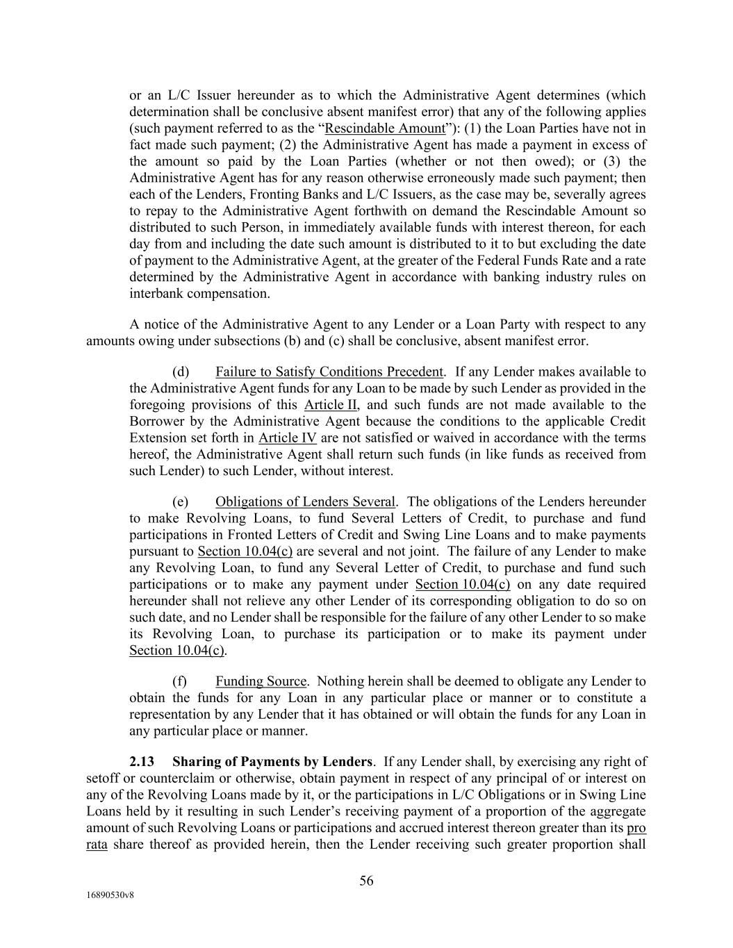 16890530v8 56 or an L/C Issuer hereunder as to which the Administrative Agent determines (which determination shall be conclusive absent manifest error) that any of the following applies (such payment referred to as the “Rescindable Amount”): (1) the Loan Parties have not in fact made such payment; (2) the Administrative Agent has made a payment in excess of the amount so paid by the Loan Parties (whether or not then owed); or (3) the Administrative Agent has for any reason otherwise erroneously made such payment; then each of the Lenders, Fronting Banks and L/C Issuers, as the case may be, severally agrees to repay to the Administrative Agent forthwith on demand the Rescindable Amount so distributed to such Person, in immediately available funds with interest thereon, for each day from and including the date such amount is distributed to it to but excluding the date of payment to the Administrative Agent, at the greater of the Federal Funds Rate and a rate determined by the Administrative Agent in accordance with banking industry rules on interbank compensation. A notice of the Administrative Agent to any Lender or a Loan Party with respect to any amounts owing under subsections (b) and (c) shall be conclusive, absent manifest error. (d) Failure to Satisfy Conditions Precedent. If any Lender makes available to the Administrative Agent funds for any Loan to be made by such Lender as provided in the foregoing provisions of this Article II, and such funds are not made available to the Borrower by the Administrative Agent because the conditions to the applicable Credit Extension set forth in Article IV are not satisfied or waived in accordance with the terms hereof, the Administrative Agent shall return such funds (in like funds as received from such Lender) to such Lender, without interest. (e) Obligations of Lenders Several. The obligations of the Lenders hereunder to make Revolving Loans, to fund Several Letters of Credit, to purchase and fund participations in Fronted Letters of Credit and Swing Line Loans and to make payments pursuant to Section 10.04(c) are several and not joint. The failure of any Lender to make any Revolving Loan, to fund any Several Letter of Credit, to purchase and fund such participations or to make any payment under Section 10.04(c) on any date required hereunder shall not relieve any other Lender of its corresponding obligation to do so on such date, and no Lender shall be responsible for the failure of any other Lender to so make its Revolving Loan, to purchase its participation or to make its payment under Section 10.04(c). (f) Funding Source. Nothing herein shall be deemed to obligate any Lender to obtain the funds for any Loan in any particular place or manner or to constitute a representation by any Lender that it has obtained or will obtain the funds for any Loan in any particular place or manner. 2.13 Sharing of Payments by Lenders. If any Lender shall, by exercising any right of setoff or counterclaim or otherwise, obtain payment in respect of any principal of or interest on any of the Revolving Loans made by it, or the participations in L/C Obligations or in Swing Line Loans held by it resulting in such Lender’s receiving payment of a proportion of the aggregate amount of such Revolving Loans or participations and accrued interest thereon greater than its pro rata share thereof as provided herein, then the Lender receiving such greater proportion shall
