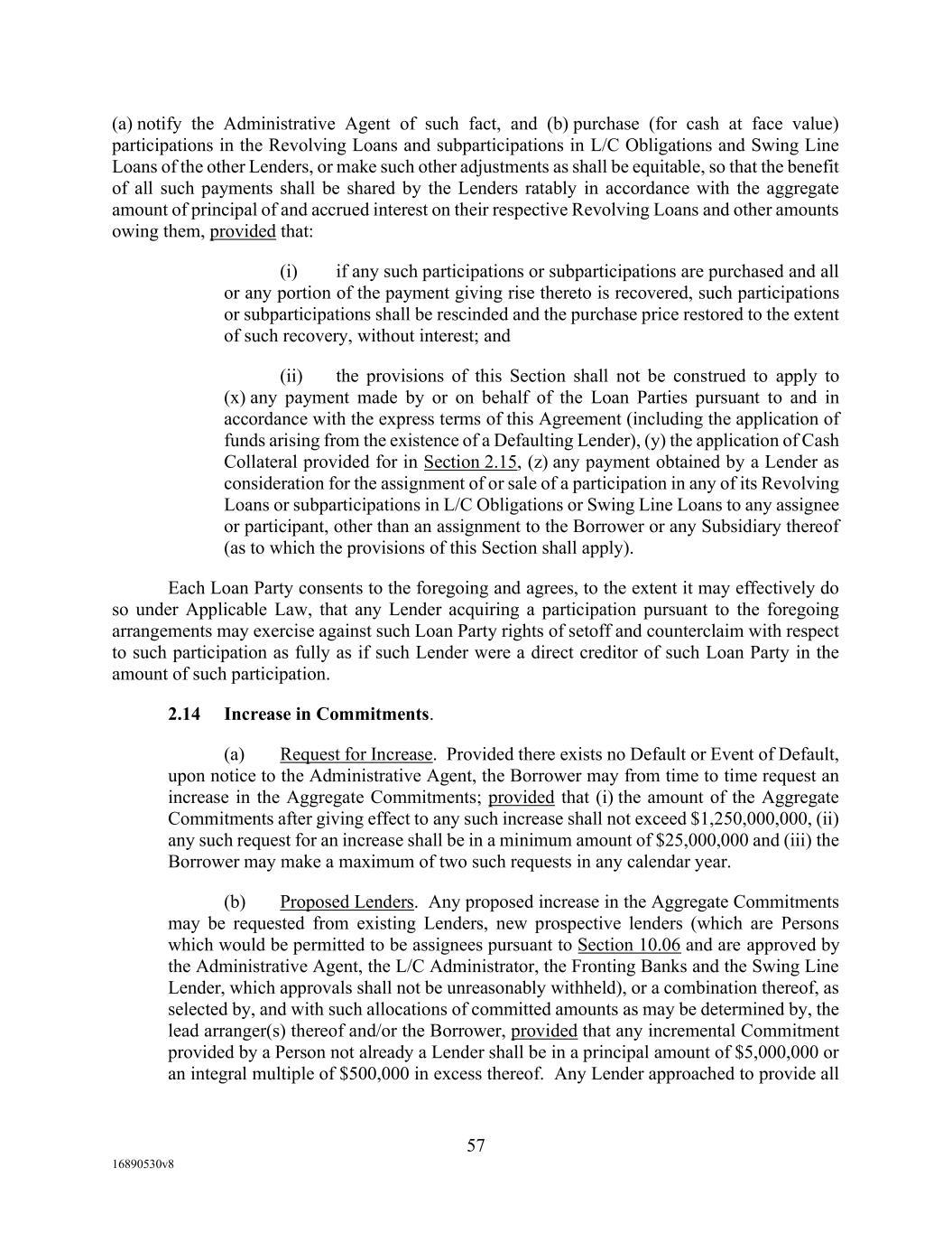 16890530v8 57 (a) notify the Administrative Agent of such fact, and (b) purchase (for cash at face value) participations in the Revolving Loans and subparticipations in L/C Obligations and Swing Line Loans of the other Lenders, or make such other adjustments as shall be equitable, so that the benefit of all such payments shall be shared by the Lenders ratably in accordance with the aggregate amount of principal of and accrued interest on their respective Revolving Loans and other amounts owing them, provided that: (i) if any such participations or subparticipations are purchased and all or any portion of the payment giving rise thereto is recovered, such participations or subparticipations shall be rescinded and the purchase price restored to the extent of such recovery, without interest; and (ii) the provisions of this Section shall not be construed to apply to (x) any payment made by or on behalf of the Loan Parties pursuant to and in accordance with the express terms of this Agreement (including the application of funds arising from the existence of a Defaulting Lender), (y) the application of Cash Collateral provided for in Section 2.15, (z) any payment obtained by a Lender as consideration for the assignment of or sale of a participation in any of its Revolving Loans or subparticipations in L/C Obligations or Swing Line Loans to any assignee or participant, other than an assignment to the Borrower or any Subsidiary thereof (as to which the provisions of this Section shall apply). Each Loan Party consents to the foregoing and agrees, to the extent it may effectively do so under Applicable Law, that any Lender acquiring a participation pursuant to the foregoing arrangements may exercise against such Loan Party rights of setoff and counterclaim with respect to such participation as fully as if such Lender were a direct creditor of such Loan Party in the amount of such participation. 2.14 Increase in Commitments. (a) Request for Increase. Provided there exists no Default or Event of Default, upon notice to the Administrative Agent, the Borrower may from time to time request an increase in the Aggregate Commitments; provided that (i) the amount of the Aggregate Commitments after giving effect to any such increase shall not exceed $1,250,000,000, (ii) any such request for an increase shall be in a minimum amount of $25,000,000 and (iii) the Borrower may make a maximum of two such requests in any calendar year. (b) Proposed Lenders. Any proposed increase in the Aggregate Commitments may be requested from existing Lenders, new prospective lenders (which are Persons which would be permitted to be assignees pursuant to Section 10.06 and are approved by the Administrative Agent, the L/C Administrator, the Fronting Banks and the Swing Line Lender, which approvals shall not be unreasonably withheld), or a combination thereof, as selected by, and with such allocations of committed amounts as may be determined by, the lead arranger(s) thereof and/or the Borrower, provided that any incremental Commitment provided by a Person not already a Lender shall be in a principal amount of $5,000,000 or an integral multiple of $500,000 in excess thereof. Any Lender approached to provide all