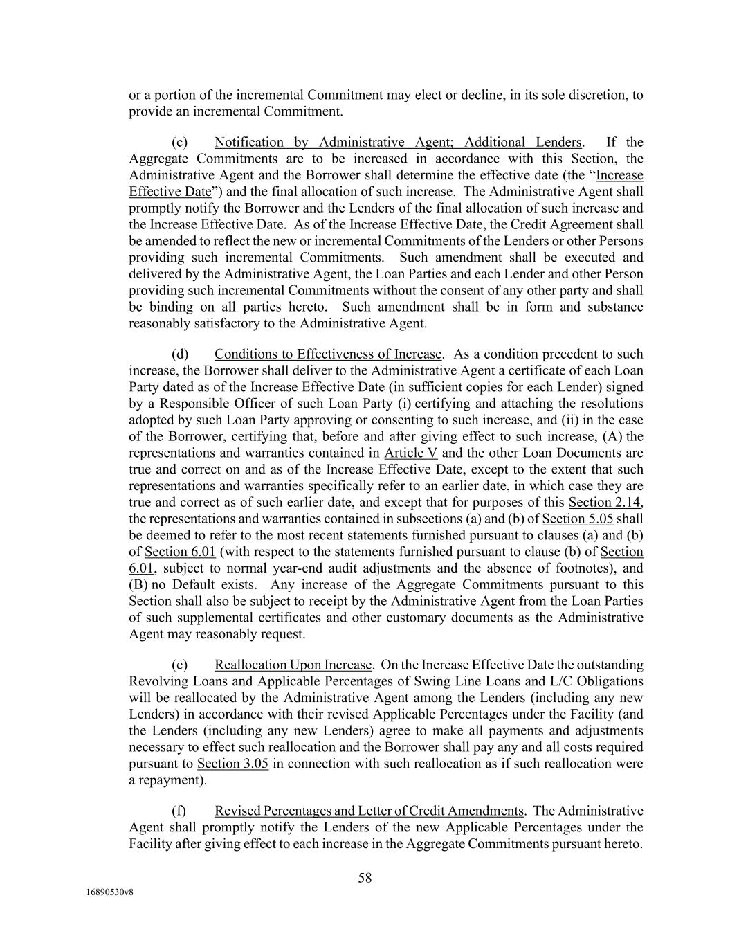16890530v8 58 or a portion of the incremental Commitment may elect or decline, in its sole discretion, to provide an incremental Commitment. (c) Notification by Administrative Agent; Additional Lenders. If the Aggregate Commitments are to be increased in accordance with this Section, the Administrative Agent and the Borrower shall determine the effective date (the “Increase Effective Date”) and the final allocation of such increase. The Administrative Agent shall promptly notify the Borrower and the Lenders of the final allocation of such increase and the Increase Effective Date. As of the Increase Effective Date, the Credit Agreement shall be amended to reflect the new or incremental Commitments of the Lenders or other Persons providing such incremental Commitments. Such amendment shall be executed and delivered by the Administrative Agent, the Loan Parties and each Lender and other Person providing such incremental Commitments without the consent of any other party and shall be binding on all parties hereto. Such amendment shall be in form and substance reasonably satisfactory to the Administrative Agent. (d) Conditions to Effectiveness of Increase. As a condition precedent to such increase, the Borrower shall deliver to the Administrative Agent a certificate of each Loan Party dated as of the Increase Effective Date (in sufficient copies for each Lender) signed by a Responsible Officer of such Loan Party (i) certifying and attaching the resolutions adopted by such Loan Party approving or consenting to such increase, and (ii) in the case of the Borrower, certifying that, before and after giving effect to such increase, (A) the representations and warranties contained in Article V and the other Loan Documents are true and correct on and as of the Increase Effective Date, except to the extent that such representations and warranties specifically refer to an earlier date, in which case they are true and correct as of such earlier date, and except that for purposes of this Section 2.14, the representations and warranties contained in subsections (a) and (b) of Section 5.05 shall be deemed to refer to the most recent statements furnished pursuant to clauses (a) and (b) of Section 6.01 (with respect to the statements furnished pursuant to clause (b) of Section 6.01, subject to normal year-end audit adjustments and the absence of footnotes), and (B) no Default exists. Any increase of the Aggregate Commitments pursuant to this Section shall also be subject to receipt by the Administrative Agent from the Loan Parties of such supplemental certificates and other customary documents as the Administrative Agent may reasonably request. (e) Reallocation Upon Increase. On the Increase Effective Date the outstanding Revolving Loans and Applicable Percentages of Swing Line Loans and L/C Obligations will be reallocated by the Administrative Agent among the Lenders (including any new Lenders) in accordance with their revised Applicable Percentages under the Facility (and the Lenders (including any new Lenders) agree to make all payments and adjustments necessary to effect such reallocation and the Borrower shall pay any and all costs required pursuant to Section 3.05 in connection with such reallocation as if such reallocation were a repayment). (f) Revised Percentages and Letter of Credit Amendments. The Administrative Agent shall promptly notify the Lenders of the new Applicable Percentages under the Facility after giving effect to each increase in the Aggregate Commitments pursuant hereto.