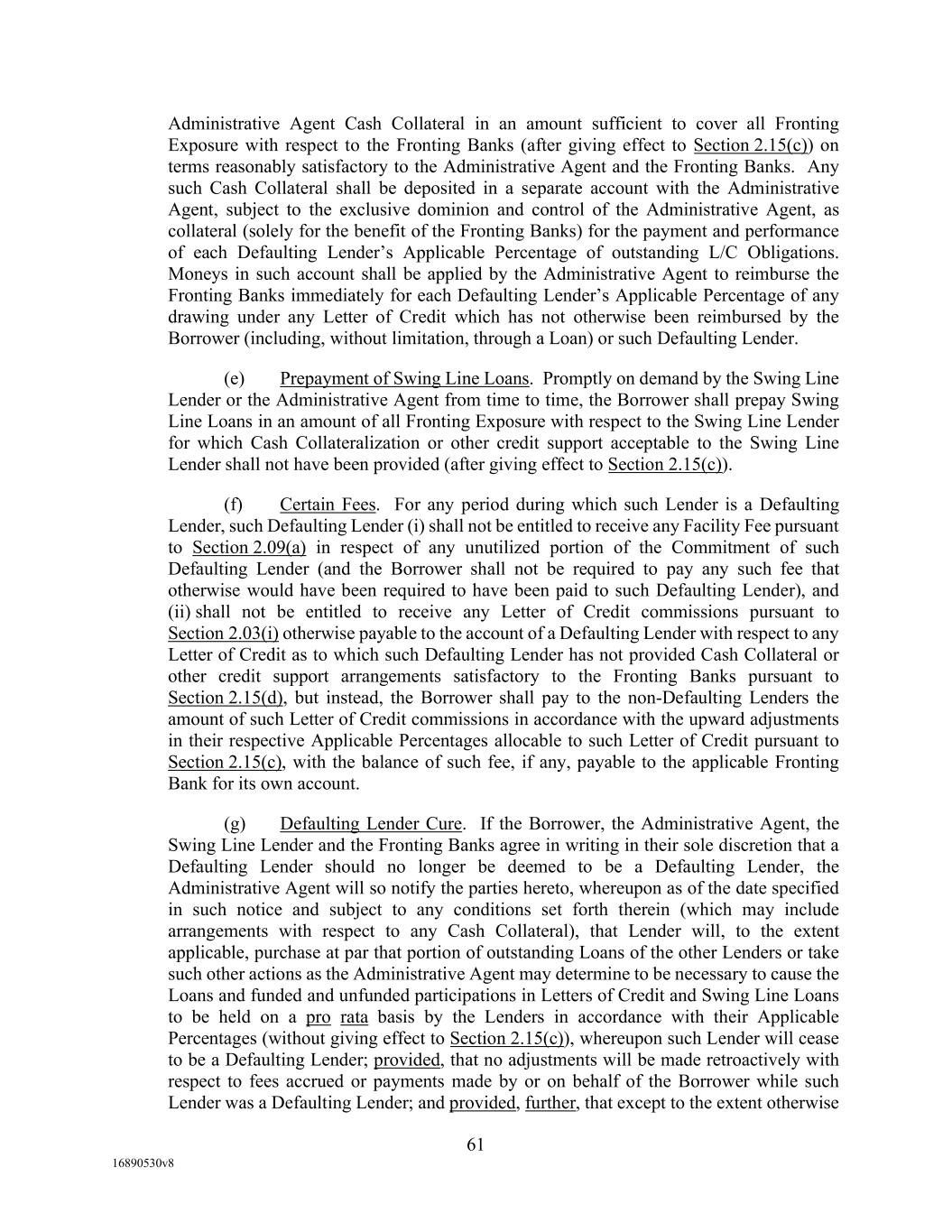 16890530v8 61 Administrative Agent Cash Collateral in an amount sufficient to cover all Fronting Exposure with respect to the Fronting Banks (after giving effect to Section 2.15(c)) on terms reasonably satisfactory to the Administrative Agent and the Fronting Banks. Any such Cash Collateral shall be deposited in a separate account with the Administrative Agent, subject to the exclusive dominion and control of the Administrative Agent, as collateral (solely for the benefit of the Fronting Banks) for the payment and performance of each Defaulting Lender’s Applicable Percentage of outstanding L/C Obligations. Moneys in such account shall be applied by the Administrative Agent to reimburse the Fronting Banks immediately for each Defaulting Lender’s Applicable Percentage of any drawing under any Letter of Credit which has not otherwise been reimbursed by the Borrower (including, without limitation, through a Loan) or such Defaulting Lender. (e) Prepayment of Swing Line Loans. Promptly on demand by the Swing Line Lender or the Administrative Agent from time to time, the Borrower shall prepay Swing Line Loans in an amount of all Fronting Exposure with respect to the Swing Line Lender for which Cash Collateralization or other credit support acceptable to the Swing Line Lender shall not have been provided (after giving effect to Section 2.15(c)). (f) Certain Fees. For any period during which such Lender is a Defaulting Lender, such Defaulting Lender (i) shall not be entitled to receive any Facility Fee pursuant to Section 2.09(a) in respect of any unutilized portion of the Commitment of such Defaulting Lender (and the Borrower shall not be required to pay any such fee that otherwise would have been required to have been paid to such Defaulting Lender), and (ii) shall not be entitled to receive any Letter of Credit commissions pursuant to Section 2.03(i) otherwise payable to the account of a Defaulting Lender with respect to any Letter of Credit as to which such Defaulting Lender has not provided Cash Collateral or other credit support arrangements satisfactory to the Fronting Banks pursuant to Section 2.15(d), but instead, the Borrower shall pay to the non-Defaulting Lenders the amount of such Letter of Credit commissions in accordance with the upward adjustments in their respective Applicable Percentages allocable to such Letter of Credit pursuant to Section 2.15(c), with the balance of such fee, if any, payable to the applicable Fronting Bank for its own account. (g) Defaulting Lender Cure. If the Borrower, the Administrative Agent, the Swing Line Lender and the Fronting Banks agree in writing in their sole discretion that a Defaulting Lender should no longer be deemed to be a Defaulting Lender, the Administrative Agent will so notify the parties hereto, whereupon as of the date specified in such notice and subject to any conditions set forth therein (which may include arrangements with respect to any Cash Collateral), that Lender will, to the extent applicable, purchase at par that portion of outstanding Loans of the other Lenders or take such other actions as the Administrative Agent may determine to be necessary to cause the Loans and funded and unfunded participations in Letters of Credit and Swing Line Loans to be held on a pro rata basis by the Lenders in accordance with their Applicable Percentages (without giving effect to Section 2.15(c)), whereupon such Lender will cease to be a Defaulting Lender; provided, that no adjustments will be made retroactively with respect to fees accrued or payments made by or on behalf of the Borrower while such Lender was a Defaulting Lender; and provided, further, that except to the extent otherwise