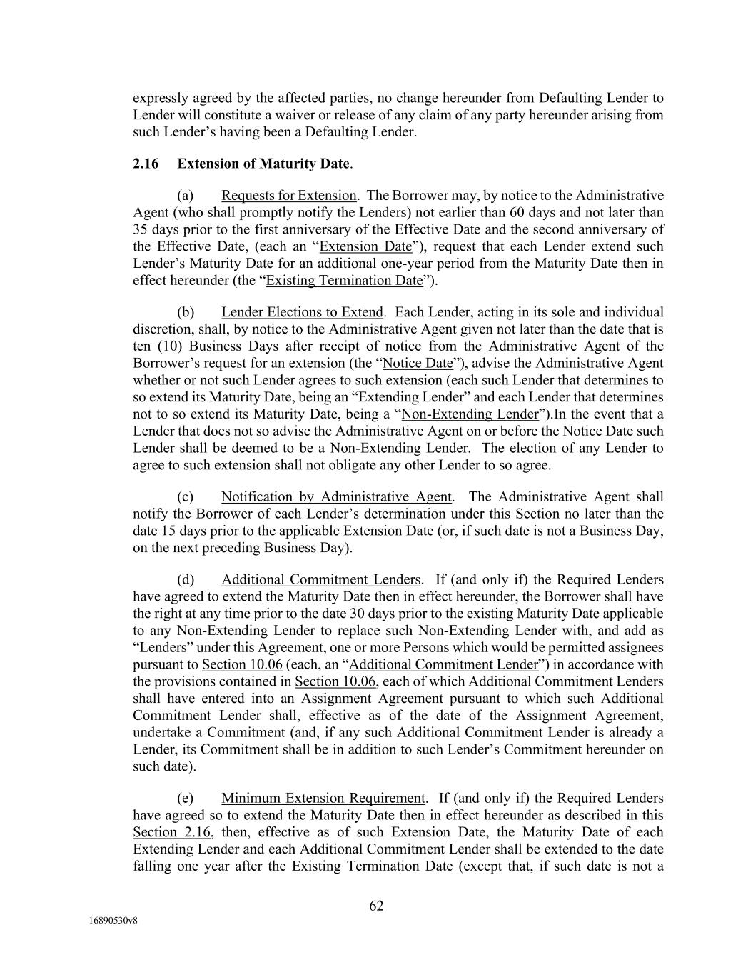 16890530v8 62 expressly agreed by the affected parties, no change hereunder from Defaulting Lender to Lender will constitute a waiver or release of any claim of any party hereunder arising from such Lender’s having been a Defaulting Lender. 2.16 Extension of Maturity Date. (a) Requests for Extension. The Borrower may, by notice to the Administrative Agent (who shall promptly notify the Lenders) not earlier than 60 days and not later than 35 days prior to the first anniversary of the Effective Date and the second anniversary of the Effective Date, (each an “Extension Date”), request that each Lender extend such Lender’s Maturity Date for an additional one-year period from the Maturity Date then in effect hereunder (the “Existing Termination Date”). (b) Lender Elections to Extend. Each Lender, acting in its sole and individual discretion, shall, by notice to the Administrative Agent given not later than the date that is ten (10) Business Days after receipt of notice from the Administrative Agent of the Borrower’s request for an extension (the “Notice Date”), advise the Administrative Agent whether or not such Lender agrees to such extension (each such Lender that determines to so extend its Maturity Date, being an “Extending Lender” and each Lender that determines not to so extend its Maturity Date, being a “Non-Extending Lender”).In the event that a Lender that does not so advise the Administrative Agent on or before the Notice Date such Lender shall be deemed to be a Non-Extending Lender. The election of any Lender to agree to such extension shall not obligate any other Lender to so agree. (c) Notification by Administrative Agent. The Administrative Agent shall notify the Borrower of each Lender’s determination under this Section no later than the date 15 days prior to the applicable Extension Date (or, if such date is not a Business Day, on the next preceding Business Day). (d) Additional Commitment Lenders. If (and only if) the Required Lenders have agreed to extend the Maturity Date then in effect hereunder, the Borrower shall have the right at any time prior to the date 30 days prior to the existing Maturity Date applicable to any Non-Extending Lender to replace such Non-Extending Lender with, and add as “Lenders” under this Agreement, one or more Persons which would be permitted assignees pursuant to Section 10.06 (each, an “Additional Commitment Lender”) in accordance with the provisions contained in Section 10.06, each of which Additional Commitment Lenders shall have entered into an Assignment Agreement pursuant to which such Additional Commitment Lender shall, effective as of the date of the Assignment Agreement, undertake a Commitment (and, if any such Additional Commitment Lender is already a Lender, its Commitment shall be in addition to such Lender’s Commitment hereunder on such date). (e) Minimum Extension Requirement. If (and only if) the Required Lenders have agreed so to extend the Maturity Date then in effect hereunder as described in this Section 2.16, then, effective as of such Extension Date, the Maturity Date of each Extending Lender and each Additional Commitment Lender shall be extended to the date falling one year after the Existing Termination Date (except that, if such date is not a