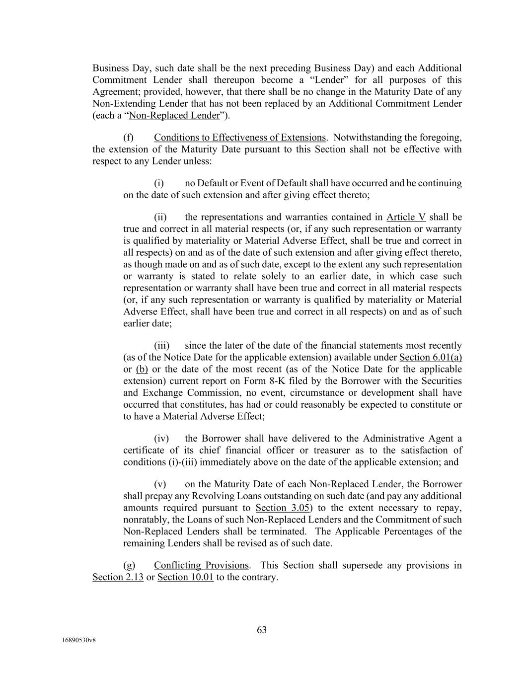 16890530v8 63 Business Day, such date shall be the next preceding Business Day) and each Additional Commitment Lender shall thereupon become a “Lender” for all purposes of this Agreement; provided, however, that there shall be no change in the Maturity Date of any Non-Extending Lender that has not been replaced by an Additional Commitment Lender (each a “Non-Replaced Lender”). (f) Conditions to Effectiveness of Extensions. Notwithstanding the foregoing, the extension of the Maturity Date pursuant to this Section shall not be effective with respect to any Lender unless: (i) no Default or Event of Default shall have occurred and be continuing on the date of such extension and after giving effect thereto; (ii) the representations and warranties contained in Article V shall be true and correct in all material respects (or, if any such representation or warranty is qualified by materiality or Material Adverse Effect, shall be true and correct in all respects) on and as of the date of such extension and after giving effect thereto, as though made on and as of such date, except to the extent any such representation or warranty is stated to relate solely to an earlier date, in which case such representation or warranty shall have been true and correct in all material respects (or, if any such representation or warranty is qualified by materiality or Material Adverse Effect, shall have been true and correct in all respects) on and as of such earlier date; (iii) since the later of the date of the financial statements most recently (as of the Notice Date for the applicable extension) available under Section 6.01(a) or (b) or the date of the most recent (as of the Notice Date for the applicable extension) current report on Form 8-K filed by the Borrower with the Securities and Exchange Commission, no event, circumstance or development shall have occurred that constitutes, has had or could reasonably be expected to constitute or to have a Material Adverse Effect; (iv) the Borrower shall have delivered to the Administrative Agent a certificate of its chief financial officer or treasurer as to the satisfaction of conditions (i)-(iii) immediately above on the date of the applicable extension; and (v) on the Maturity Date of each Non-Replaced Lender, the Borrower shall prepay any Revolving Loans outstanding on such date (and pay any additional amounts required pursuant to Section 3.05) to the extent necessary to repay, nonratably, the Loans of such Non-Replaced Lenders and the Commitment of such Non-Replaced Lenders shall be terminated. The Applicable Percentages of the remaining Lenders shall be revised as of such date. (g) Conflicting Provisions. This Section shall supersede any provisions in Section 2.13 or Section 10.01 to the contrary.