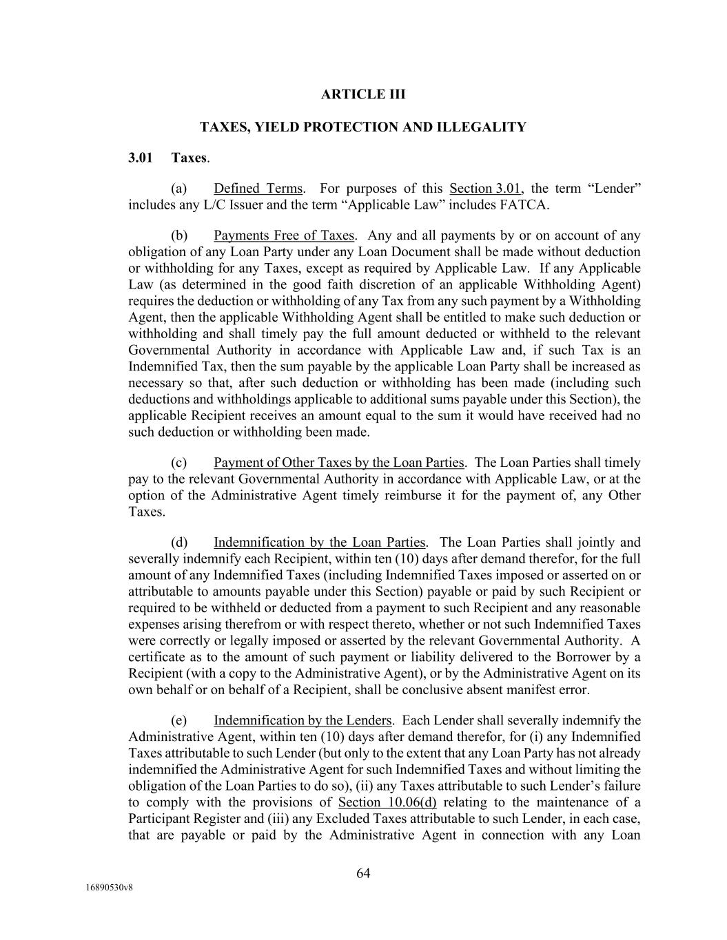 16890530v8 64 ARTICLE III TAXES, YIELD PROTECTION AND ILLEGALITY 3.01 Taxes. (a) Defined Terms. For purposes of this Section 3.01, the term “Lender” includes any L/C Issuer and the term “Applicable Law” includes FATCA. (b) Payments Free of Taxes. Any and all payments by or on account of any obligation of any Loan Party under any Loan Document shall be made without deduction or withholding for any Taxes, except as required by Applicable Law. If any Applicable Law (as determined in the good faith discretion of an applicable Withholding Agent) requires the deduction or withholding of any Tax from any such payment by a Withholding Agent, then the applicable Withholding Agent shall be entitled to make such deduction or withholding and shall timely pay the full amount deducted or withheld to the relevant Governmental Authority in accordance with Applicable Law and, if such Tax is an Indemnified Tax, then the sum payable by the applicable Loan Party shall be increased as necessary so that, after such deduction or withholding has been made (including such deductions and withholdings applicable to additional sums payable under this Section), the applicable Recipient receives an amount equal to the sum it would have received had no such deduction or withholding been made. (c) Payment of Other Taxes by the Loan Parties. The Loan Parties shall timely pay to the relevant Governmental Authority in accordance with Applicable Law, or at the option of the Administrative Agent timely reimburse it for the payment of, any Other Taxes. (d) Indemnification by the Loan Parties. The Loan Parties shall jointly and severally indemnify each Recipient, within ten (10) days after demand therefor, for the full amount of any Indemnified Taxes (including Indemnified Taxes imposed or asserted on or attributable to amounts payable under this Section) payable or paid by such Recipient or required to be withheld or deducted from a payment to such Recipient and any reasonable expenses arising therefrom or with respect thereto, whether or not such Indemnified Taxes were correctly or legally imposed or asserted by the relevant Governmental Authority. A certificate as to the amount of such payment or liability delivered to the Borrower by a Recipient (with a copy to the Administrative Agent), or by the Administrative Agent on its own behalf or on behalf of a Recipient, shall be conclusive absent manifest error. (e) Indemnification by the Lenders. Each Lender shall severally indemnify the Administrative Agent, within ten (10) days after demand therefor, for (i) any Indemnified Taxes attributable to such Lender (but only to the extent that any Loan Party has not already indemnified the Administrative Agent for such Indemnified Taxes and without limiting the obligation of the Loan Parties to do so), (ii) any Taxes attributable to such Lender’s failure to comply with the provisions of Section 10.06(d) relating to the maintenance of a Participant Register and (iii) any Excluded Taxes attributable to such Lender, in each case, that are payable or paid by the Administrative Agent in connection with any Loan