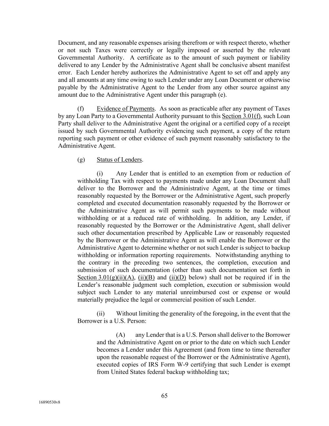 16890530v8 65 Document, and any reasonable expenses arising therefrom or with respect thereto, whether or not such Taxes were correctly or legally imposed or asserted by the relevant Governmental Authority. A certificate as to the amount of such payment or liability delivered to any Lender by the Administrative Agent shall be conclusive absent manifest error. Each Lender hereby authorizes the Administrative Agent to set off and apply any and all amounts at any time owing to such Lender under any Loan Document or otherwise payable by the Administrative Agent to the Lender from any other source against any amount due to the Administrative Agent under this paragraph (e). (f) Evidence of Payments. As soon as practicable after any payment of Taxes by any Loan Party to a Governmental Authority pursuant to this Section 3.01(f), such Loan Party shall deliver to the Administrative Agent the original or a certified copy of a receipt issued by such Governmental Authority evidencing such payment, a copy of the return reporting such payment or other evidence of such payment reasonably satisfactory to the Administrative Agent. (g) Status of Lenders. (i) Any Lender that is entitled to an exemption from or reduction of withholding Tax with respect to payments made under any Loan Document shall deliver to the Borrower and the Administrative Agent, at the time or times reasonably requested by the Borrower or the Administrative Agent, such properly completed and executed documentation reasonably requested by the Borrower or the Administrative Agent as will permit such payments to be made without withholding or at a reduced rate of withholding. In addition, any Lender, if reasonably requested by the Borrower or the Administrative Agent, shall deliver such other documentation prescribed by Applicable Law or reasonably requested by the Borrower or the Administrative Agent as will enable the Borrower or the Administrative Agent to determine whether or not such Lender is subject to backup withholding or information reporting requirements. Notwithstanding anything to the contrary in the preceding two sentences, the completion, execution and submission of such documentation (other than such documentation set forth in Section 3.01(g)(ii)(A), (ii)(B) and (ii)(D) below) shall not be required if in the Lender’s reasonable judgment such completion, execution or submission would subject such Lender to any material unreimbursed cost or expense or would materially prejudice the legal or commercial position of such Lender. (ii) Without limiting the generality of the foregoing, in the event that the Borrower is a U.S. Person: (A) any Lender that is a U.S. Person shall deliver to the Borrower and the Administrative Agent on or prior to the date on which such Lender becomes a Lender under this Agreement (and from time to time thereafter upon the reasonable request of the Borrower or the Administrative Agent), executed copies of IRS Form W-9 certifying that such Lender is exempt from United States federal backup withholding tax;