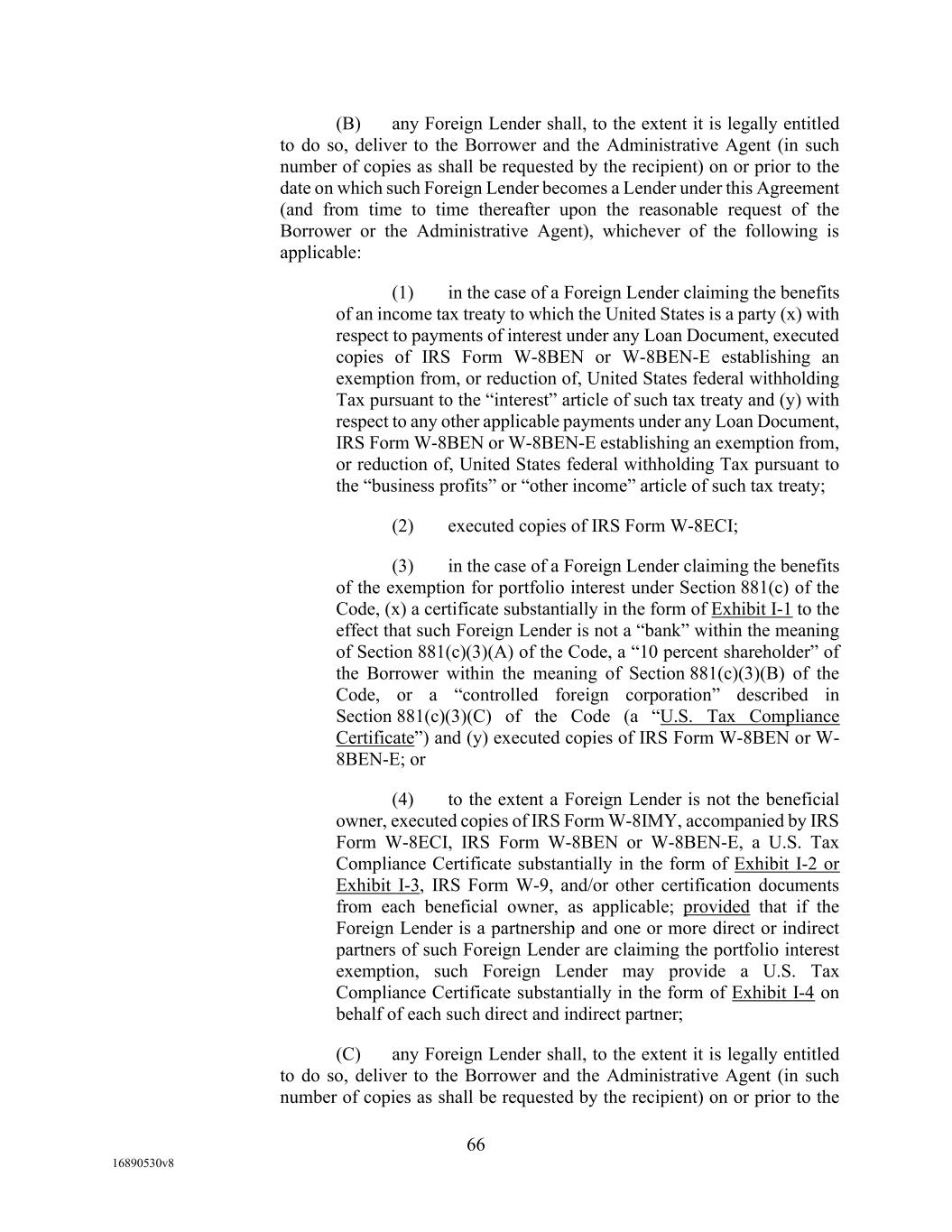 16890530v8 66 (B) any Foreign Lender shall, to the extent it is legally entitled to do so, deliver to the Borrower and the Administrative Agent (in such number of copies as shall be requested by the recipient) on or prior to the date on which such Foreign Lender becomes a Lender under this Agreement (and from time to time thereafter upon the reasonable request of the Borrower or the Administrative Agent), whichever of the following is applicable: (1) in the case of a Foreign Lender claiming the benefits of an income tax treaty to which the United States is a party (x) with respect to payments of interest under any Loan Document, executed copies of IRS Form W-8BEN or W-8BEN-E establishing an exemption from, or reduction of, United States federal withholding Tax pursuant to the “interest” article of such tax treaty and (y) with respect to any other applicable payments under any Loan Document, IRS Form W-8BEN or W-8BEN-E establishing an exemption from, or reduction of, United States federal withholding Tax pursuant to the “business profits” or “other income” article of such tax treaty; (2) executed copies of IRS Form W-8ECI; (3) in the case of a Foreign Lender claiming the benefits of the exemption for portfolio interest under Section 881(c) of the Code, (x) a certificate substantially in the form of Exhibit I-1 to the effect that such Foreign Lender is not a “bank” within the meaning of Section 881(c)(3)(A) of the Code, a “10 percent shareholder” of the Borrower within the meaning of Section 881(c)(3)(B) of the Code, or a “controlled foreign corporation” described in Section 881(c)(3)(C) of the Code (a “U.S. Tax Compliance Certificate”) and (y) executed copies of IRS Form W-8BEN or W- 8BEN-E; or (4) to the extent a Foreign Lender is not the beneficial owner, executed copies of IRS Form W-8IMY, accompanied by IRS Form W-8ECI, IRS Form W-8BEN or W-8BEN-E, a U.S. Tax Compliance Certificate substantially in the form of Exhibit I-2 or Exhibit I-3, IRS Form W-9, and/or other certification documents from each beneficial owner, as applicable; provided that if the Foreign Lender is a partnership and one or more direct or indirect partners of such Foreign Lender are claiming the portfolio interest exemption, such Foreign Lender may provide a U.S. Tax Compliance Certificate substantially in the form of Exhibit I-4 on behalf of each such direct and indirect partner; (C) any Foreign Lender shall, to the extent it is legally entitled to do so, deliver to the Borrower and the Administrative Agent (in such number of copies as shall be requested by the recipient) on or prior to the