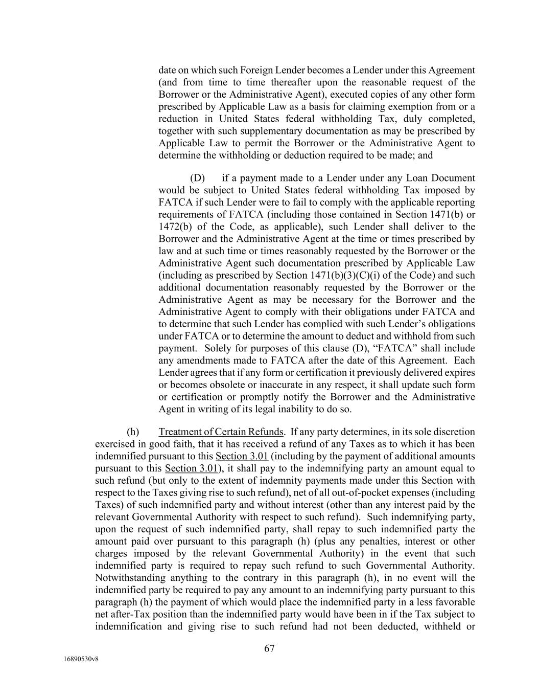16890530v8 67 date on which such Foreign Lender becomes a Lender under this Agreement (and from time to time thereafter upon the reasonable request of the Borrower or the Administrative Agent), executed copies of any other form prescribed by Applicable Law as a basis for claiming exemption from or a reduction in United States federal withholding Tax, duly completed, together with such supplementary documentation as may be prescribed by Applicable Law to permit the Borrower or the Administrative Agent to determine the withholding or deduction required to be made; and (D) if a payment made to a Lender under any Loan Document would be subject to United States federal withholding Tax imposed by FATCA if such Lender were to fail to comply with the applicable reporting requirements of FATCA (including those contained in Section 1471(b) or 1472(b) of the Code, as applicable), such Lender shall deliver to the Borrower and the Administrative Agent at the time or times prescribed by law and at such time or times reasonably requested by the Borrower or the Administrative Agent such documentation prescribed by Applicable Law (including as prescribed by Section 1471(b)(3)(C)(i) of the Code) and such additional documentation reasonably requested by the Borrower or the Administrative Agent as may be necessary for the Borrower and the Administrative Agent to comply with their obligations under FATCA and to determine that such Lender has complied with such Lender’s obligations under FATCA or to determine the amount to deduct and withhold from such payment. Solely for purposes of this clause (D), “FATCA” shall include any amendments made to FATCA after the date of this Agreement. Each Lender agrees that if any form or certification it previously delivered expires or becomes obsolete or inaccurate in any respect, it shall update such form or certification or promptly notify the Borrower and the Administrative Agent in writing of its legal inability to do so. (h) Treatment of Certain Refunds. If any party determines, in its sole discretion exercised in good faith, that it has received a refund of any Taxes as to which it has been indemnified pursuant to this Section 3.01 (including by the payment of additional amounts pursuant to this Section 3.01), it shall pay to the indemnifying party an amount equal to such refund (but only to the extent of indemnity payments made under this Section with respect to the Taxes giving rise to such refund), net of all out-of-pocket expenses (including Taxes) of such indemnified party and without interest (other than any interest paid by the relevant Governmental Authority with respect to such refund). Such indemnifying party, upon the request of such indemnified party, shall repay to such indemnified party the amount paid over pursuant to this paragraph (h) (plus any penalties, interest or other charges imposed by the relevant Governmental Authority) in the event that such indemnified party is required to repay such refund to such Governmental Authority. Notwithstanding anything to the contrary in this paragraph (h), in no event will the indemnified party be required to pay any amount to an indemnifying party pursuant to this paragraph (h) the payment of which would place the indemnified party in a less favorable net after-Tax position than the indemnified party would have been in if the Tax subject to indemnification and giving rise to such refund had not been deducted, withheld or