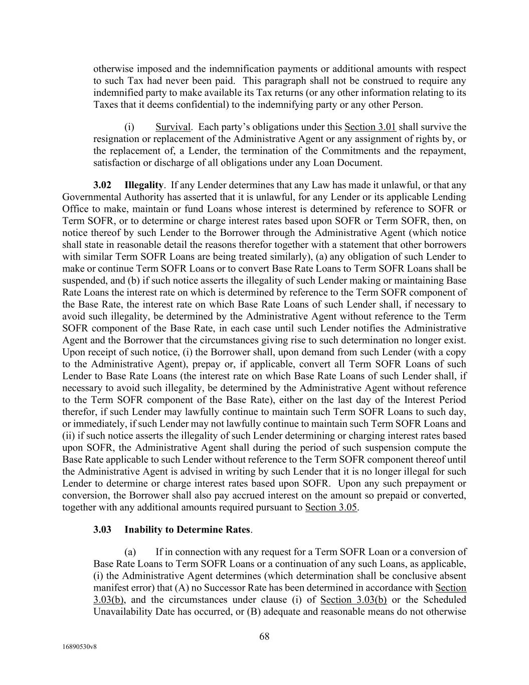 16890530v8 68 otherwise imposed and the indemnification payments or additional amounts with respect to such Tax had never been paid. This paragraph shall not be construed to require any indemnified party to make available its Tax returns (or any other information relating to its Taxes that it deems confidential) to the indemnifying party or any other Person. (i) Survival. Each party’s obligations under this Section 3.01 shall survive the resignation or replacement of the Administrative Agent or any assignment of rights by, or the replacement of, a Lender, the termination of the Commitments and the repayment, satisfaction or discharge of all obligations under any Loan Document. 3.02 Illegality. If any Lender determines that any Law has made it unlawful, or that any Governmental Authority has asserted that it is unlawful, for any Lender or its applicable Lending Office to make, maintain or fund Loans whose interest is determined by reference to SOFR or Term SOFR, or to determine or charge interest rates based upon SOFR or Term SOFR, then, on notice thereof by such Lender to the Borrower through the Administrative Agent (which notice shall state in reasonable detail the reasons therefor together with a statement that other borrowers with similar Term SOFR Loans are being treated similarly), (a) any obligation of such Lender to make or continue Term SOFR Loans or to convert Base Rate Loans to Term SOFR Loans shall be suspended, and (b) if such notice asserts the illegality of such Lender making or maintaining Base Rate Loans the interest rate on which is determined by reference to the Term SOFR component of the Base Rate, the interest rate on which Base Rate Loans of such Lender shall, if necessary to avoid such illegality, be determined by the Administrative Agent without reference to the Term SOFR component of the Base Rate, in each case until such Lender notifies the Administrative Agent and the Borrower that the circumstances giving rise to such determination no longer exist. Upon receipt of such notice, (i) the Borrower shall, upon demand from such Lender (with a copy to the Administrative Agent), prepay or, if applicable, convert all Term SOFR Loans of such Lender to Base Rate Loans (the interest rate on which Base Rate Loans of such Lender shall, if necessary to avoid such illegality, be determined by the Administrative Agent without reference to the Term SOFR component of the Base Rate), either on the last day of the Interest Period therefor, if such Lender may lawfully continue to maintain such Term SOFR Loans to such day, or immediately, if such Lender may not lawfully continue to maintain such Term SOFR Loans and (ii) if such notice asserts the illegality of such Lender determining or charging interest rates based upon SOFR, the Administrative Agent shall during the period of such suspension compute the Base Rate applicable to such Lender without reference to the Term SOFR component thereof until the Administrative Agent is advised in writing by such Lender that it is no longer illegal for such Lender to determine or charge interest rates based upon SOFR. Upon any such prepayment or conversion, the Borrower shall also pay accrued interest on the amount so prepaid or converted, together with any additional amounts required pursuant to Section 3.05. 3.03 Inability to Determine Rates. (a) If in connection with any request for a Term SOFR Loan or a conversion of Base Rate Loans to Term SOFR Loans or a continuation of any such Loans, as applicable, (i) the Administrative Agent determines (which determination shall be conclusive absent manifest error) that (A) no Successor Rate has been determined in accordance with Section 3.03(b), and the circumstances under clause (i) of Section 3.03(b) or the Scheduled Unavailability Date has occurred, or (B) adequate and reasonable means do not otherwise