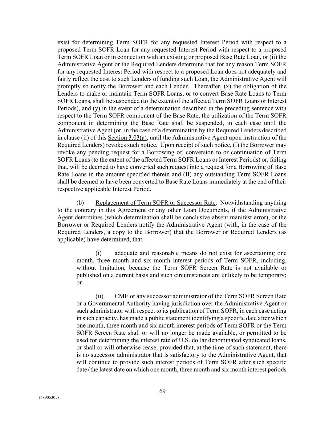 16890530v8 69 exist for determining Term SOFR for any requested Interest Period with respect to a proposed Term SOFR Loan for any requested Interest Period with respect to a proposed Term SOFR Loan or in connection with an existing or proposed Base Rate Loan, or (ii) the Administrative Agent or the Required Lenders determine that for any reason Term SOFR for any requested Interest Period with respect to a proposed Loan does not adequately and fairly reflect the cost to such Lenders of funding such Loan, the Administrative Agent will promptly so notify the Borrower and each Lender. Thereafter, (x) the obligation of the Lenders to make or maintain Term SOFR Loans, or to convert Base Rate Loans to Term SOFR Loans, shall be suspended (to the extent of the affected Term SOFR Loans or Interest Periods), and (y) in the event of a determination described in the preceding sentence with respect to the Term SOFR component of the Base Rate, the utilization of the Term SOFR component in determining the Base Rate shall be suspended, in each case until the Administrative Agent (or, in the case of a determination by the Required Lenders described in clause (ii) of this Section 3.03(a), until the Administrative Agent upon instruction of the Required Lenders) revokes such notice. Upon receipt of such notice, (I) the Borrower may revoke any pending request for a Borrowing of, conversion to or continuation of Term SOFR Loans (to the extent of the affected Term SOFR Loans or Interest Periods) or, failing that, will be deemed to have converted such request into a request for a Borrowing of Base Rate Loans in the amount specified therein and (II) any outstanding Term SOFR Loans shall be deemed to have been converted to Base Rate Loans immediately at the end of their respective applicable Interest Period. (b) Replacement of Term SOFR or Successor Rate. Notwithstanding anything to the contrary in this Agreement or any other Loan Documents, if the Administrative Agent determines (which determination shall be conclusive absent manifest error), or the Borrower or Required Lenders notify the Administrative Agent (with, in the case of the Required Lenders, a copy to the Borrower) that the Borrower or Required Lenders (as applicable) have determined, that: (i) adequate and reasonable means do not exist for ascertaining one month, three month and six month interest periods of Term SOFR, including, without limitation, because the Term SOFR Screen Rate is not available or published on a current basis and such circumstances are unlikely to be temporary; or (ii) CME or any successor administrator of the Term SOFR Screen Rate or a Governmental Authority having jurisdiction over the Administrative Agent or such administrator with respect to its publication of Term SOFR, in each case acting in such capacity, has made a public statement identifying a specific date after which one month, three month and six month interest periods of Term SOFR or the Term SOFR Screen Rate shall or will no longer be made available, or permitted to be used for determining the interest rate of U.S. dollar denominated syndicated loans, or shall or will otherwise cease, provided that, at the time of such statement, there is no successor administrator that is satisfactory to the Administrative Agent, that will continue to provide such interest periods of Term SOFR after such specific date (the latest date on which one month, three month and six month interest periods