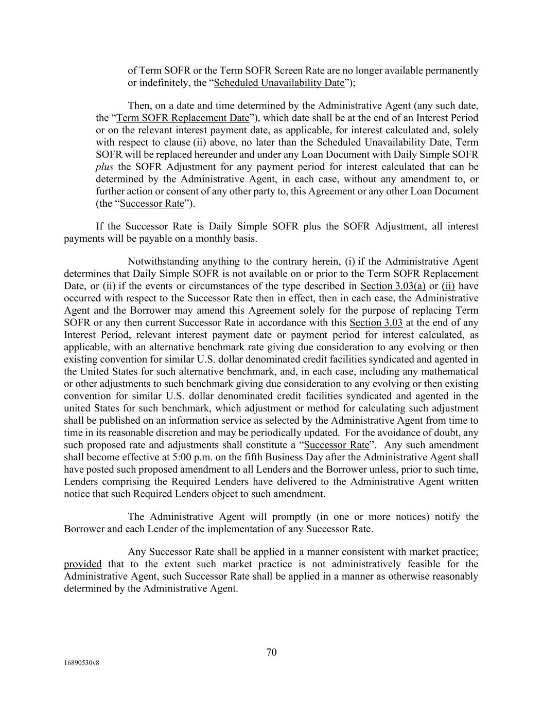 16890530v8 70 of Term SOFR or the Term SOFR Screen Rate are no longer available permanently or indefinitely, the “Scheduled Unavailability Date”); Then, on a date and time determined by the Administrative Agent (any such date, the “Term SOFR Replacement Date”), which date shall be at the end of an Interest Period or on the relevant interest payment date, as applicable, for interest calculated and, solely with respect to clause (ii) above, no later than the Scheduled Unavailability Date, Term SOFR will be replaced hereunder and under any Loan Document with Daily Simple SOFR plus the SOFR Adjustment for any payment period for interest calculated that can be determined by the Administrative Agent, in each case, without any amendment to, or further action or consent of any other party to, this Agreement or any other Loan Document (the “Successor Rate”). If the Successor Rate is Daily Simple SOFR plus the SOFR Adjustment, all interest payments will be payable on a monthly basis. Notwithstanding anything to the contrary herein, (i) if the Administrative Agent determines that Daily Simple SOFR is not available on or prior to the Term SOFR Replacement Date, or (ii) if the events or circumstances of the type described in Section 3.03(a) or (ii) have occurred with respect to the Successor Rate then in effect, then in each case, the Administrative Agent and the Borrower may amend this Agreement solely for the purpose of replacing Term SOFR or any then current Successor Rate in accordance with this Section 3.03 at the end of any Interest Period, relevant interest payment date or payment period for interest calculated, as applicable, with an alternative benchmark rate giving due consideration to any evolving or then existing convention for similar U.S. dollar denominated credit facilities syndicated and agented in the United States for such alternative benchmark, and, in each case, including any mathematical or other adjustments to such benchmark giving due consideration to any evolving or then existing convention for similar U.S. dollar denominated credit facilities syndicated and agented in the united States for such benchmark, which adjustment or method for calculating such adjustment shall be published on an information service as selected by the Administrative Agent from time to time in its reasonable discretion and may be periodically updated. For the avoidance of doubt, any such proposed rate and adjustments shall constitute a “Successor Rate”. Any such amendment shall become effective at 5:00 p.m. on the fifth Business Day after the Administrative Agent shall have posted such proposed amendment to all Lenders and the Borrower unless, prior to such time, Lenders comprising the Required Lenders have delivered to the Administrative Agent written notice that such Required Lenders object to such amendment. The Administrative Agent will promptly (in one or more notices) notify the Borrower and each Lender of the implementation of any Successor Rate. Any Successor Rate shall be applied in a manner consistent with market practice; provided that to the extent such market practice is not administratively feasible for the Administrative Agent, such Successor Rate shall be applied in a manner as otherwise reasonably determined by the Administrative Agent.