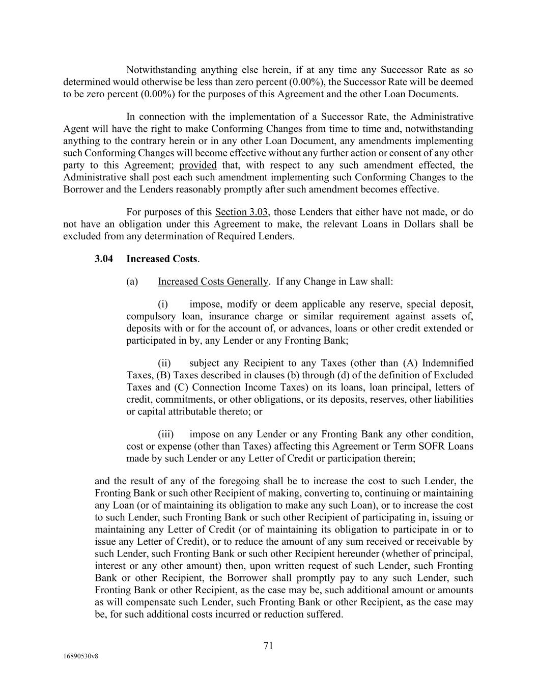 16890530v8 71 Notwithstanding anything else herein, if at any time any Successor Rate as so determined would otherwise be less than zero percent (0.00%), the Successor Rate will be deemed to be zero percent (0.00%) for the purposes of this Agreement and the other Loan Documents. In connection with the implementation of a Successor Rate, the Administrative Agent will have the right to make Conforming Changes from time to time and, notwithstanding anything to the contrary herein or in any other Loan Document, any amendments implementing such Conforming Changes will become effective without any further action or consent of any other party to this Agreement; provided that, with respect to any such amendment effected, the Administrative shall post each such amendment implementing such Conforming Changes to the Borrower and the Lenders reasonably promptly after such amendment becomes effective. For purposes of this Section 3.03, those Lenders that either have not made, or do not have an obligation under this Agreement to make, the relevant Loans in Dollars shall be excluded from any determination of Required Lenders. 3.04 Increased Costs. (a) Increased Costs Generally. If any Change in Law shall: (i) impose, modify or deem applicable any reserve, special deposit, compulsory loan, insurance charge or similar requirement against assets of, deposits with or for the account of, or advances, loans or other credit extended or participated in by, any Lender or any Fronting Bank; (ii) subject any Recipient to any Taxes (other than (A) Indemnified Taxes, (B) Taxes described in clauses (b) through (d) of the definition of Excluded Taxes and (C) Connection Income Taxes) on its loans, loan principal, letters of credit, commitments, or other obligations, or its deposits, reserves, other liabilities or capital attributable thereto; or (iii) impose on any Lender or any Fronting Bank any other condition, cost or expense (other than Taxes) affecting this Agreement or Term SOFR Loans made by such Lender or any Letter of Credit or participation therein; and the result of any of the foregoing shall be to increase the cost to such Lender, the Fronting Bank or such other Recipient of making, converting to, continuing or maintaining any Loan (or of maintaining its obligation to make any such Loan), or to increase the cost to such Lender, such Fronting Bank or such other Recipient of participating in, issuing or maintaining any Letter of Credit (or of maintaining its obligation to participate in or to issue any Letter of Credit), or to reduce the amount of any sum received or receivable by such Lender, such Fronting Bank or such other Recipient hereunder (whether of principal, interest or any other amount) then, upon written request of such Lender, such Fronting Bank or other Recipient, the Borrower shall promptly pay to any such Lender, such Fronting Bank or other Recipient, as the case may be, such additional amount or amounts as will compensate such Lender, such Fronting Bank or other Recipient, as the case may be, for such additional costs incurred or reduction suffered.