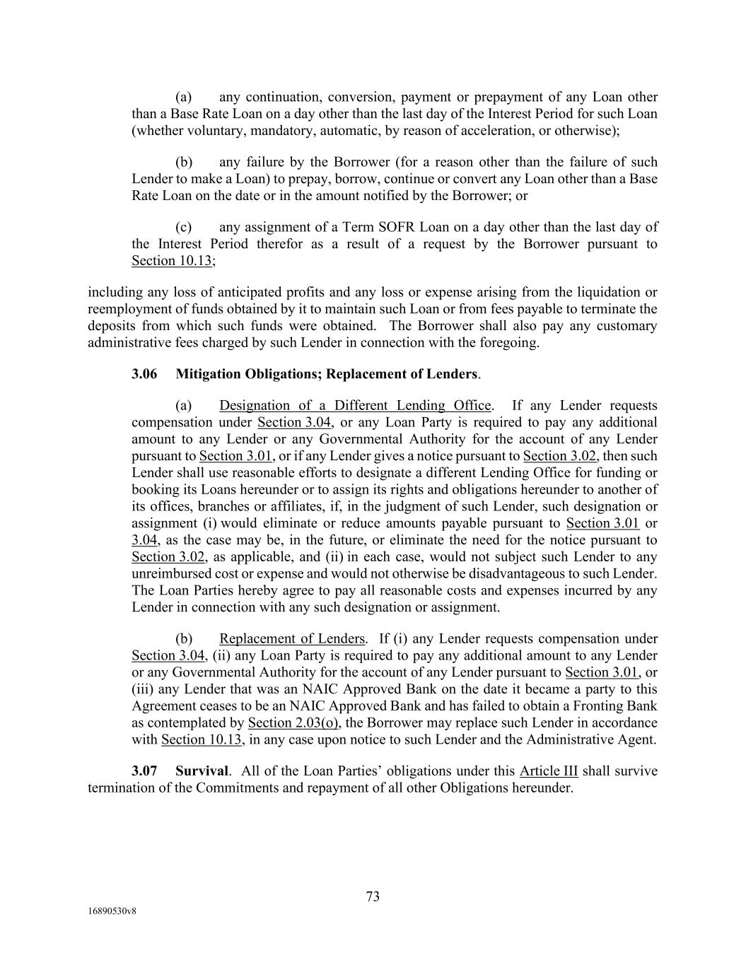 16890530v8 73 (a) any continuation, conversion, payment or prepayment of any Loan other than a Base Rate Loan on a day other than the last day of the Interest Period for such Loan (whether voluntary, mandatory, automatic, by reason of acceleration, or otherwise); (b) any failure by the Borrower (for a reason other than the failure of such Lender to make a Loan) to prepay, borrow, continue or convert any Loan other than a Base Rate Loan on the date or in the amount notified by the Borrower; or (c) any assignment of a Term SOFR Loan on a day other than the last day of the Interest Period therefor as a result of a request by the Borrower pursuant to Section 10.13; including any loss of anticipated profits and any loss or expense arising from the liquidation or reemployment of funds obtained by it to maintain such Loan or from fees payable to terminate the deposits from which such funds were obtained. The Borrower shall also pay any customary administrative fees charged by such Lender in connection with the foregoing. 3.06 Mitigation Obligations; Replacement of Lenders. (a) Designation of a Different Lending Office. If any Lender requests compensation under Section 3.04, or any Loan Party is required to pay any additional amount to any Lender or any Governmental Authority for the account of any Lender pursuant to Section 3.01, or if any Lender gives a notice pursuant to Section 3.02, then such Lender shall use reasonable efforts to designate a different Lending Office for funding or booking its Loans hereunder or to assign its rights and obligations hereunder to another of its offices, branches or affiliates, if, in the judgment of such Lender, such designation or assignment (i) would eliminate or reduce amounts payable pursuant to Section 3.01 or 3.04, as the case may be, in the future, or eliminate the need for the notice pursuant to Section 3.02, as applicable, and (ii) in each case, would not subject such Lender to any unreimbursed cost or expense and would not otherwise be disadvantageous to such Lender. The Loan Parties hereby agree to pay all reasonable costs and expenses incurred by any Lender in connection with any such designation or assignment. (b) Replacement of Lenders. If (i) any Lender requests compensation under Section 3.04, (ii) any Loan Party is required to pay any additional amount to any Lender or any Governmental Authority for the account of any Lender pursuant to Section 3.01, or (iii) any Lender that was an NAIC Approved Bank on the date it became a party to this Agreement ceases to be an NAIC Approved Bank and has failed to obtain a Fronting Bank as contemplated by Section 2.03(o), the Borrower may replace such Lender in accordance with Section 10.13, in any case upon notice to such Lender and the Administrative Agent. 3.07 Survival. All of the Loan Parties’ obligations under this Article III shall survive termination of the Commitments and repayment of all other Obligations hereunder.